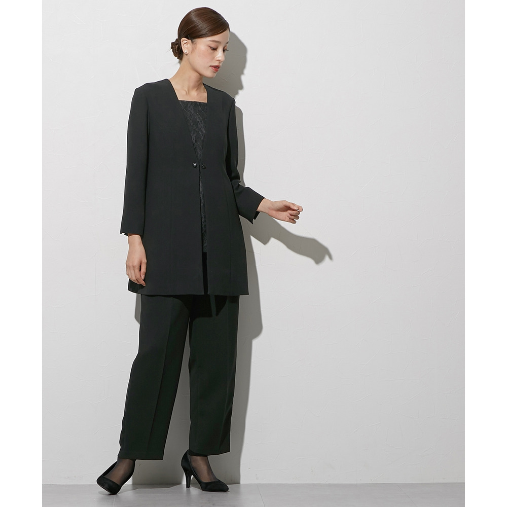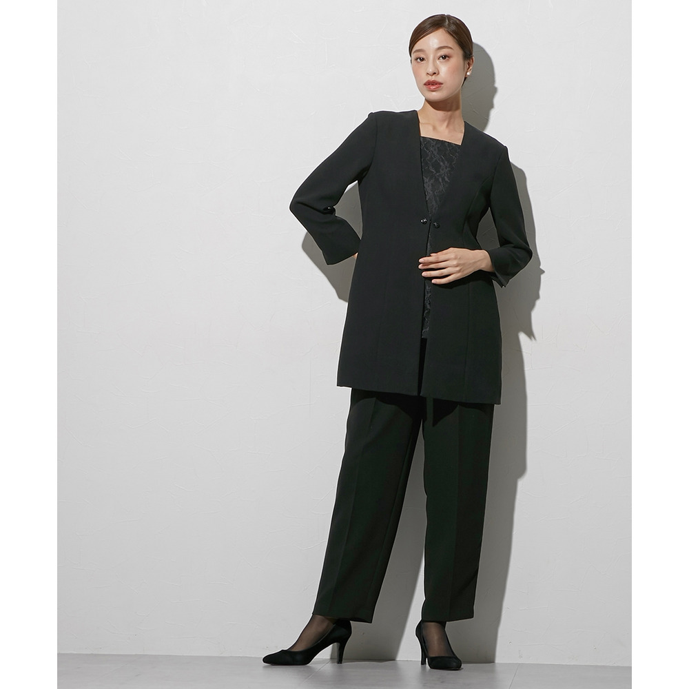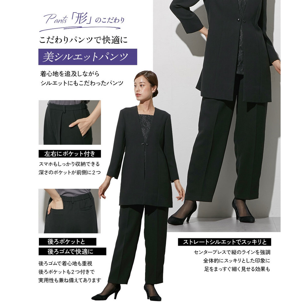喪服としてだけでなく、結婚式・参観日・卒業式などすべてのフォーマルシーンに対応できるパンツスーツです