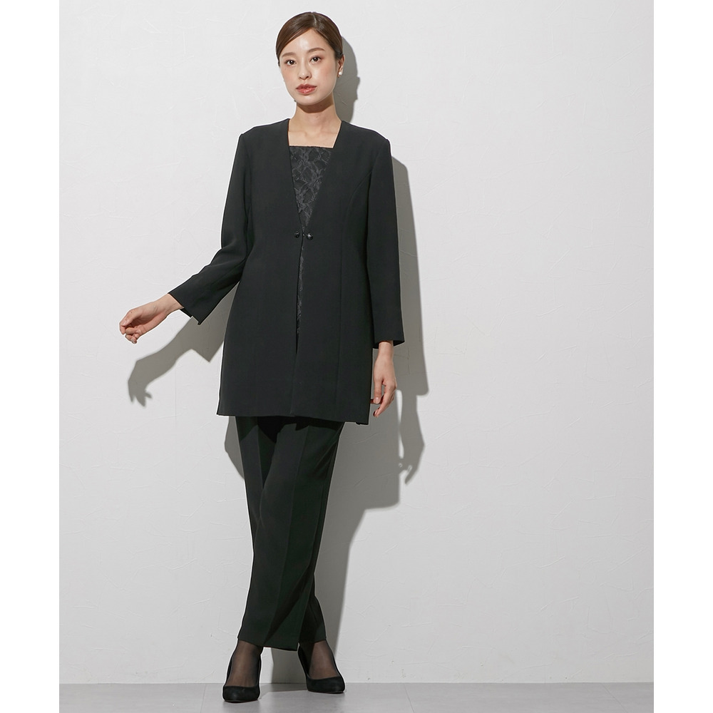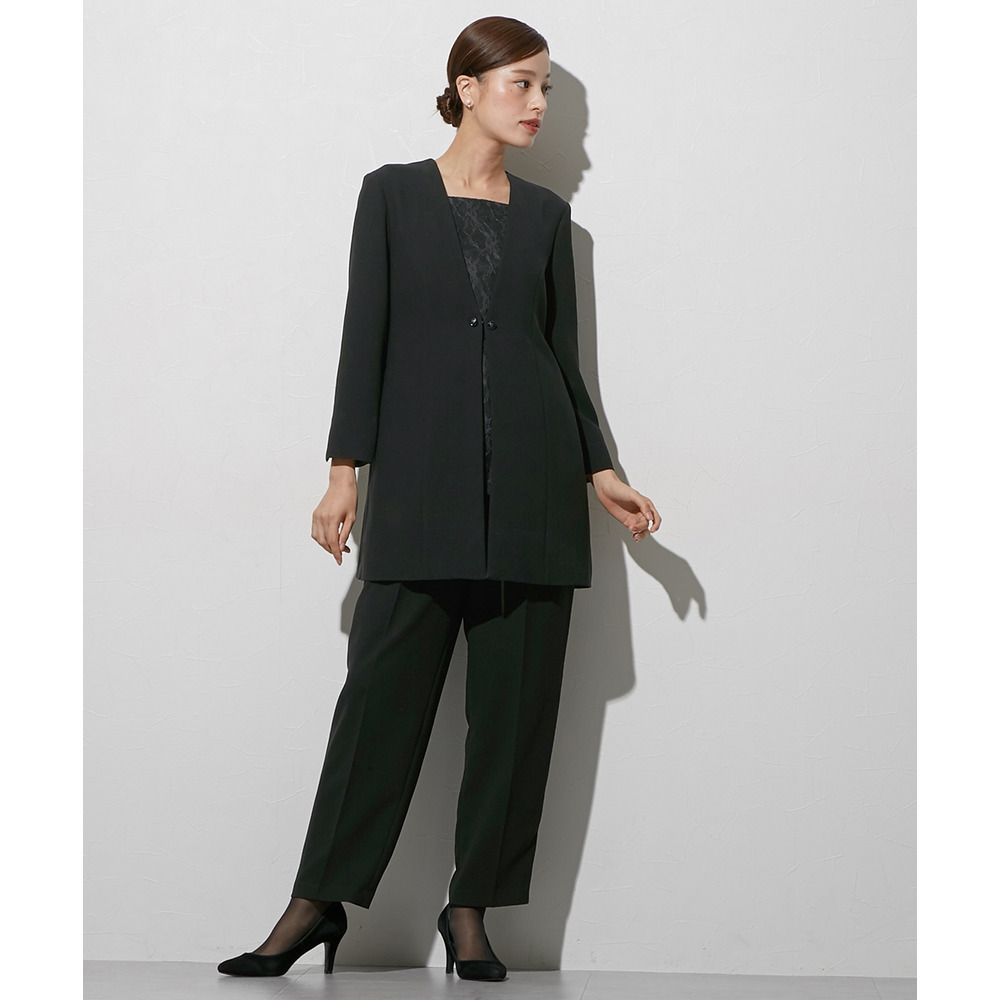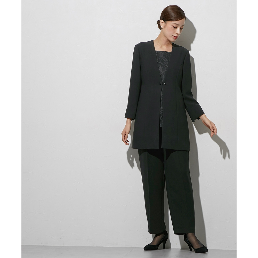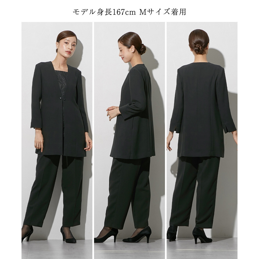 喪服としてだけでなく、結婚式・参観日・卒業式などすべてのフォーマルシーンに対応できるパンツスーツです