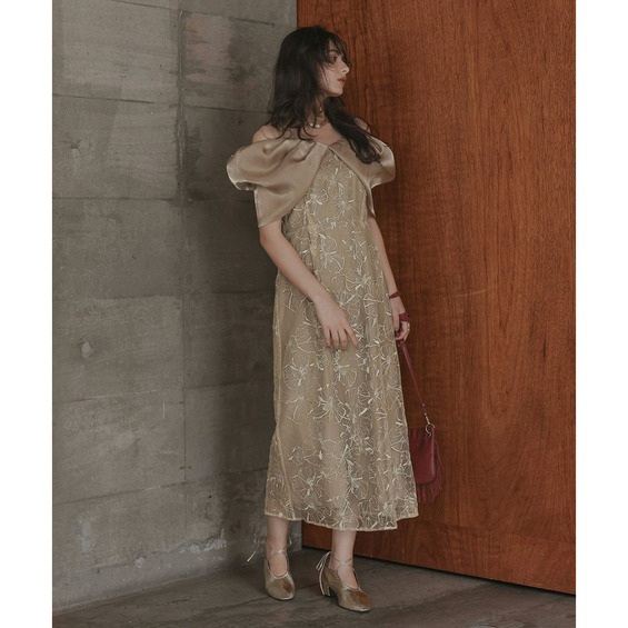 【お呼ばれ・よそいき・結婚式・パーティー・オケージョンドレス】メタリックボイルオーガンジーオフショルダーデザイン刺繍ワンピースドレス 大きいサイズ Callarus