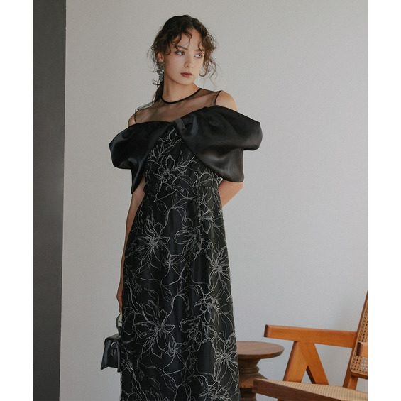 大胆なオフショルダーデザインで、オケージョンシーンに映える華やかさを演出
