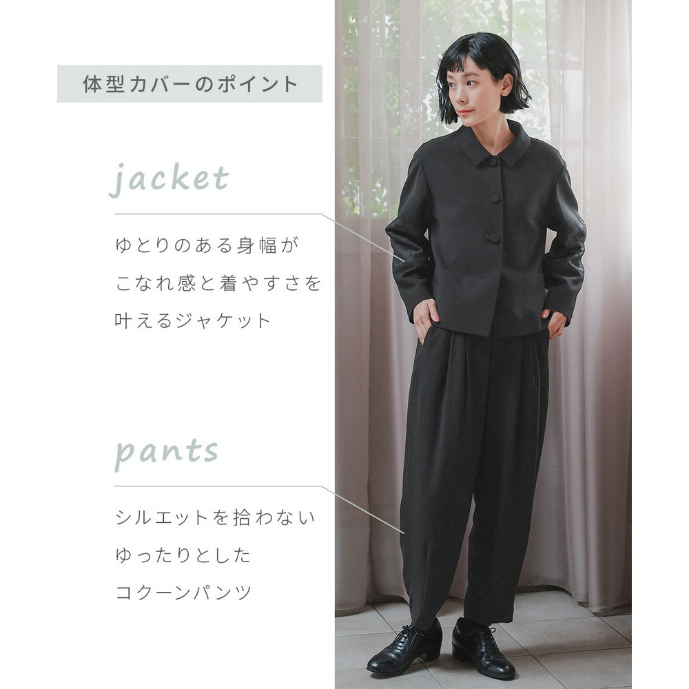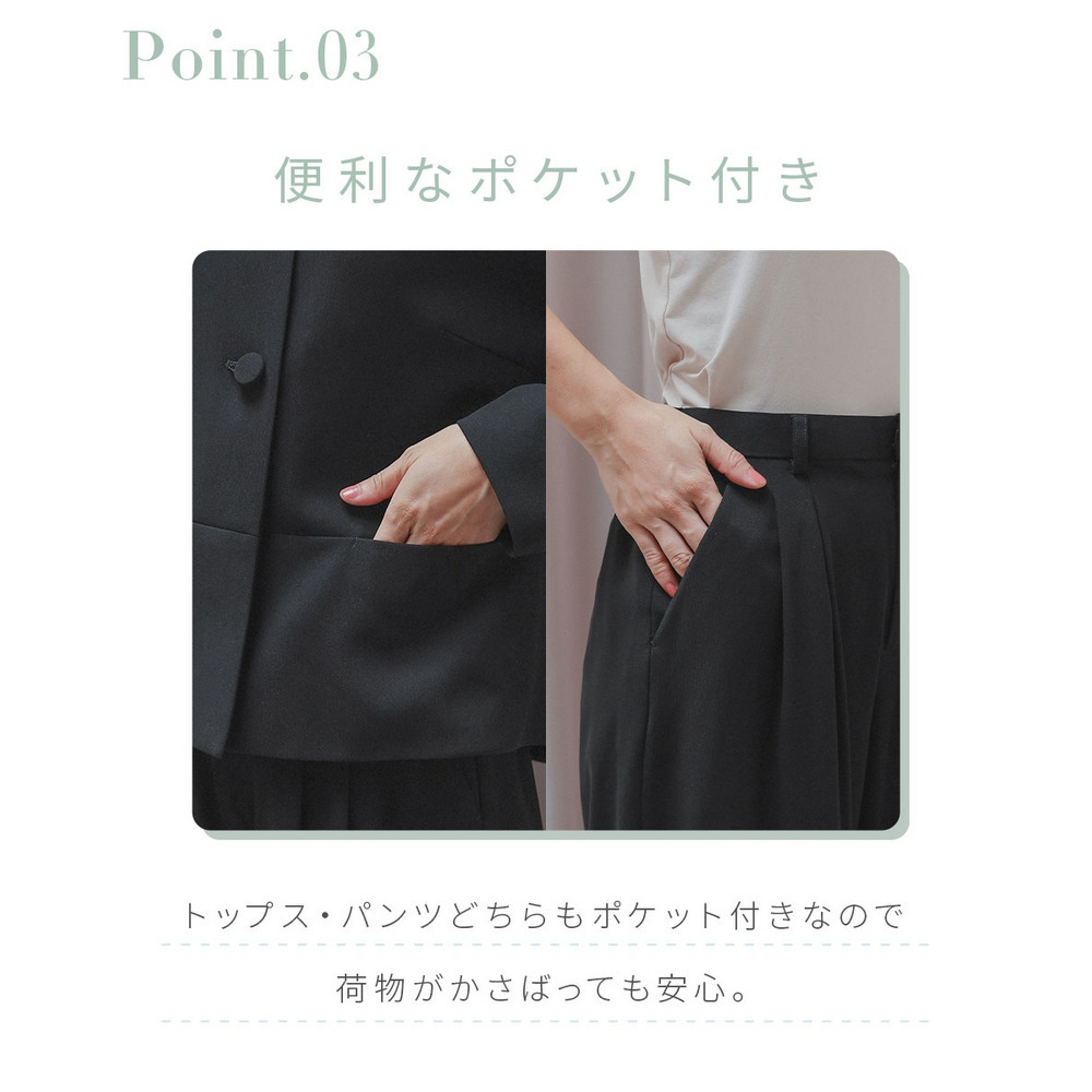 喪服としてだけでなく、結婚式・参観日・卒業式などすべてのフォーマルシーンに対応できるパンツスーツです