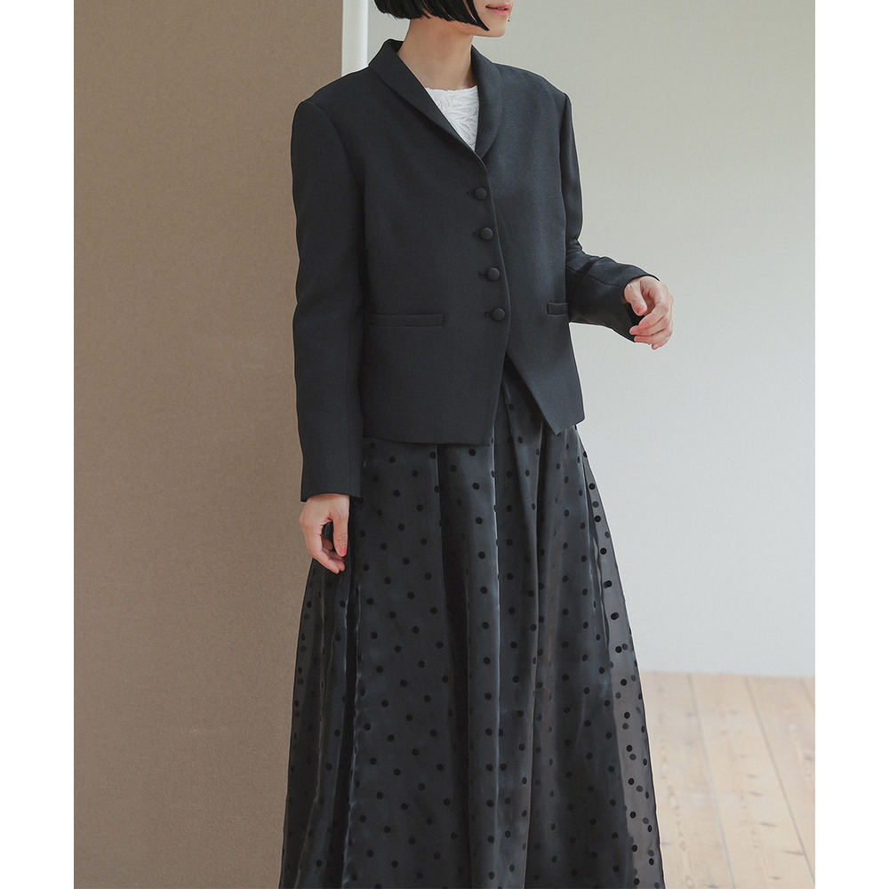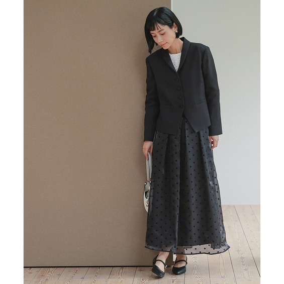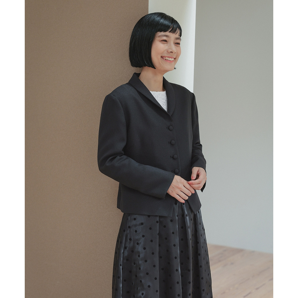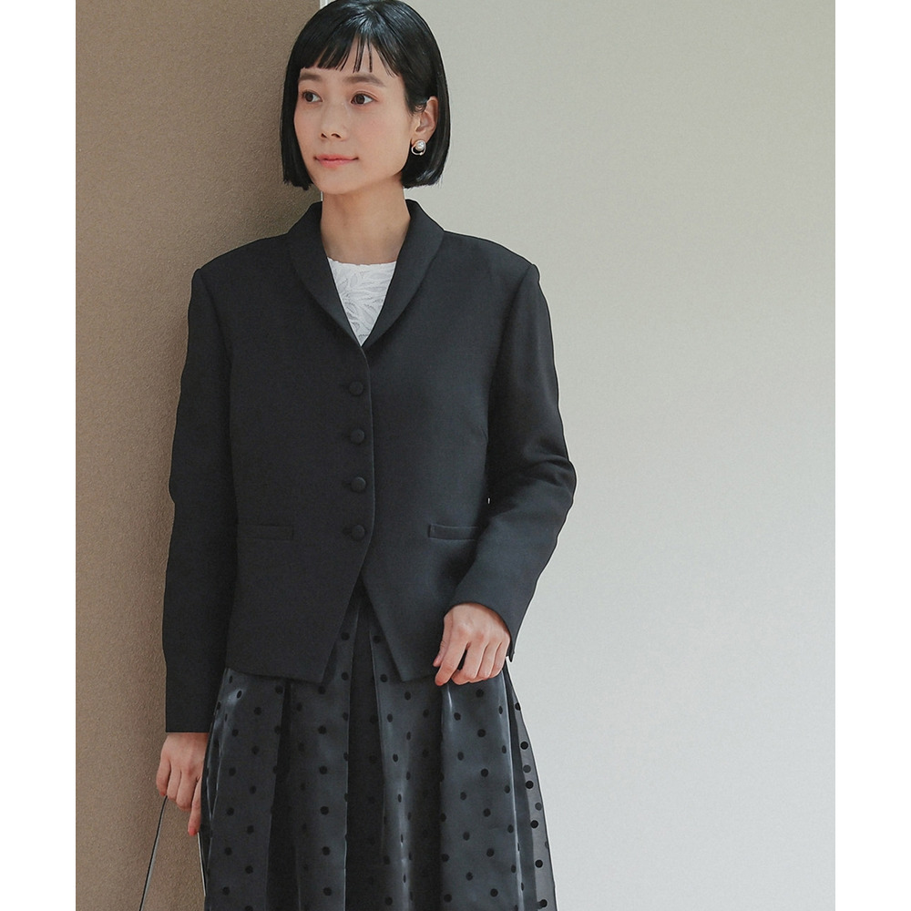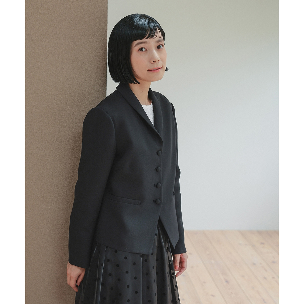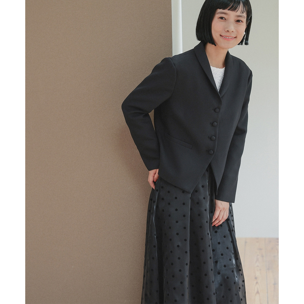 ジャケットはショールカラーデザインで、きちんと感を表現