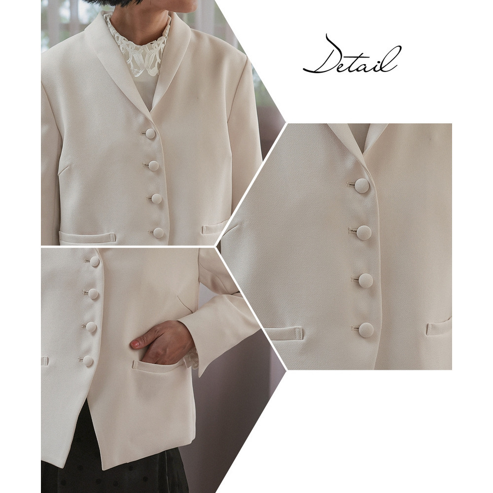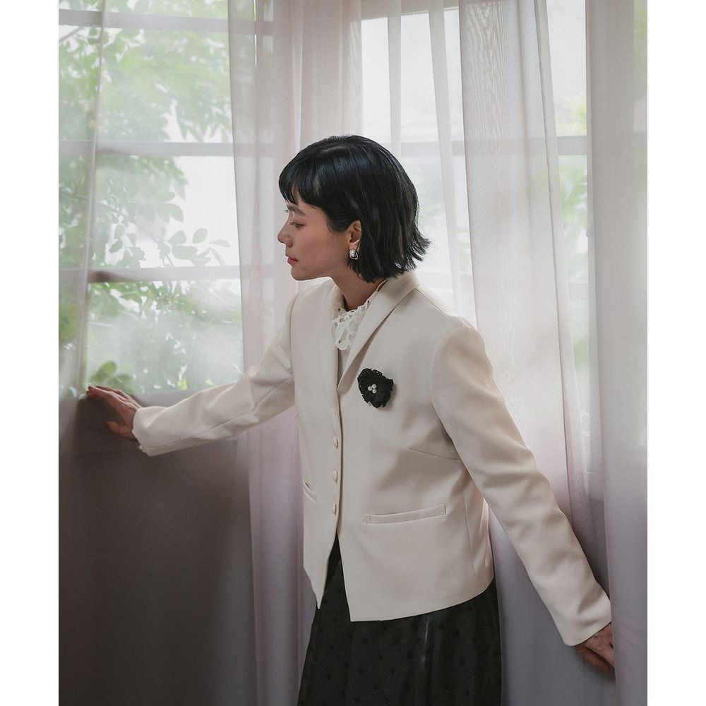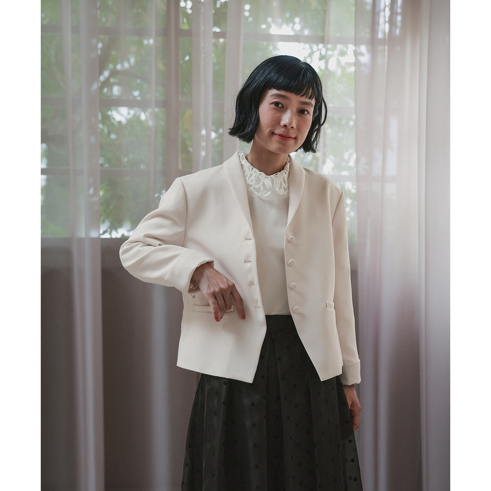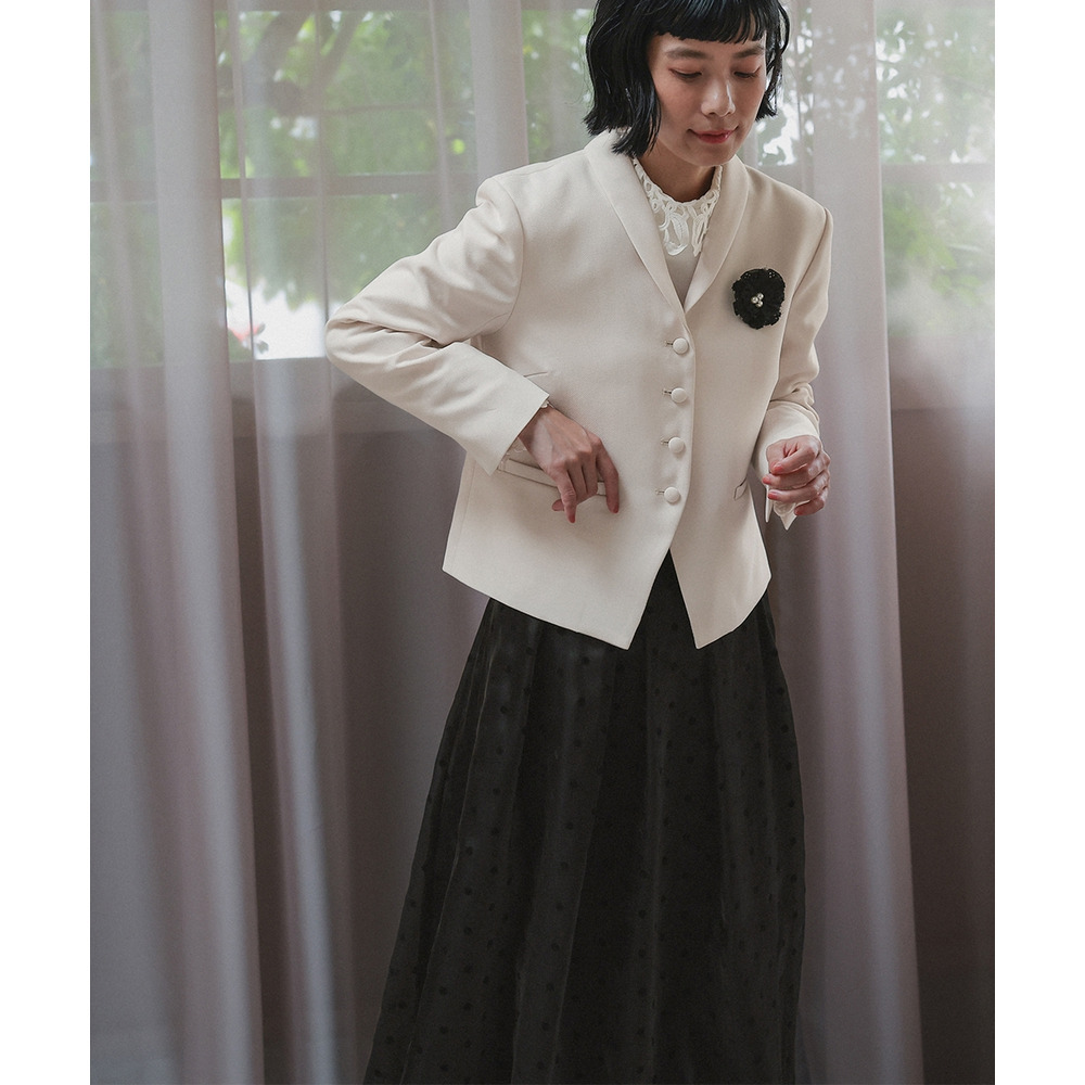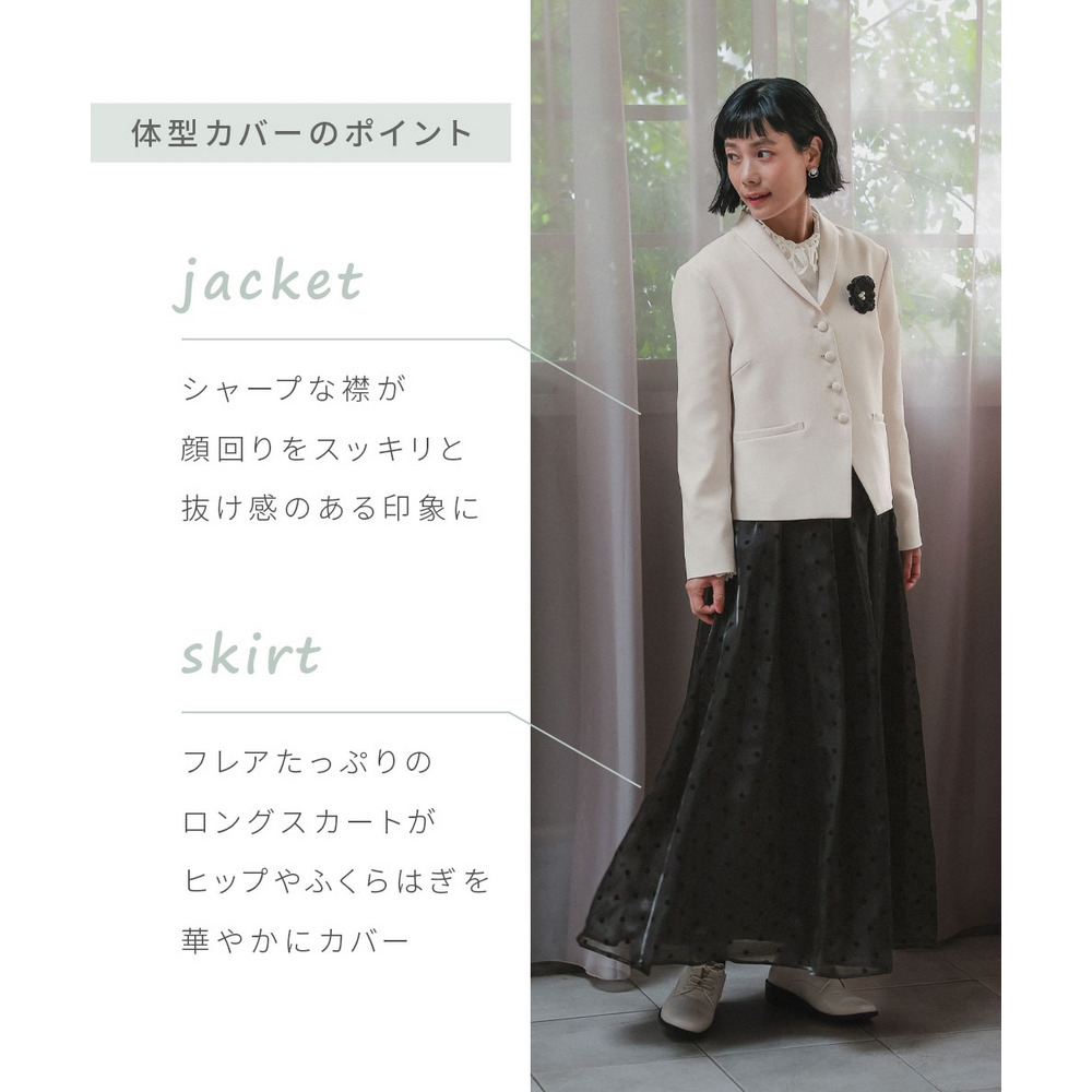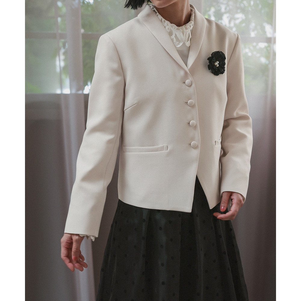ジャケットはショールカラーデザインで、きちんと感を表現