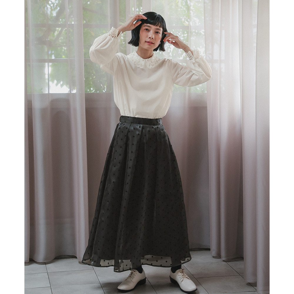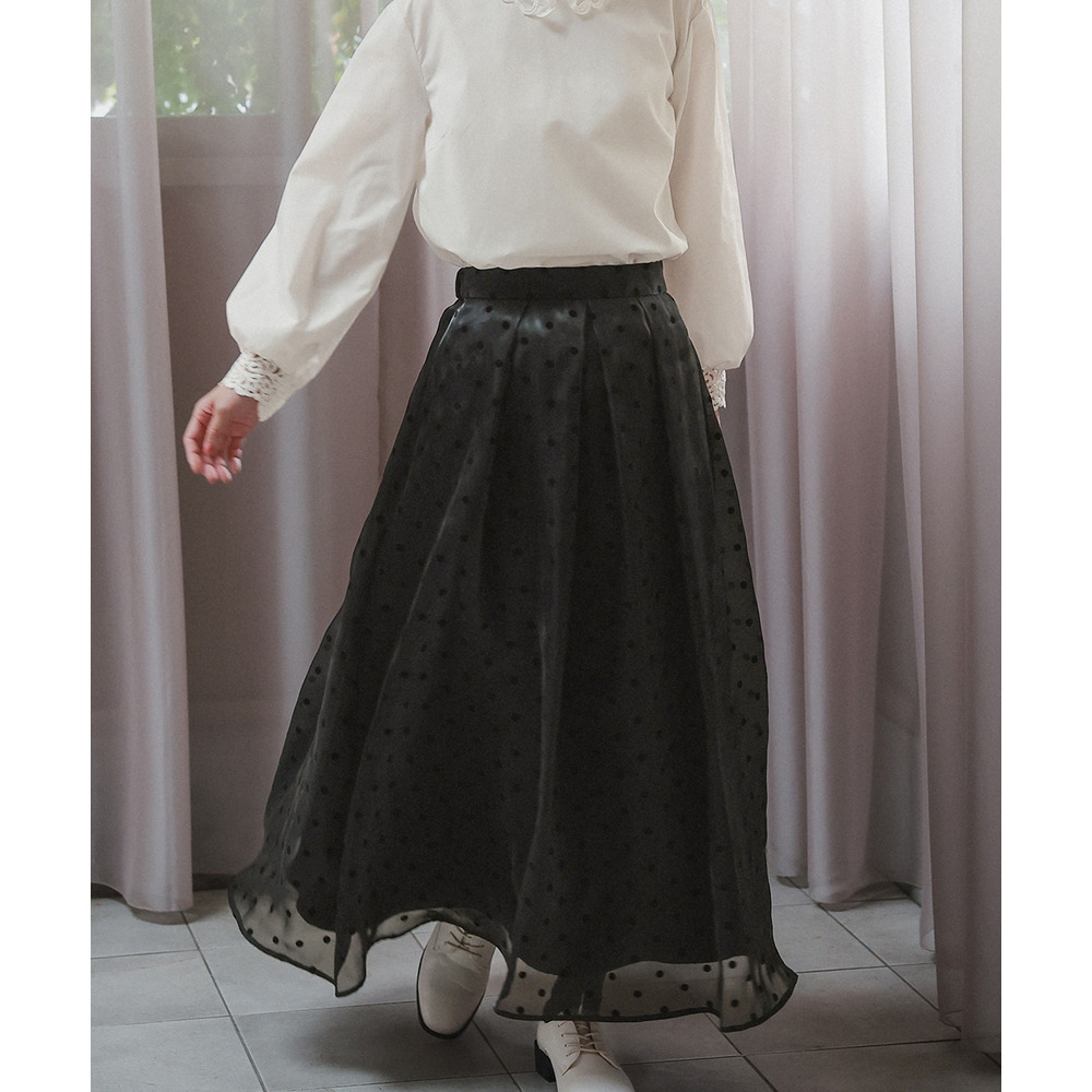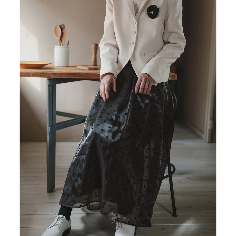 ドットフロッキー生地で、ドット柄部分はベロアのような表面感があり、無地部分は程よい透け感のある上品なスカートです。