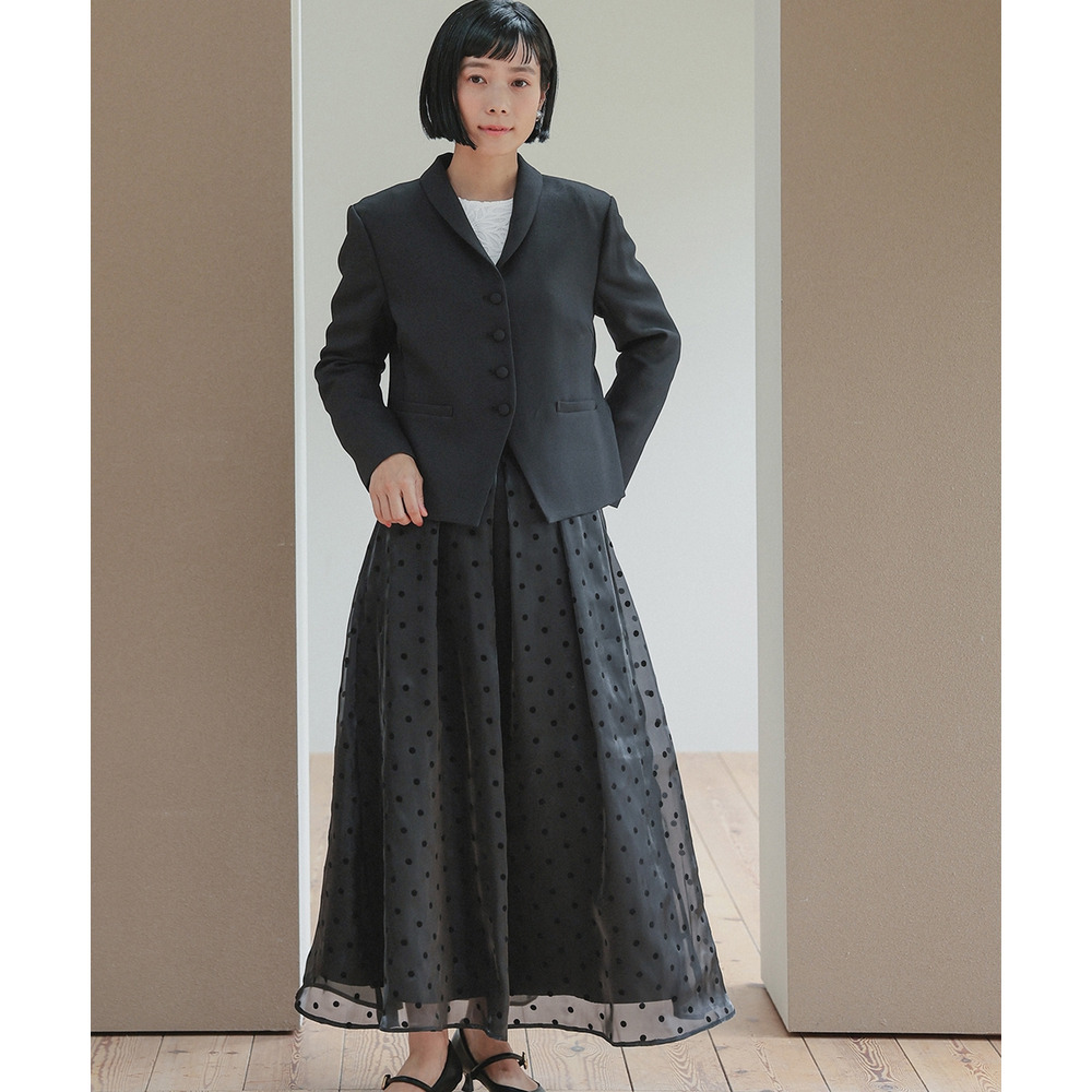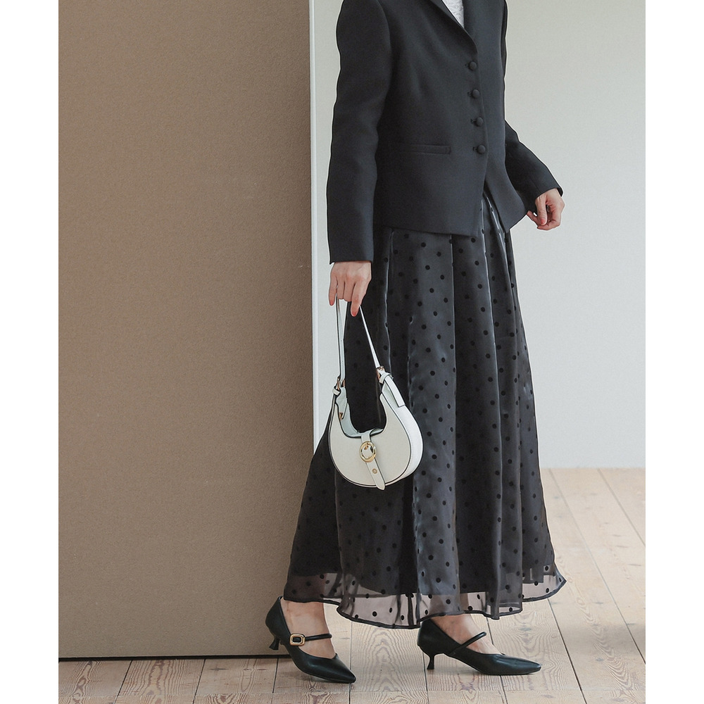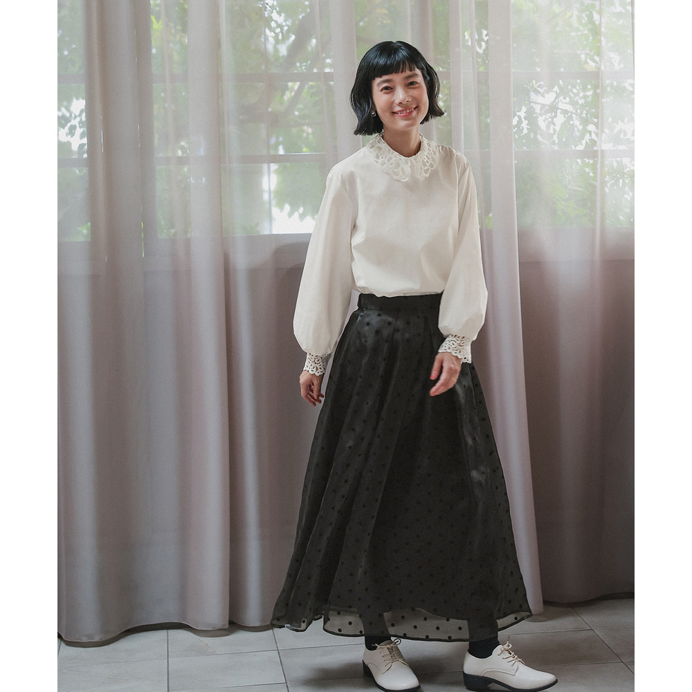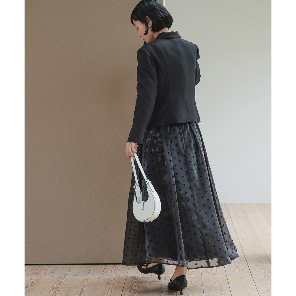 ドットフロッキー生地で、ドット柄部分はベロアのような表面感があり、無地部分は程よい透け感のある上品なスカートです。