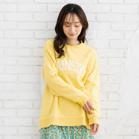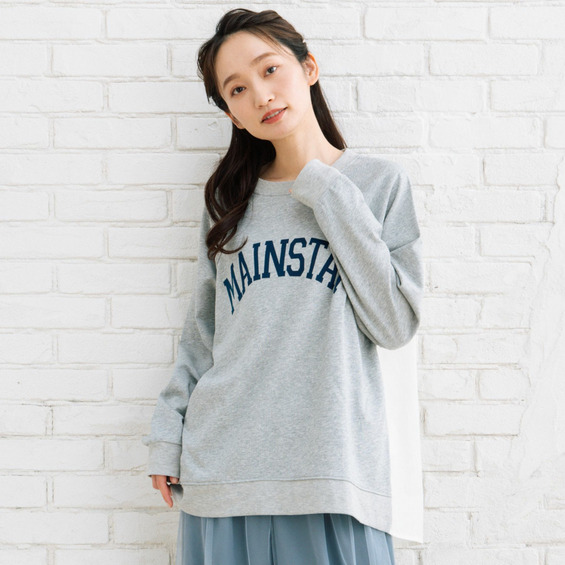 1枚でレイヤードスタイルが完成カレッジロゴレイヤード風スウェット。