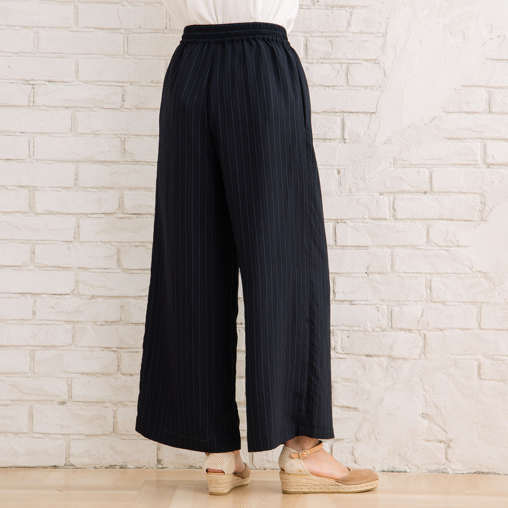 縦のラインを強調する繊細なストライプが美しい、上品仕上げのダブルストライプワイドパンツ。