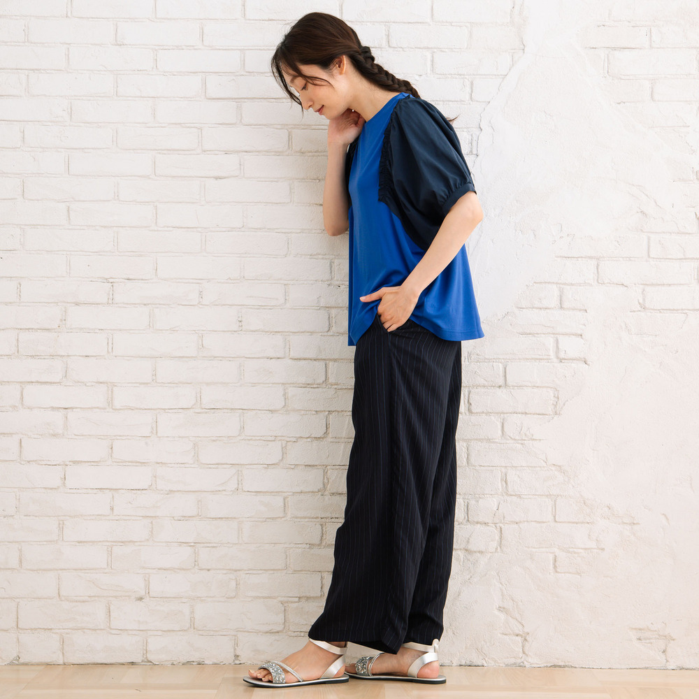 ほんのり光沢のある生地が動きに合わせて揺れ、きれいめな印象を演出します。