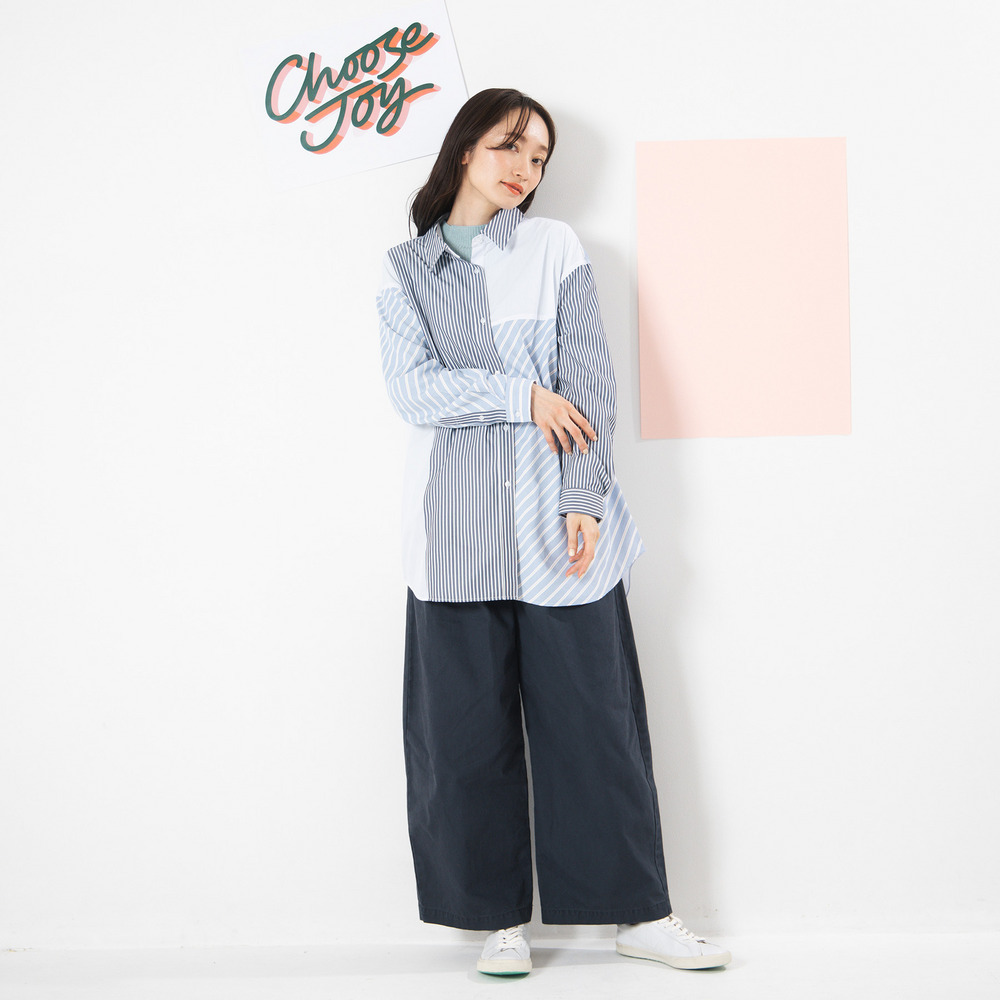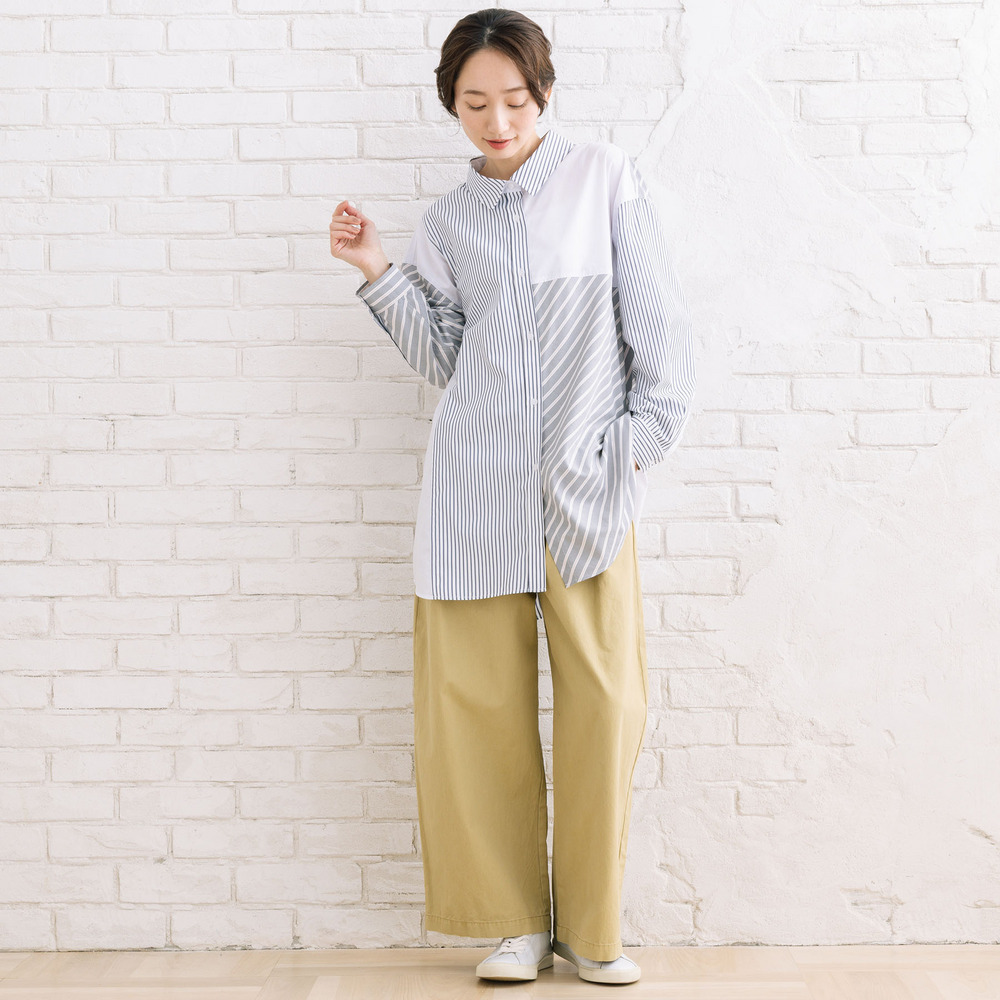 | 素材 | ストライプ(太)部分ポリエステル66% 綿22% 再生繊維(セルロース)12% ストライプ(細)部分ポリエステル100% 無地部分ポリエステル86% 綿14% |