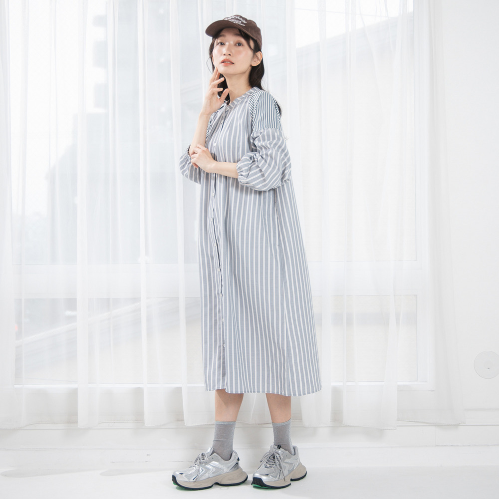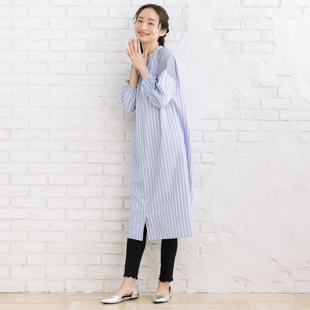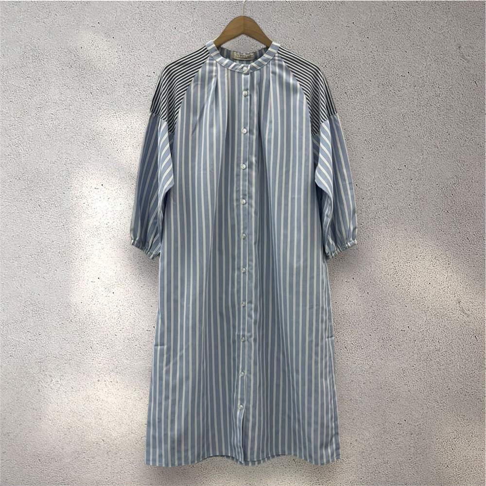 ・デザインポイント:バンドカラー、ストライプ、ボリュームスリーブ、Aラインシルエット