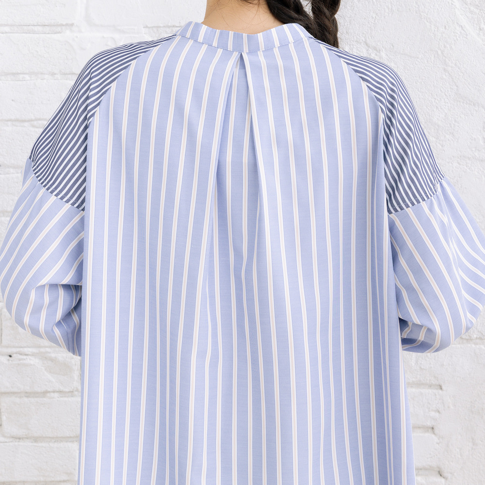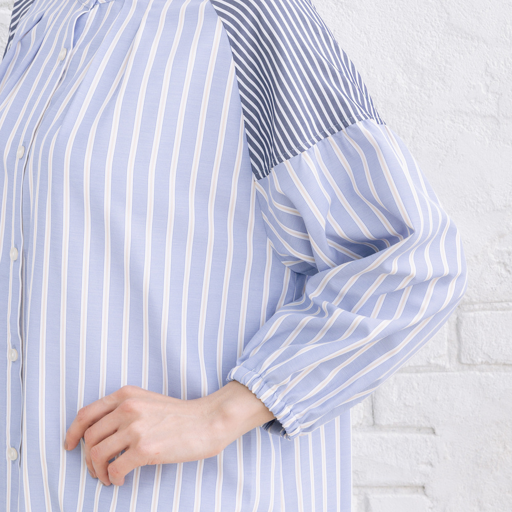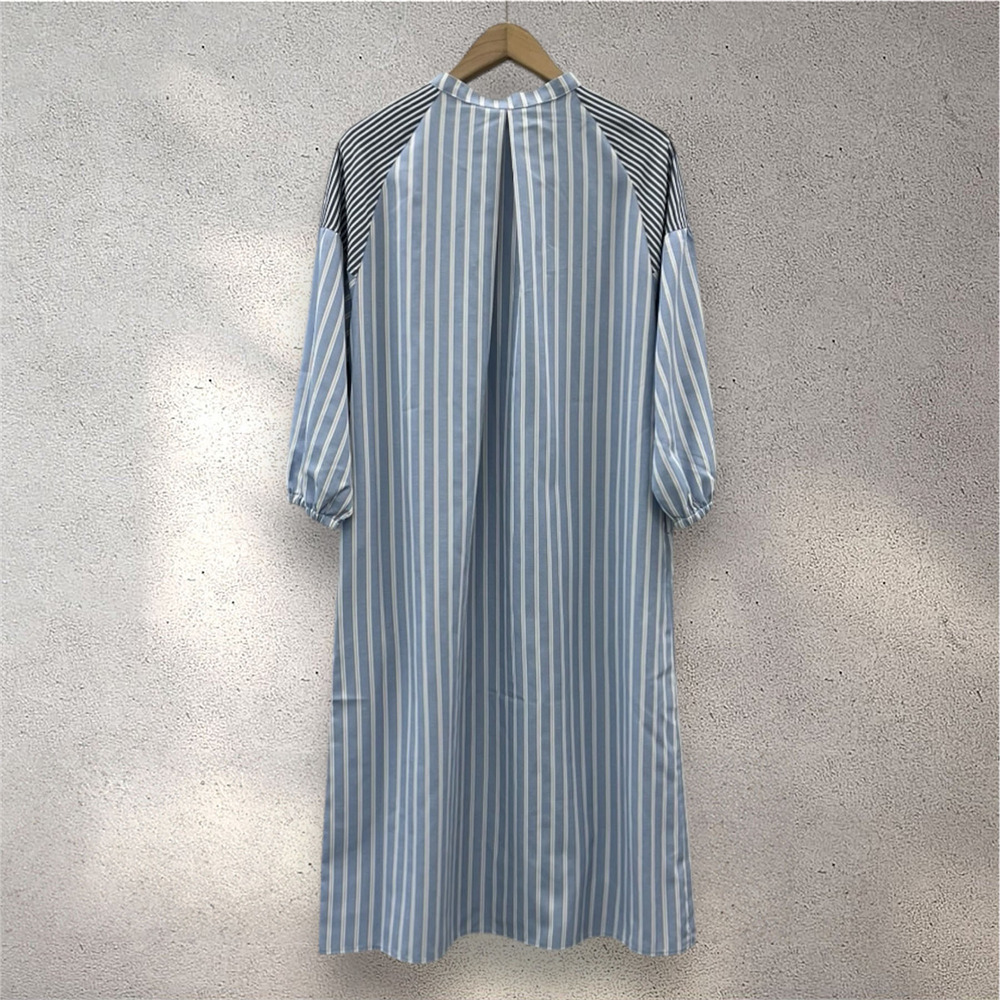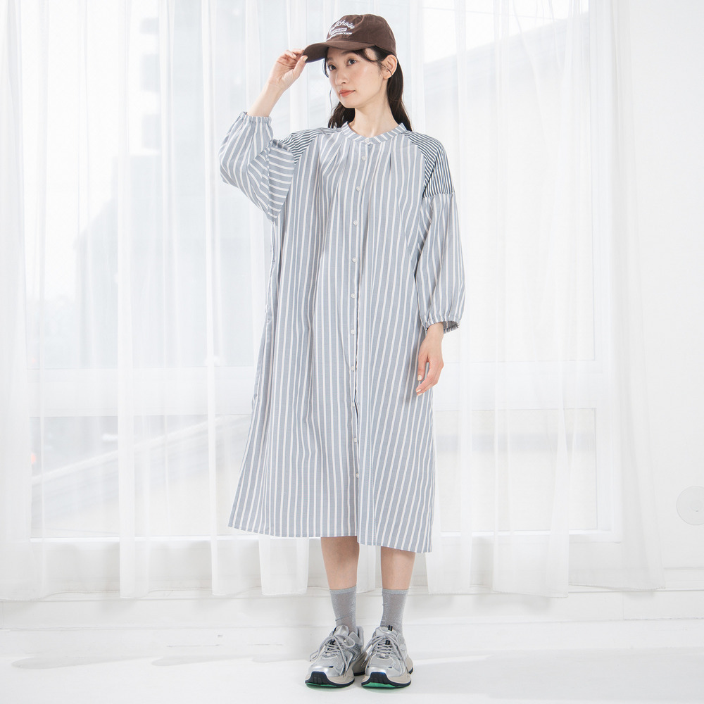 ・デザインポイント:バンドカラー、ストライプ、ボリュームスリーブ、Aラインシルエット