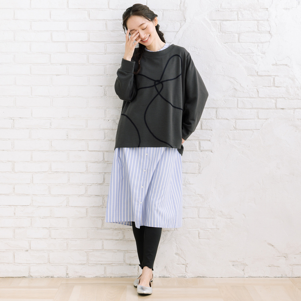 体から程よく離れるゆったりとしたAラインシルエットで、リラックス感のある着心地と、スタイルアップ効果を両立します。