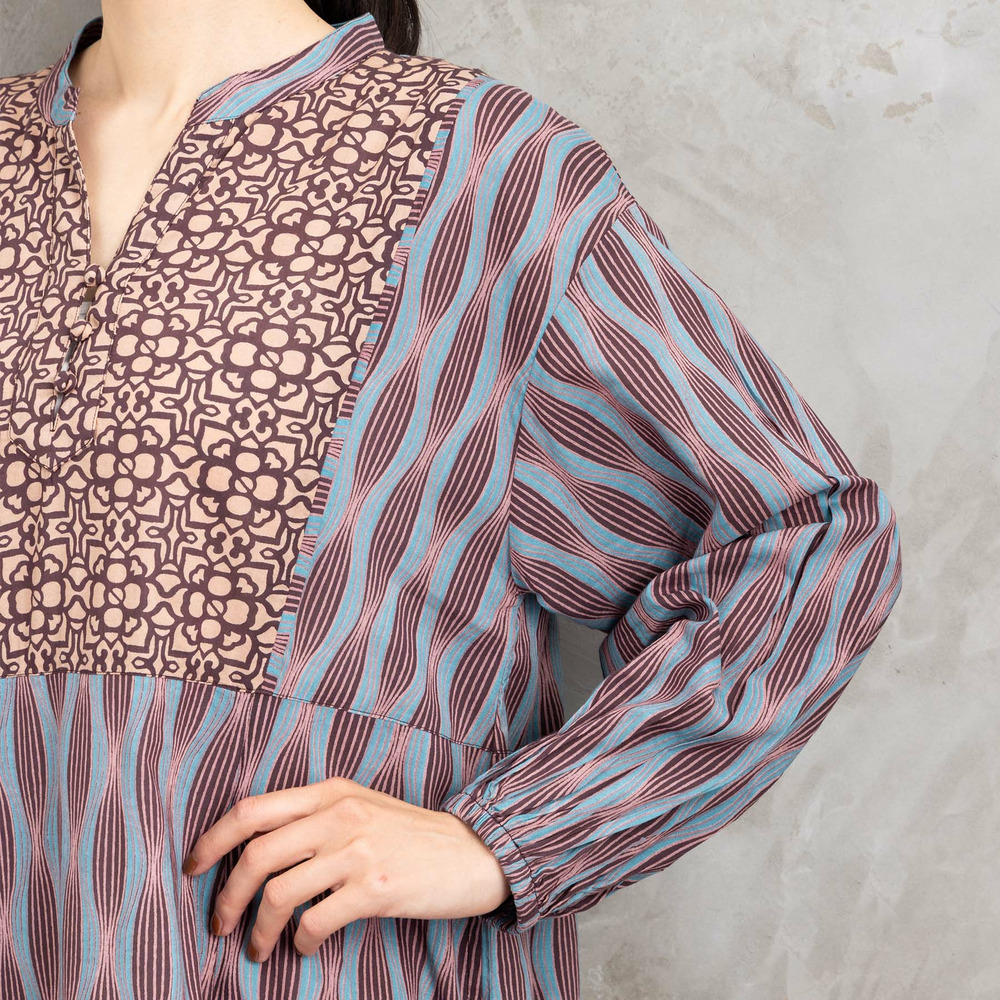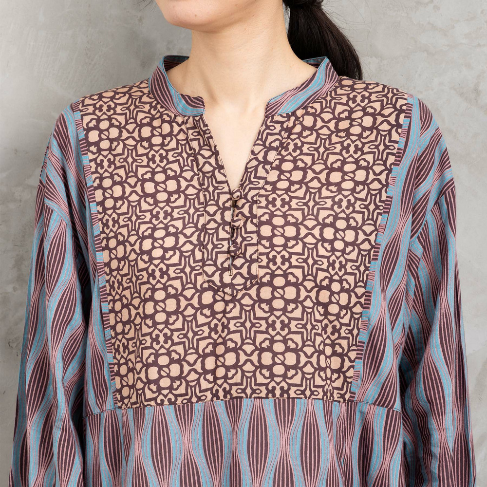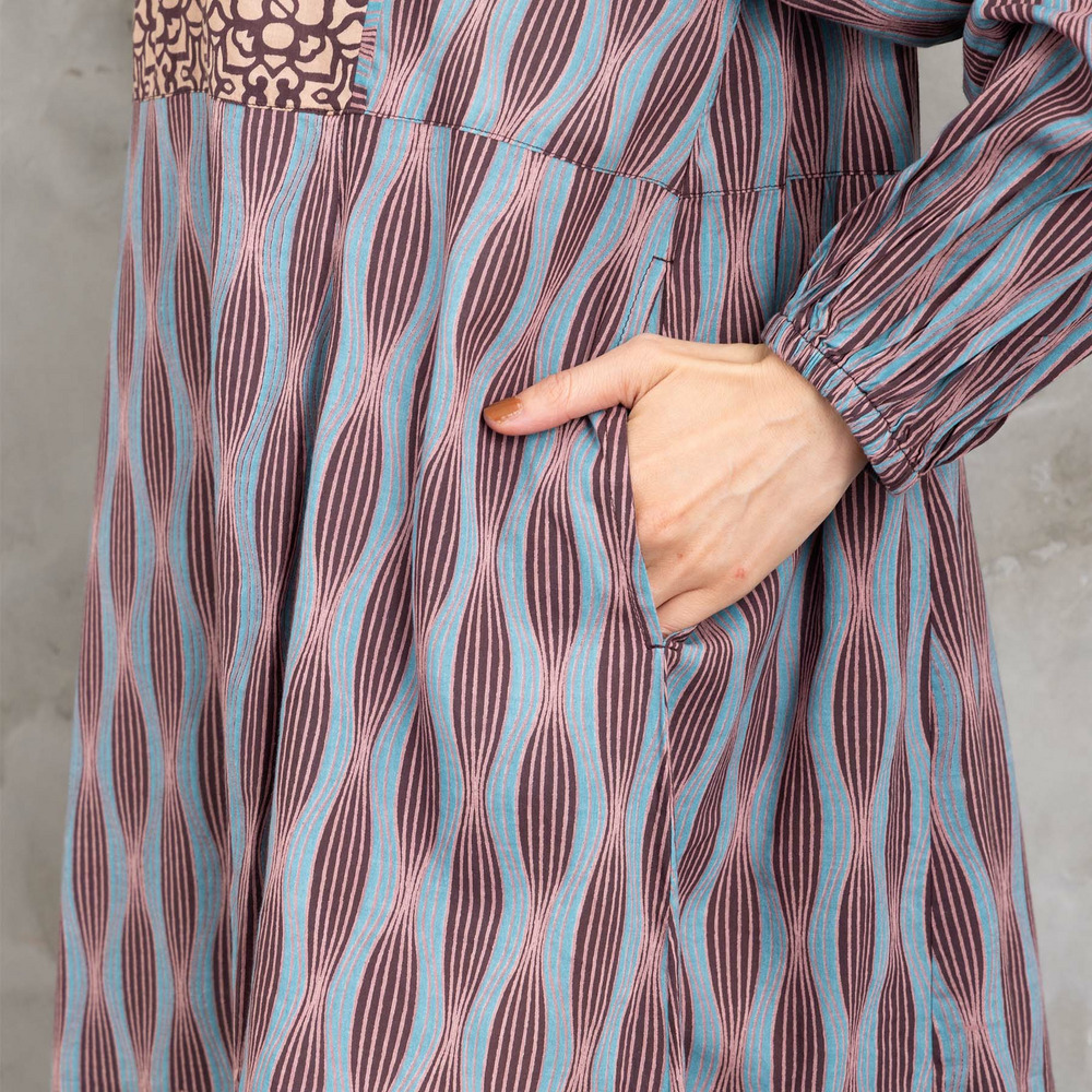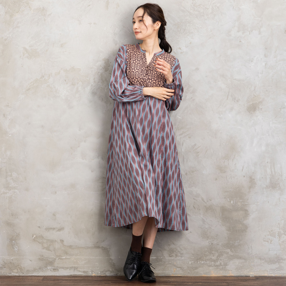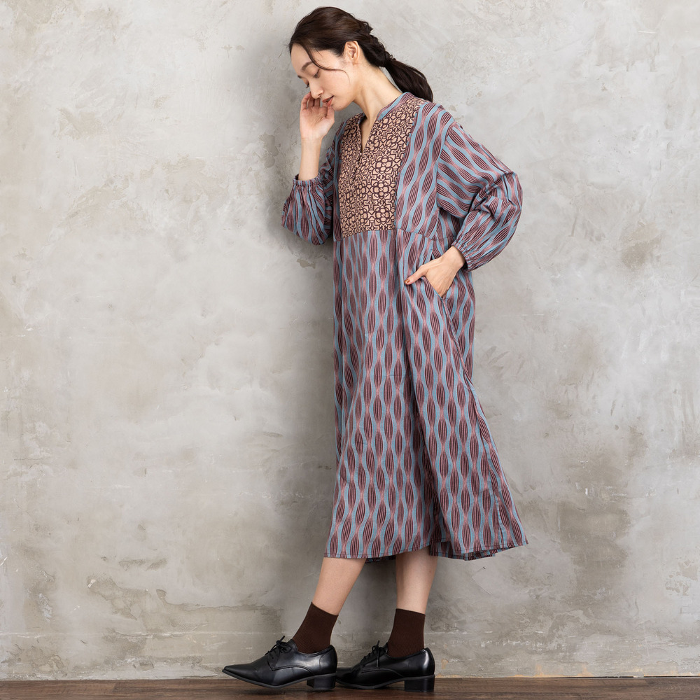 胸元と身頃で異なるパターンを組み合わせた、印象的なパネルプリントワンピース。