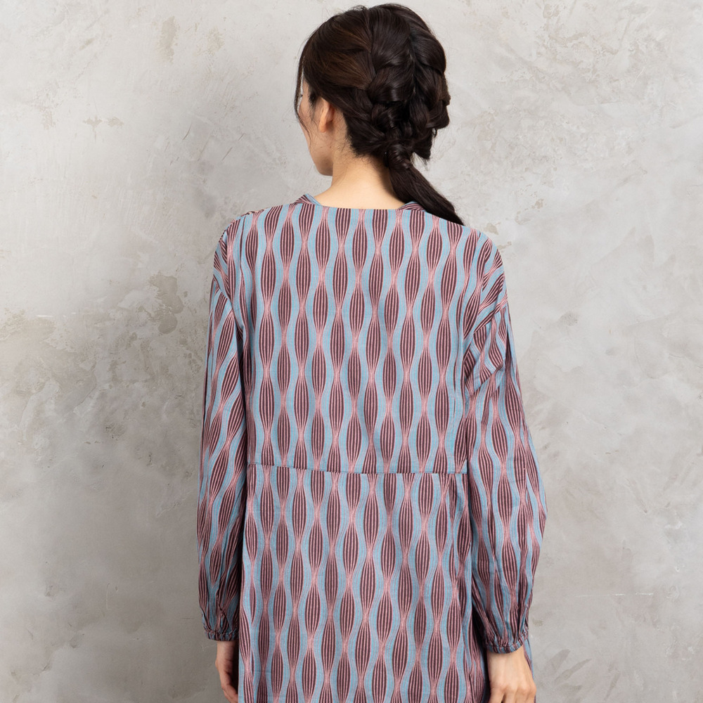 ・デザインポイント:パネル柄切り替え、Vネック、ギャザー袖
