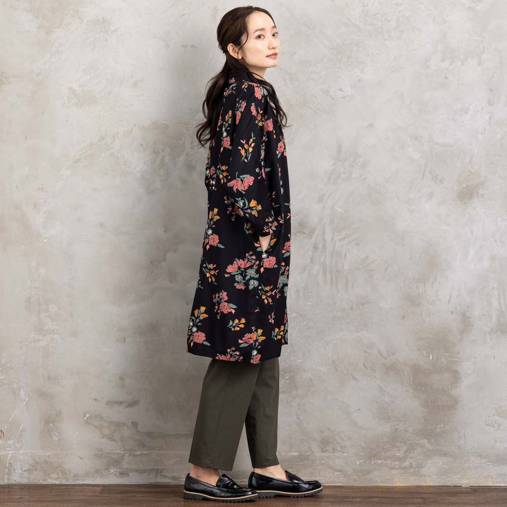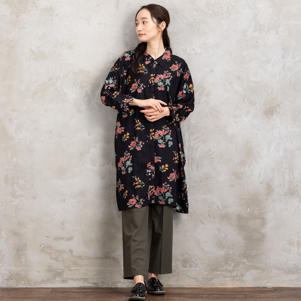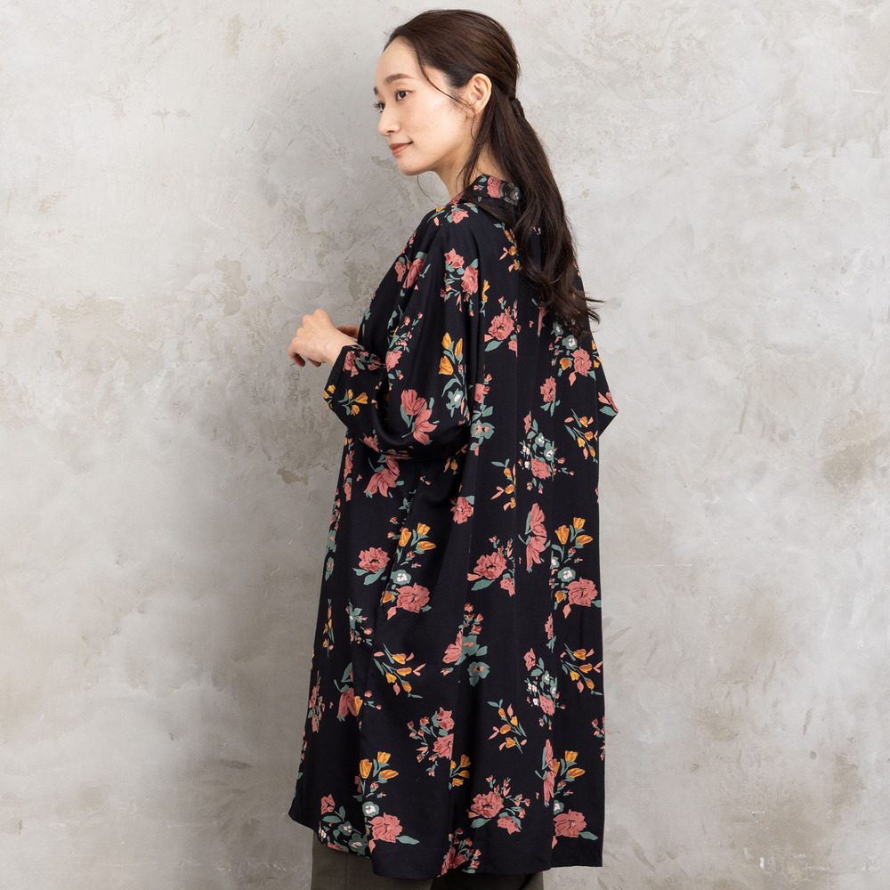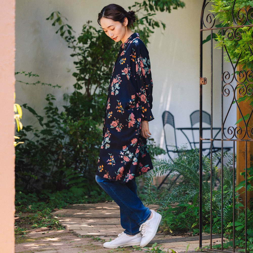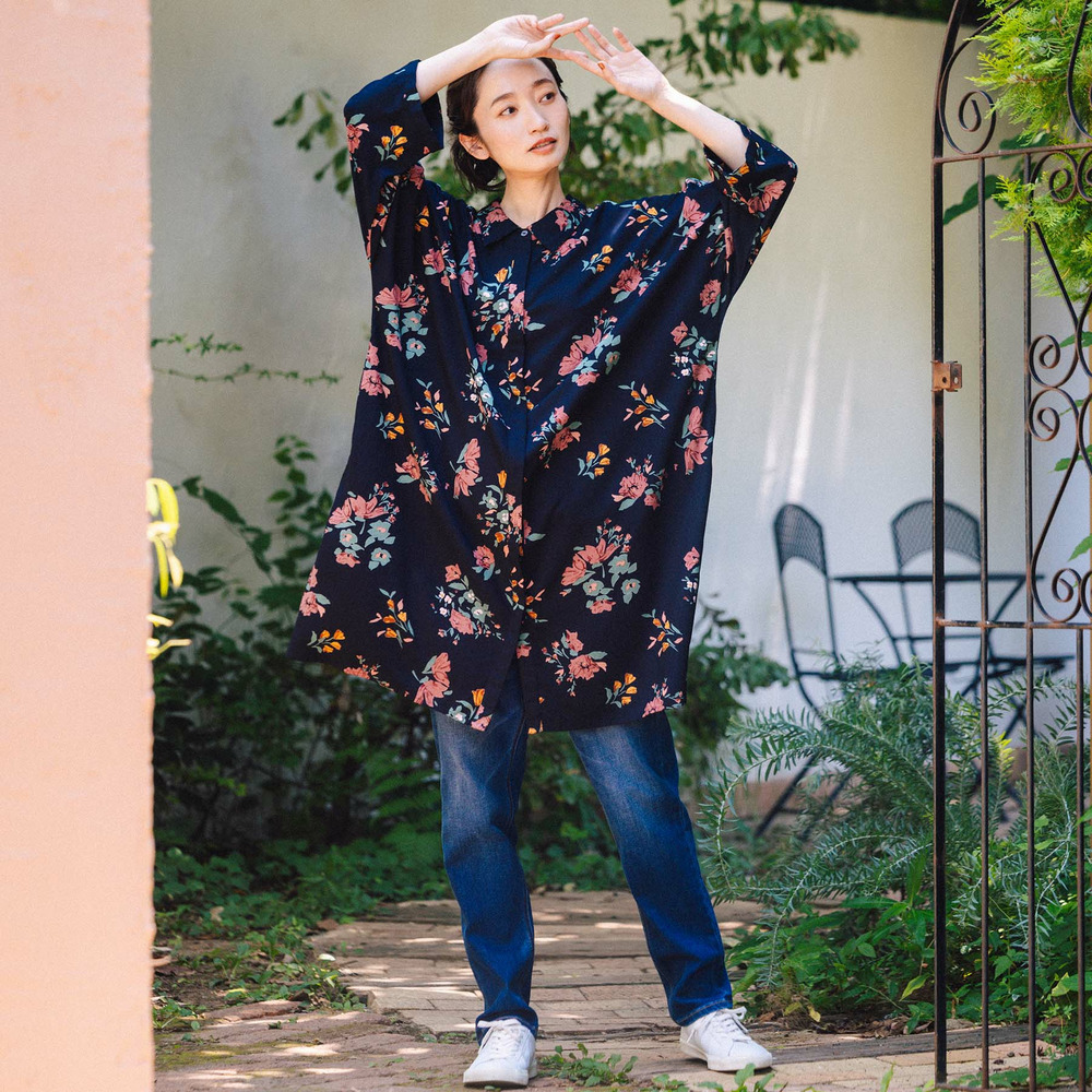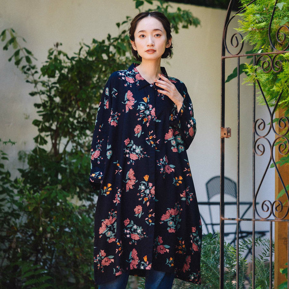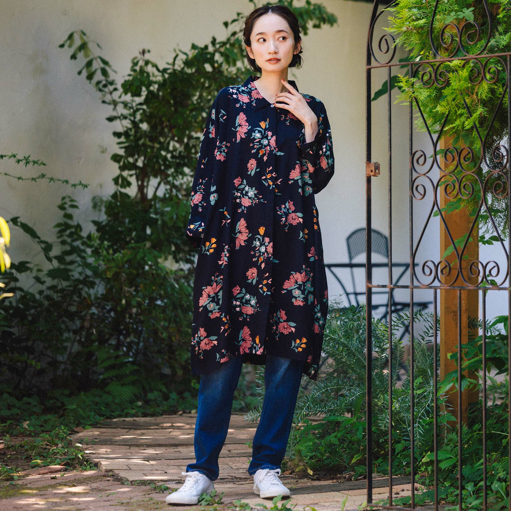 シックなベースカラーに映える花束のようなプリントが、大人の華やぎを演出。