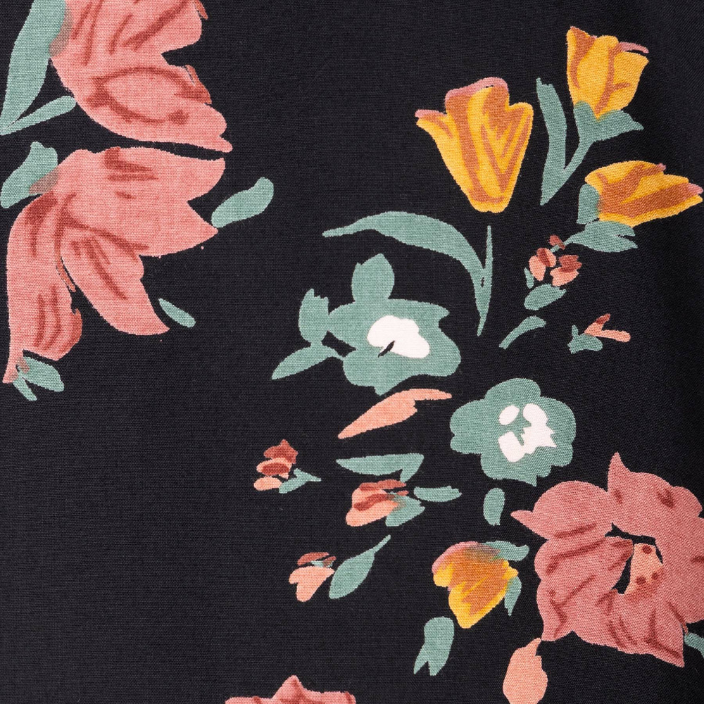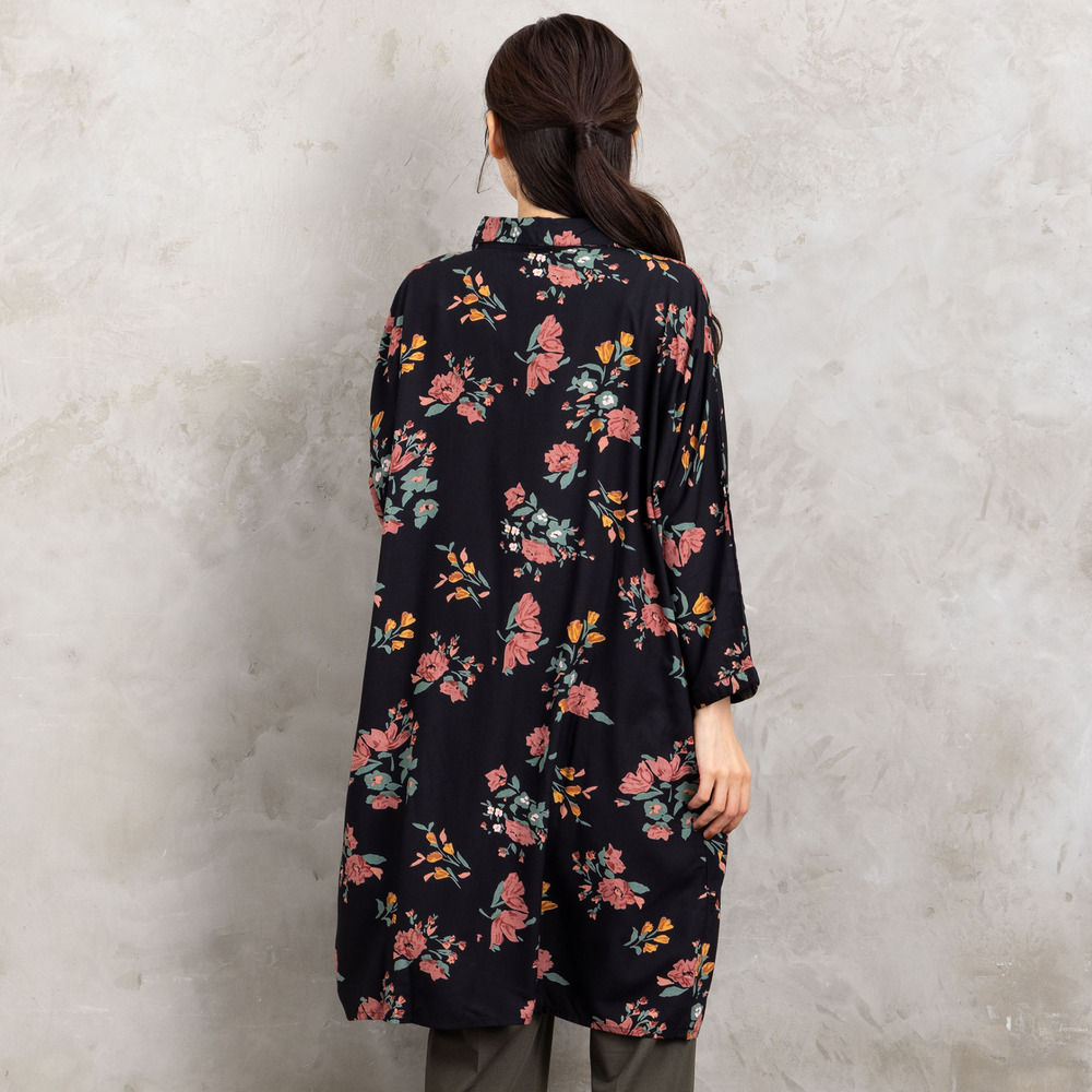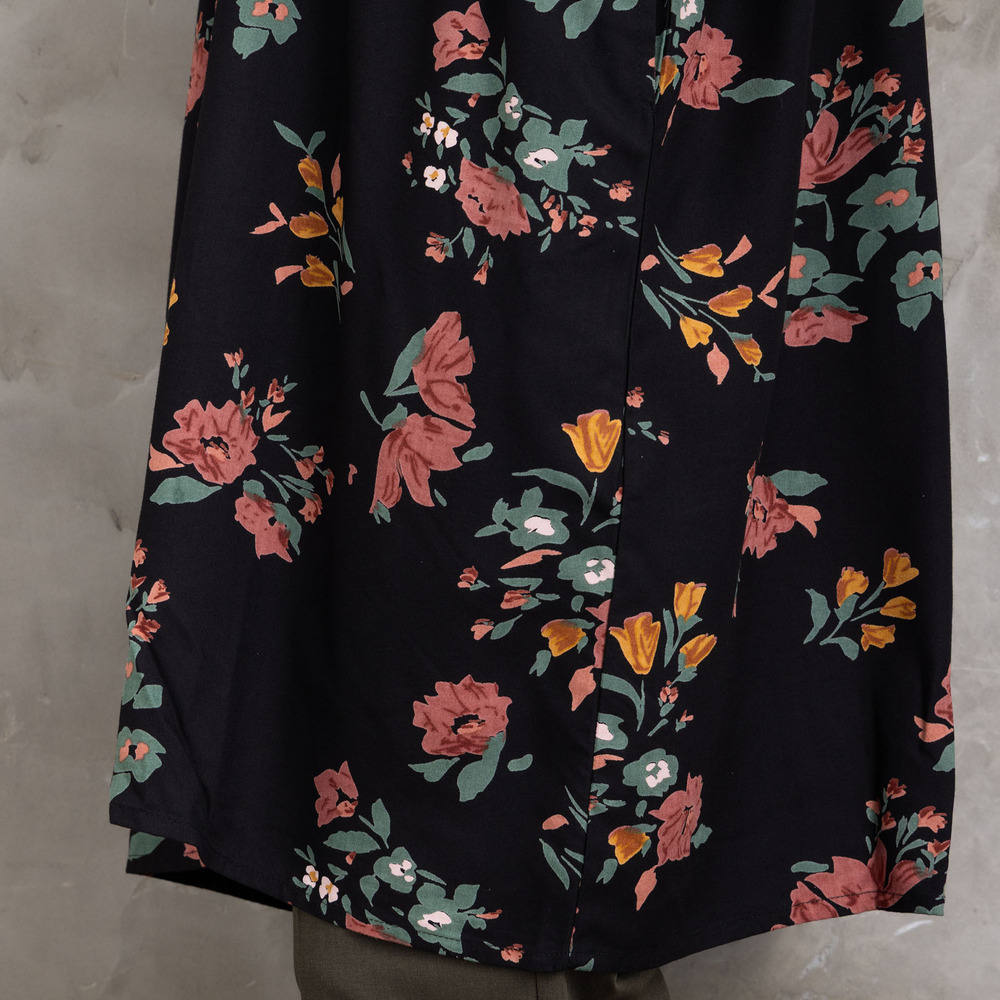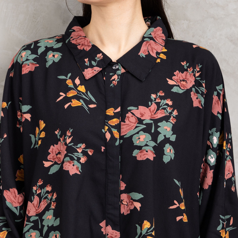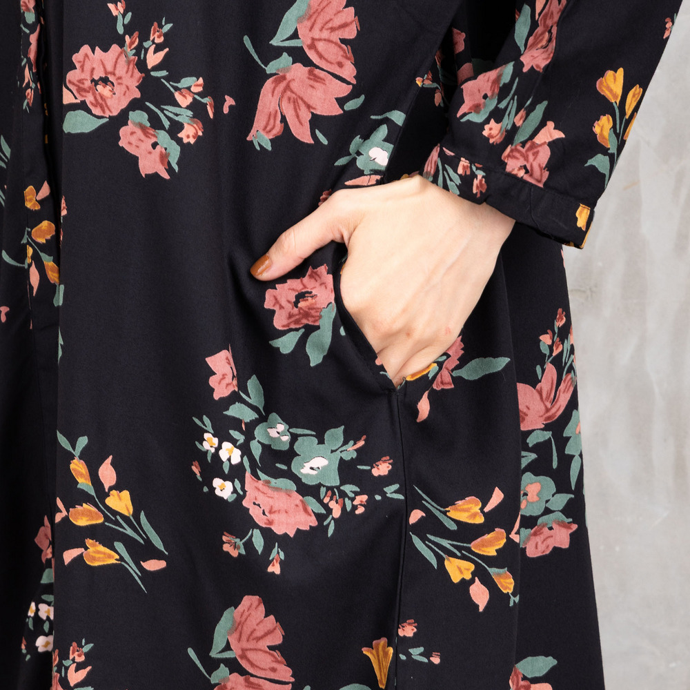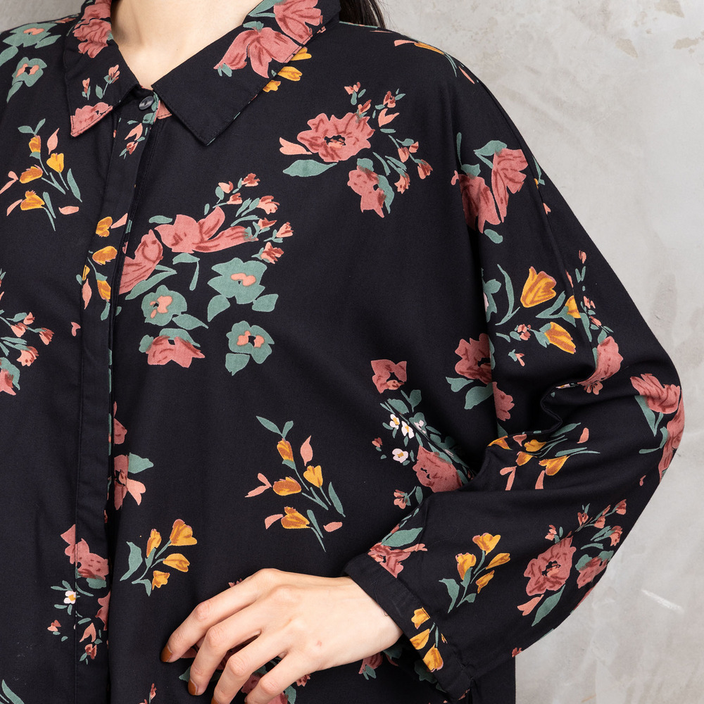 シックなベースカラーに映える花束のようなプリントが、大人の華やぎを演出。