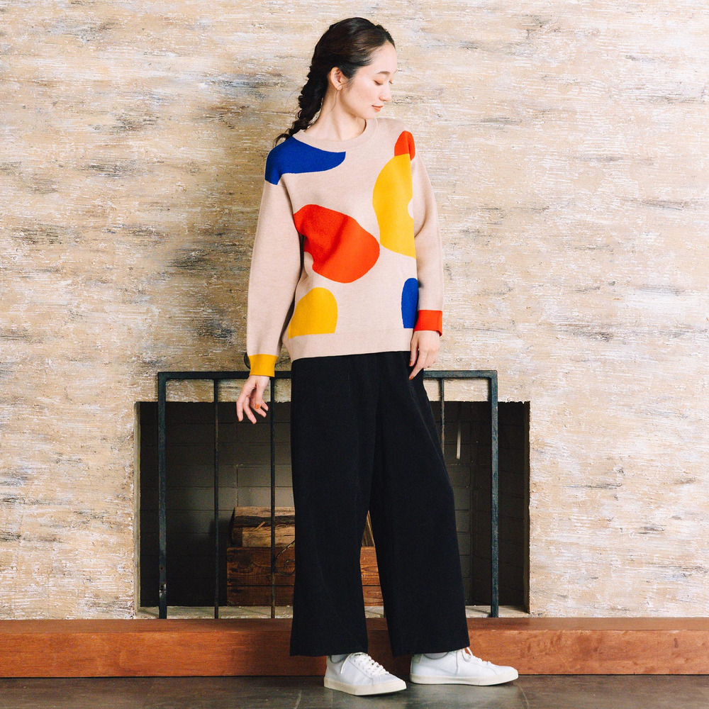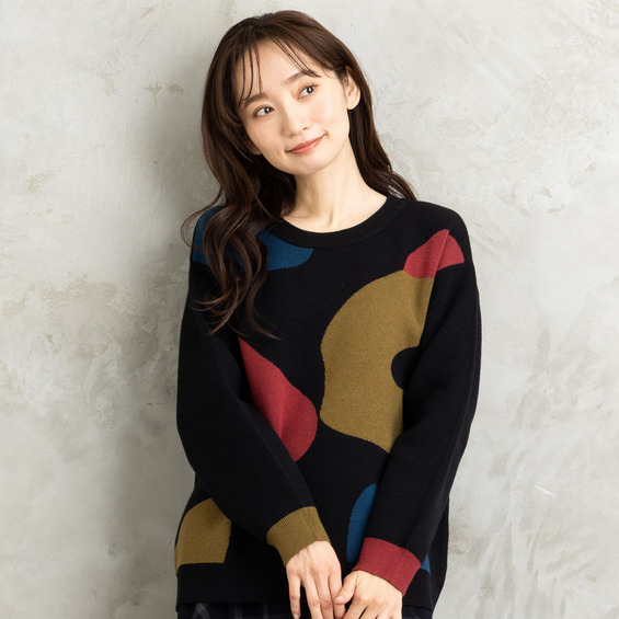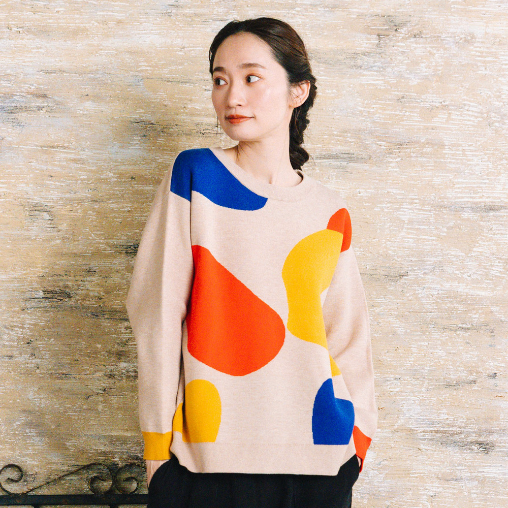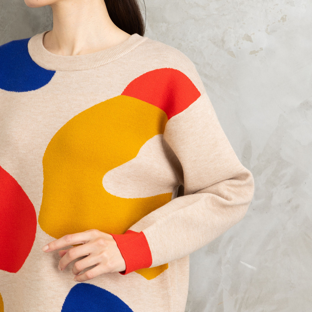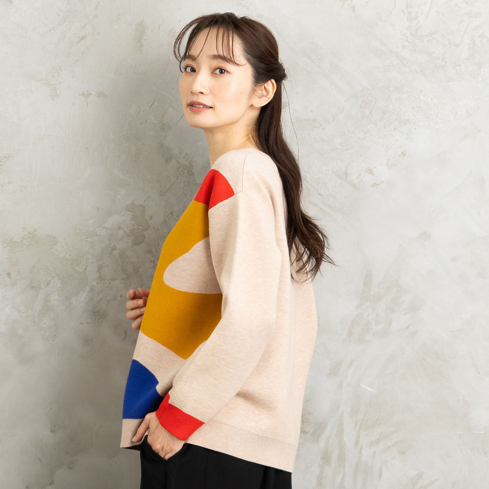 大胆なペイントタッチのカラーが目を惹く、アート感のあるニット。
