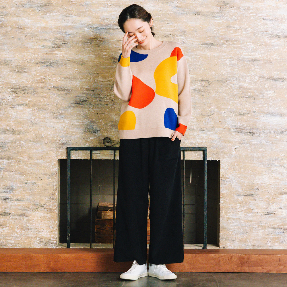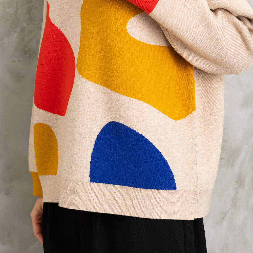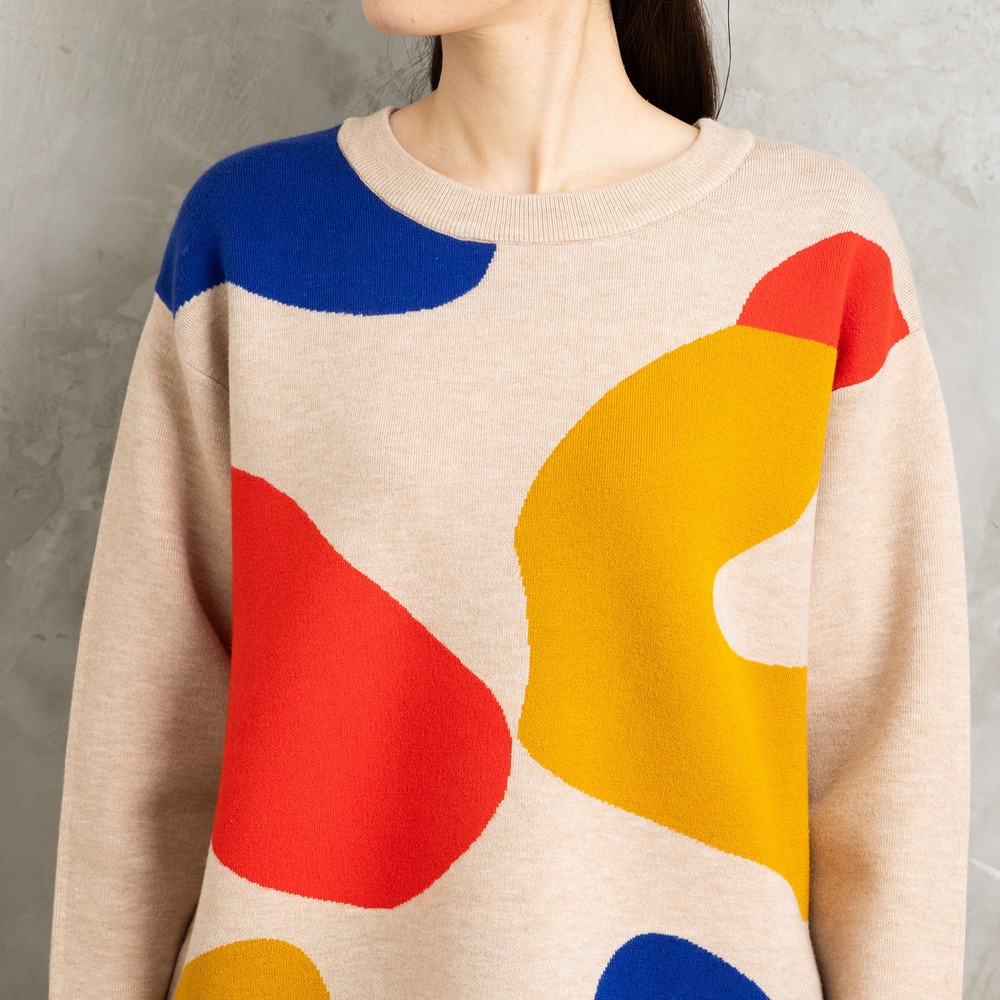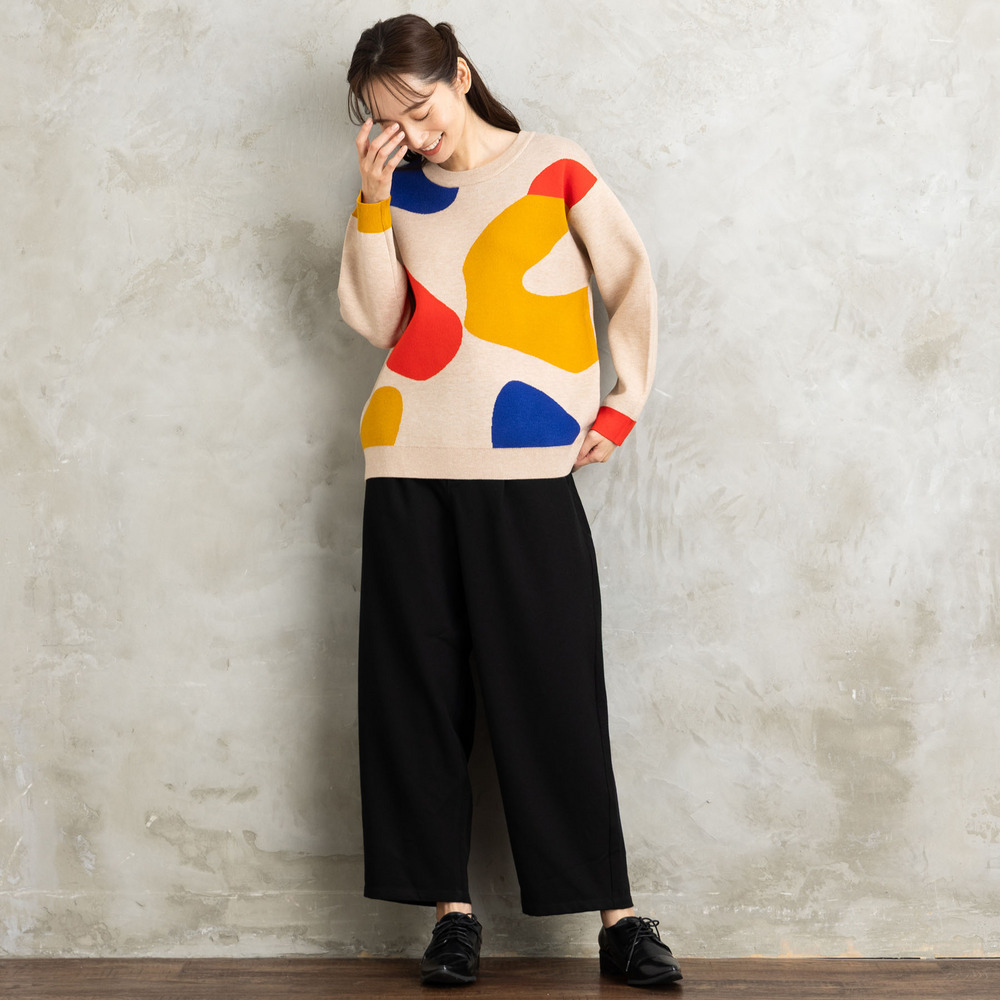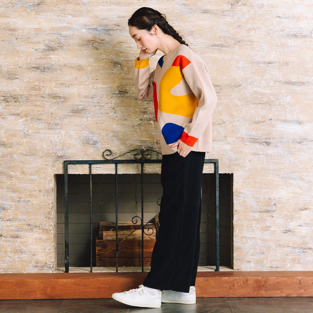 大胆なペイントタッチのカラーが目を惹く、アート感のあるニット。