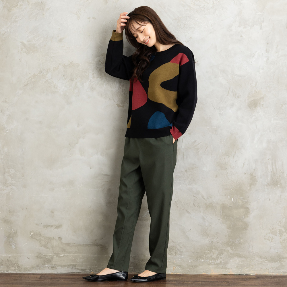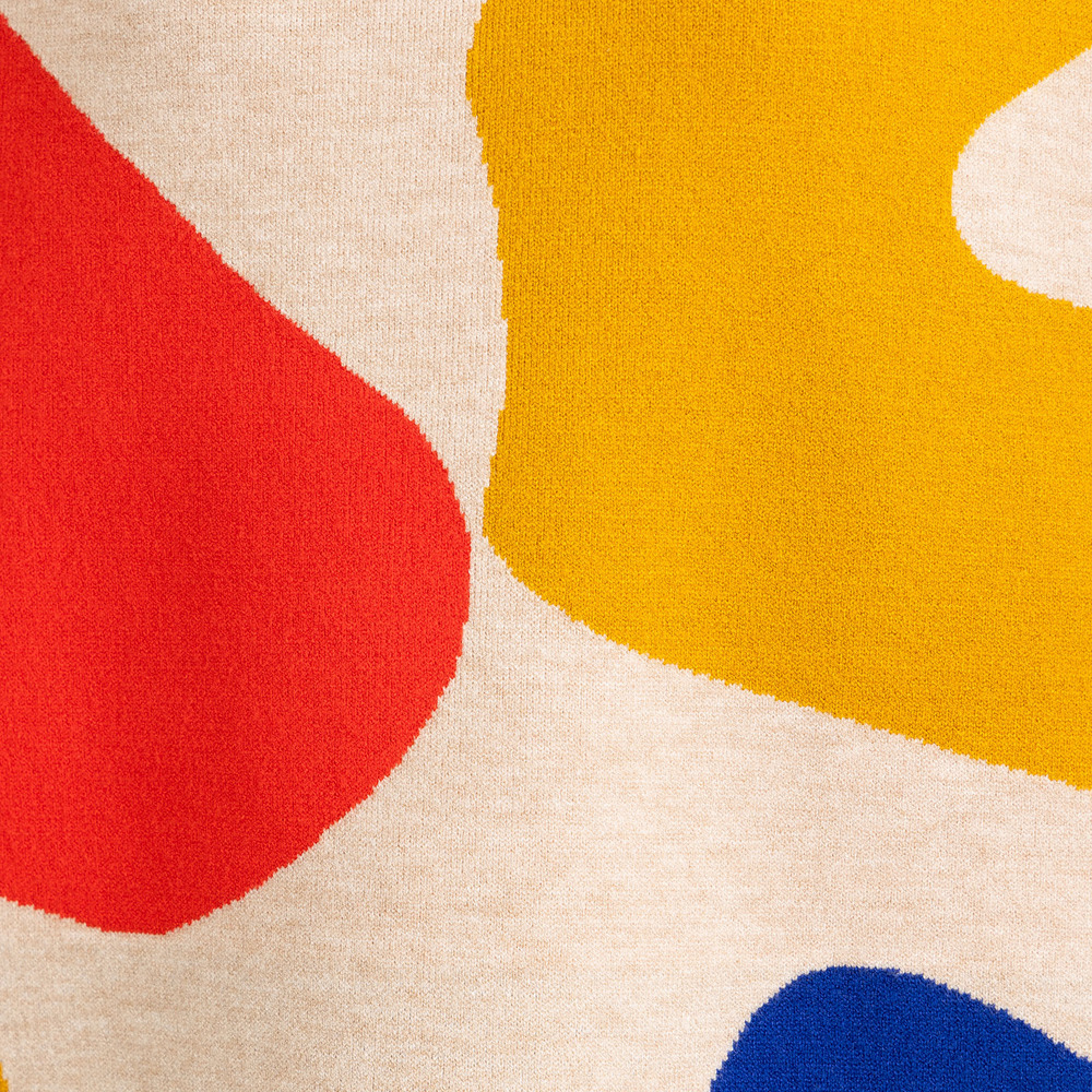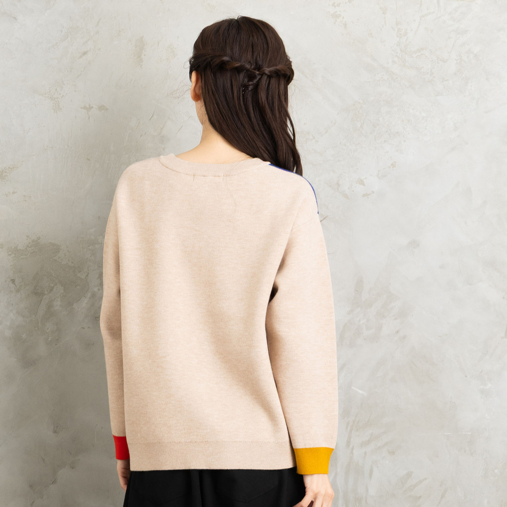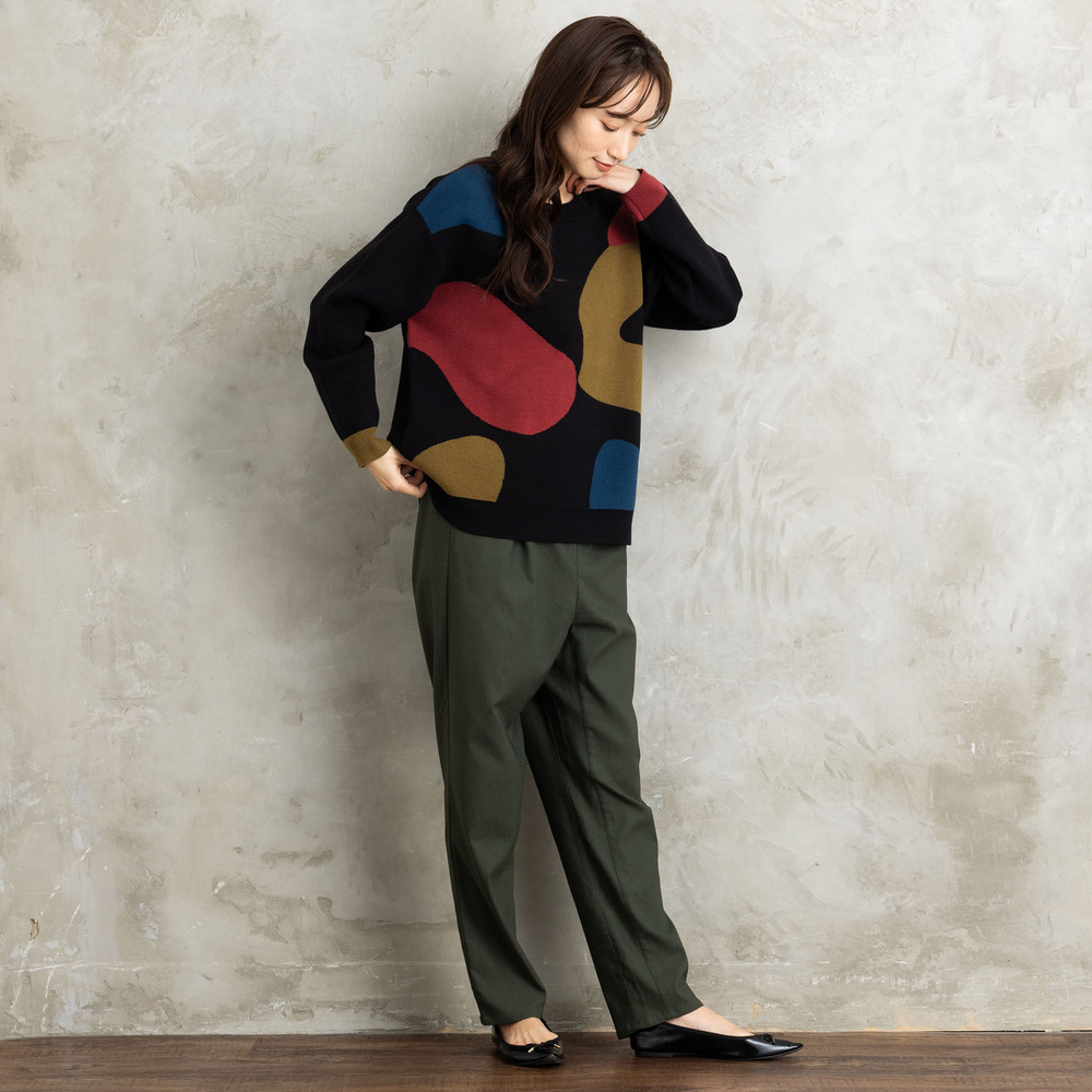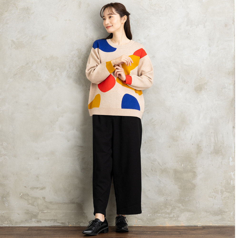 大胆なペイントタッチのカラーが目を惹く、アート感のあるニット。