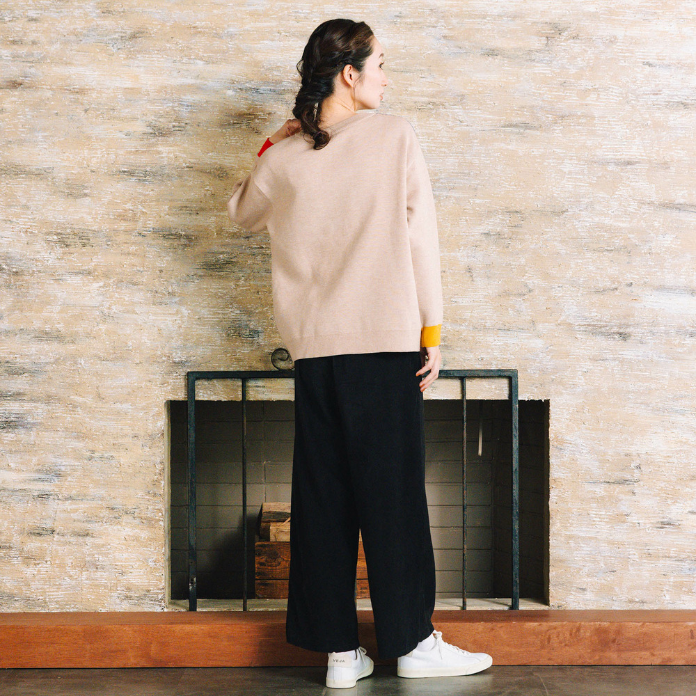 シンプルなデニムやワイドパンツを合わせて、主役ニットとしてコーディネート。
