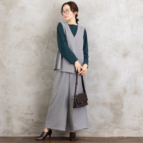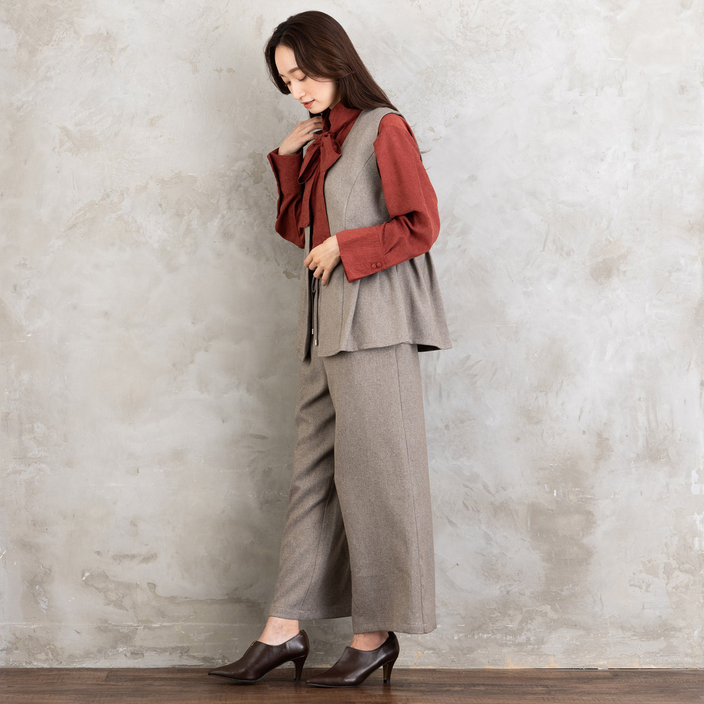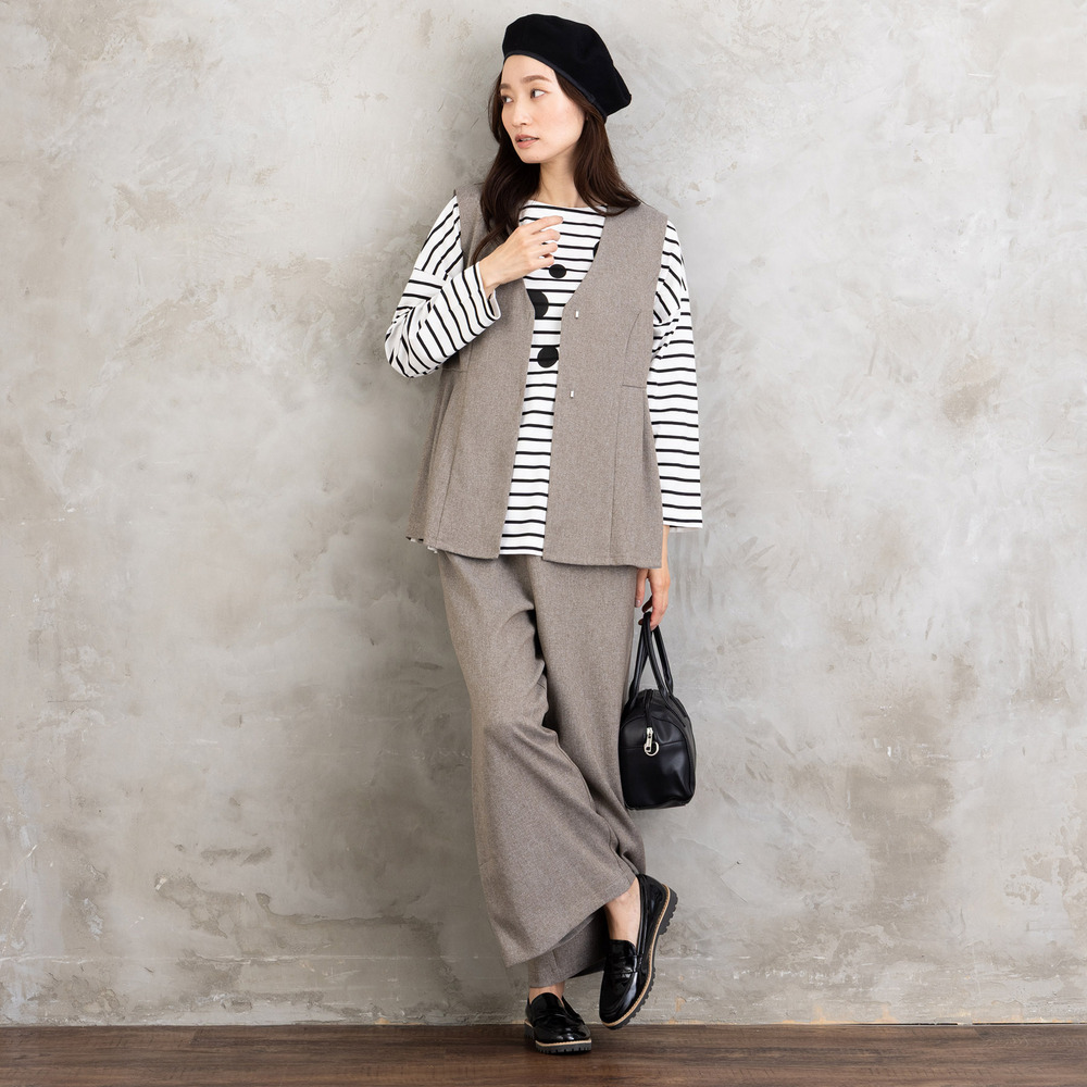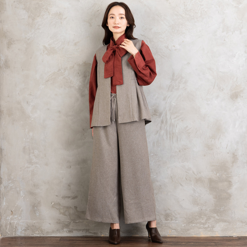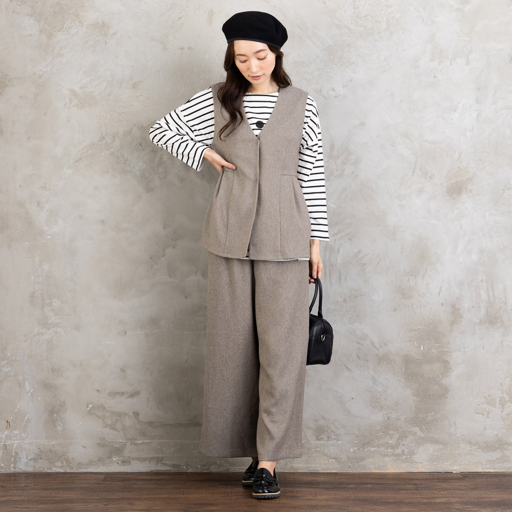 ツイスト調の表情ある生地を使用した、ジレとワイドパンツのセットアップ。