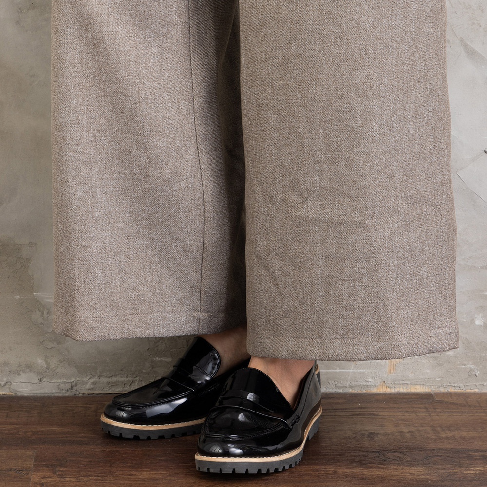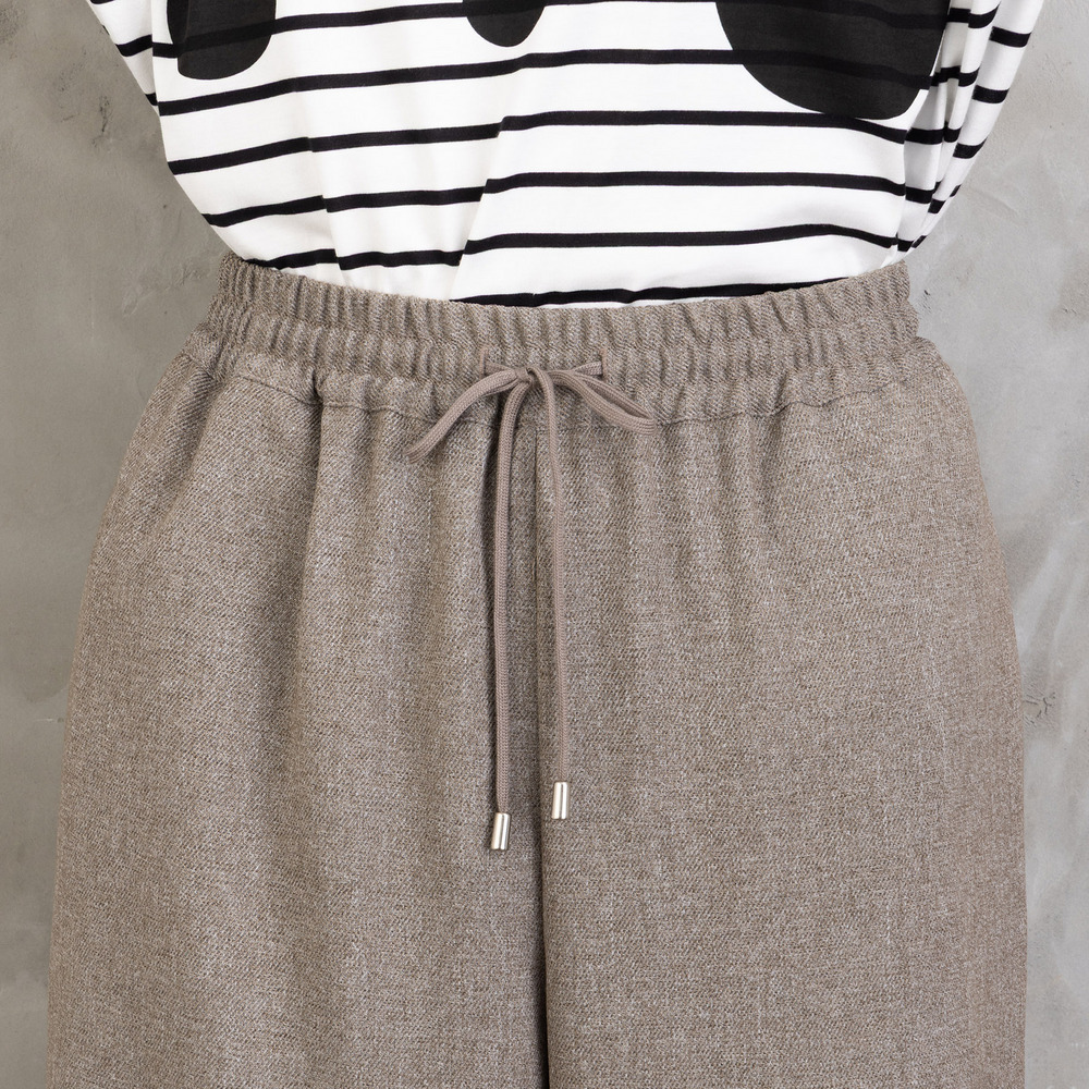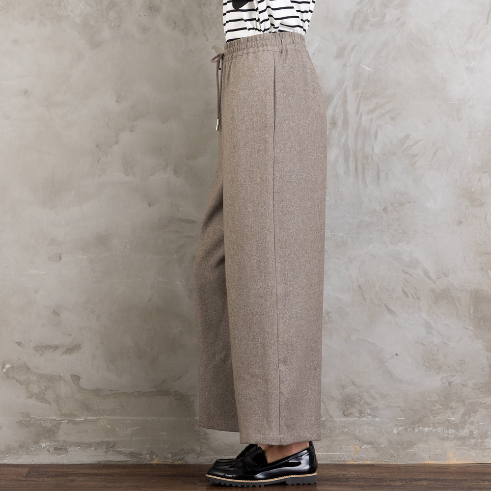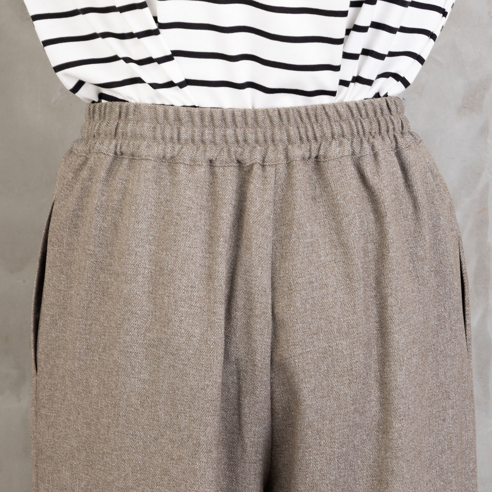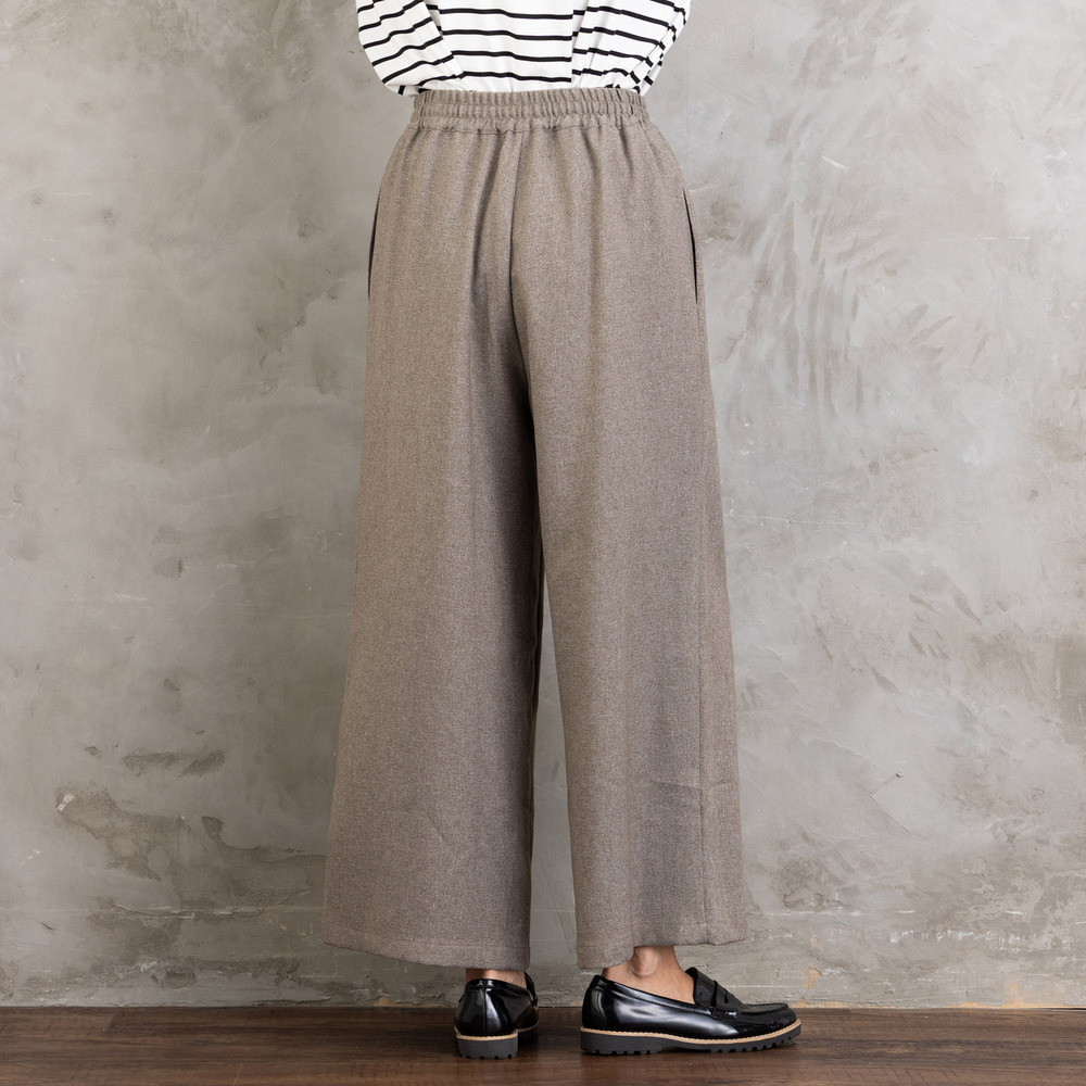 ツイスト調の表情ある生地を使用した、ジレとワイドパンツのセットアップ。