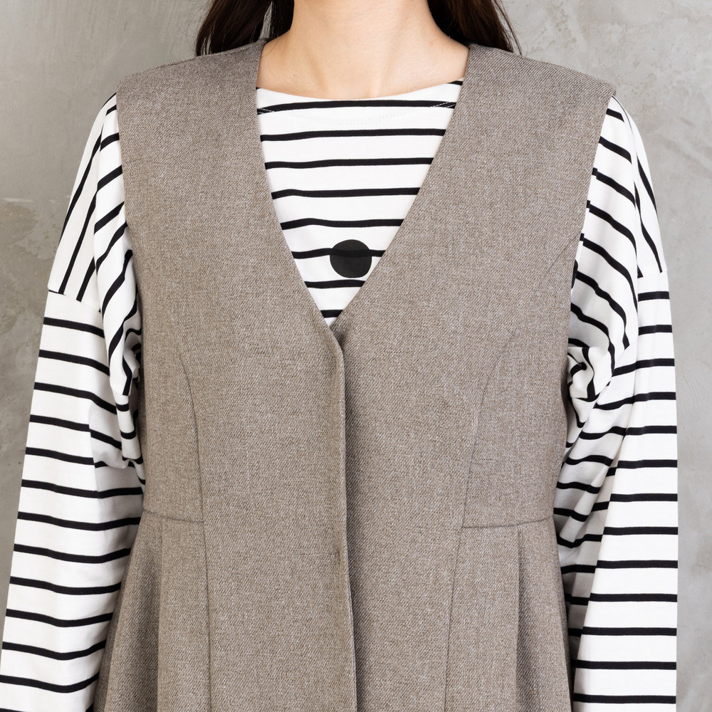 ジレの深めVネックとタックデザインが縦ラインを強調し、スタイルアップ効果を叶えます。