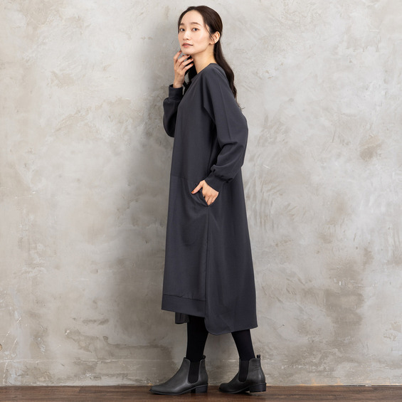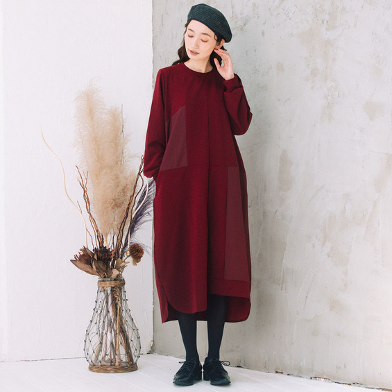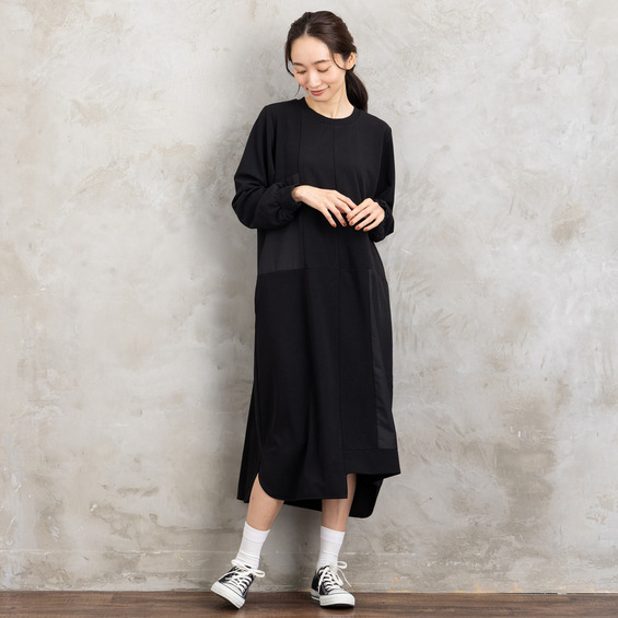【動きのあるシルエット、異素材コンビアシメワンピース】
