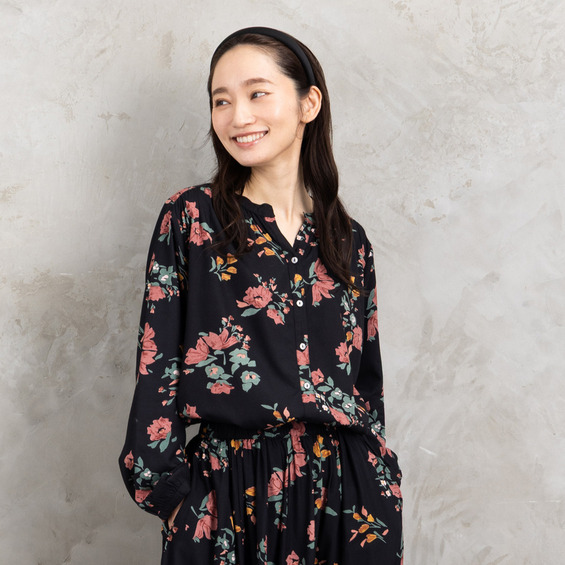 花束のようにちりばめられたフラワープリントが、装いをパッと明るく。