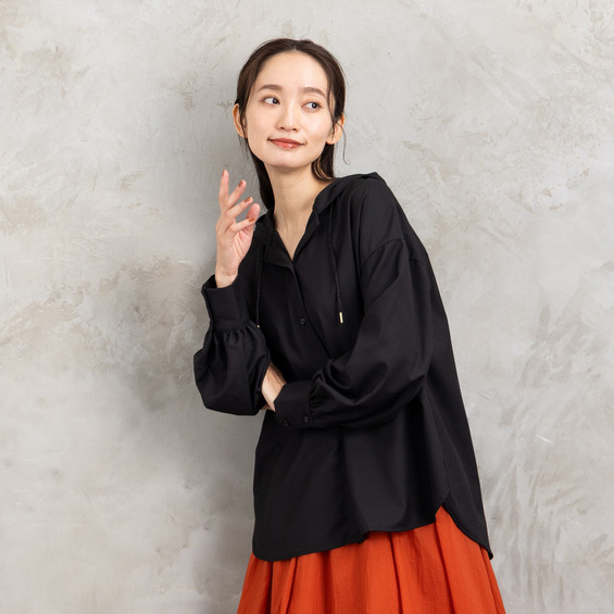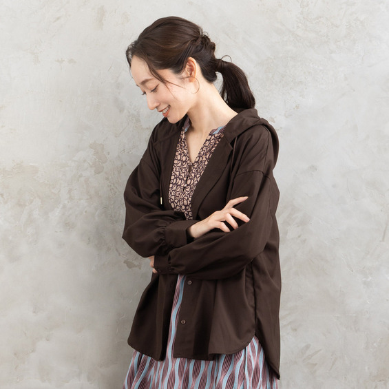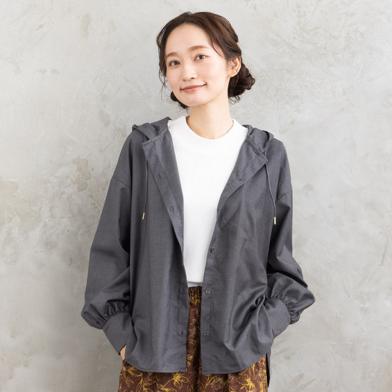 ウールのような上品な表面感を持つ軽やかな素材で仕立てた、フード付きブラウスブルゾン。