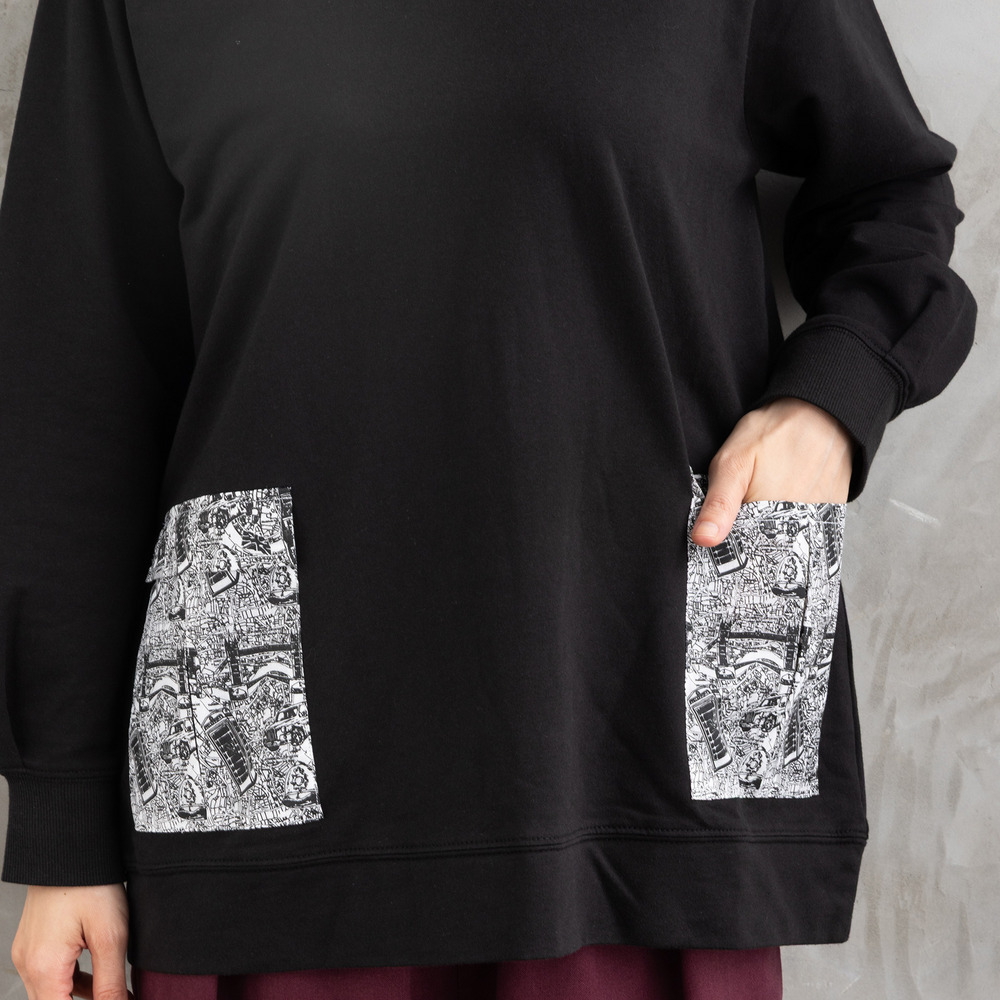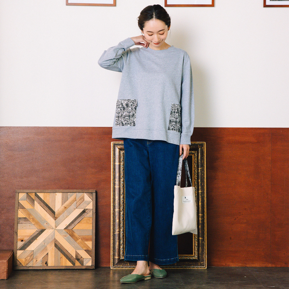 ロンドンデニムのオリジナルプリントのスレキを使用したポケットが目を引くスウェットトップス。
