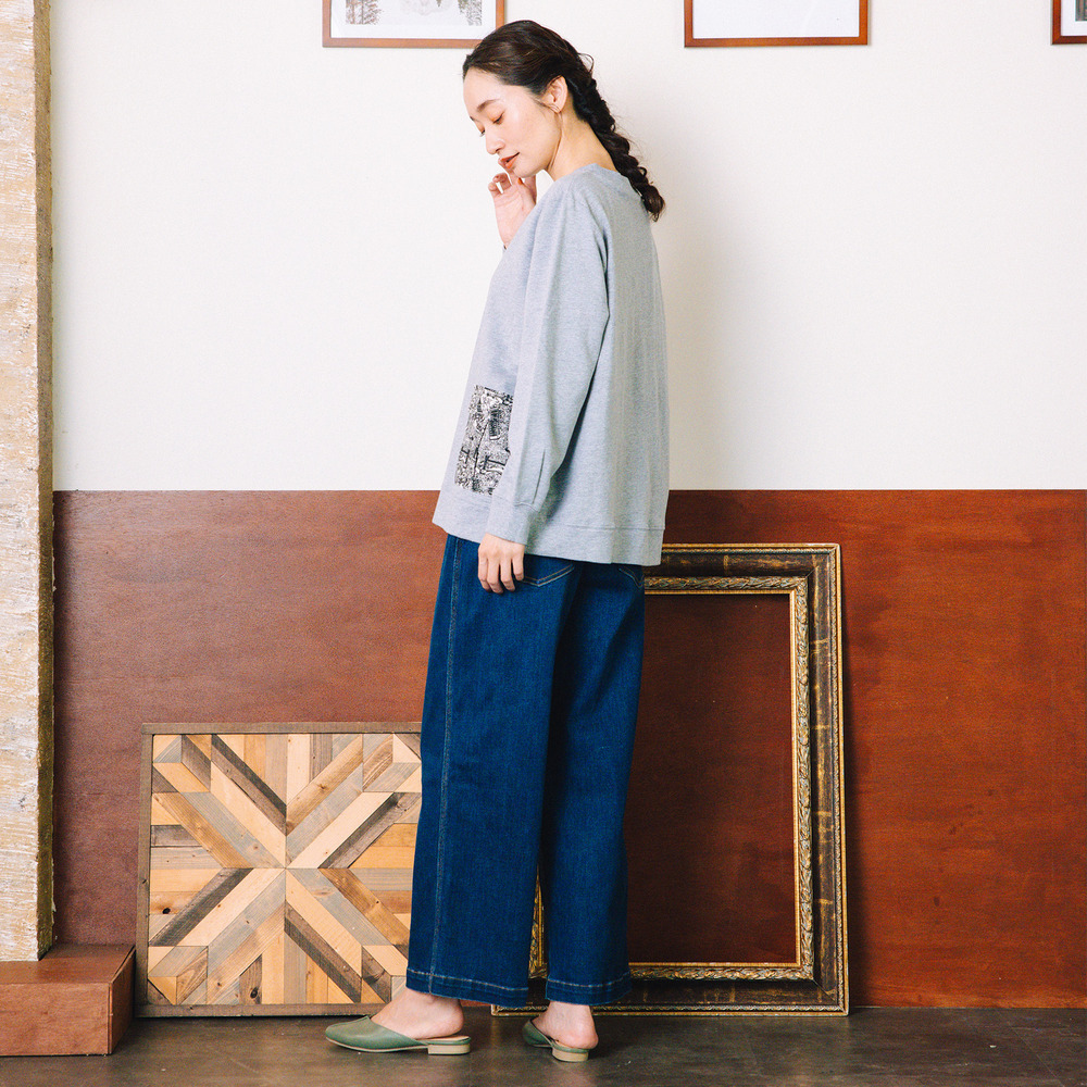 シンプルなデニムパンツやワイドパンツと合わせて、カジュアルにまとめるのが◎。