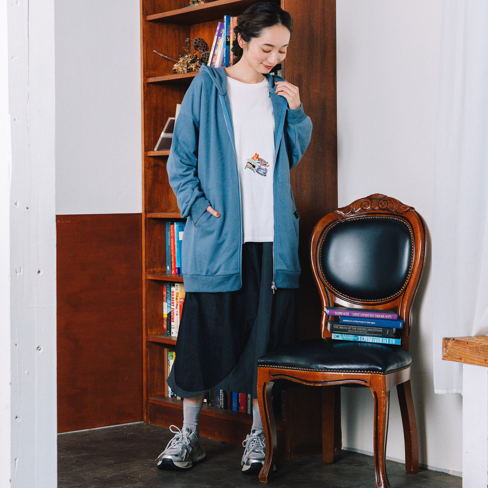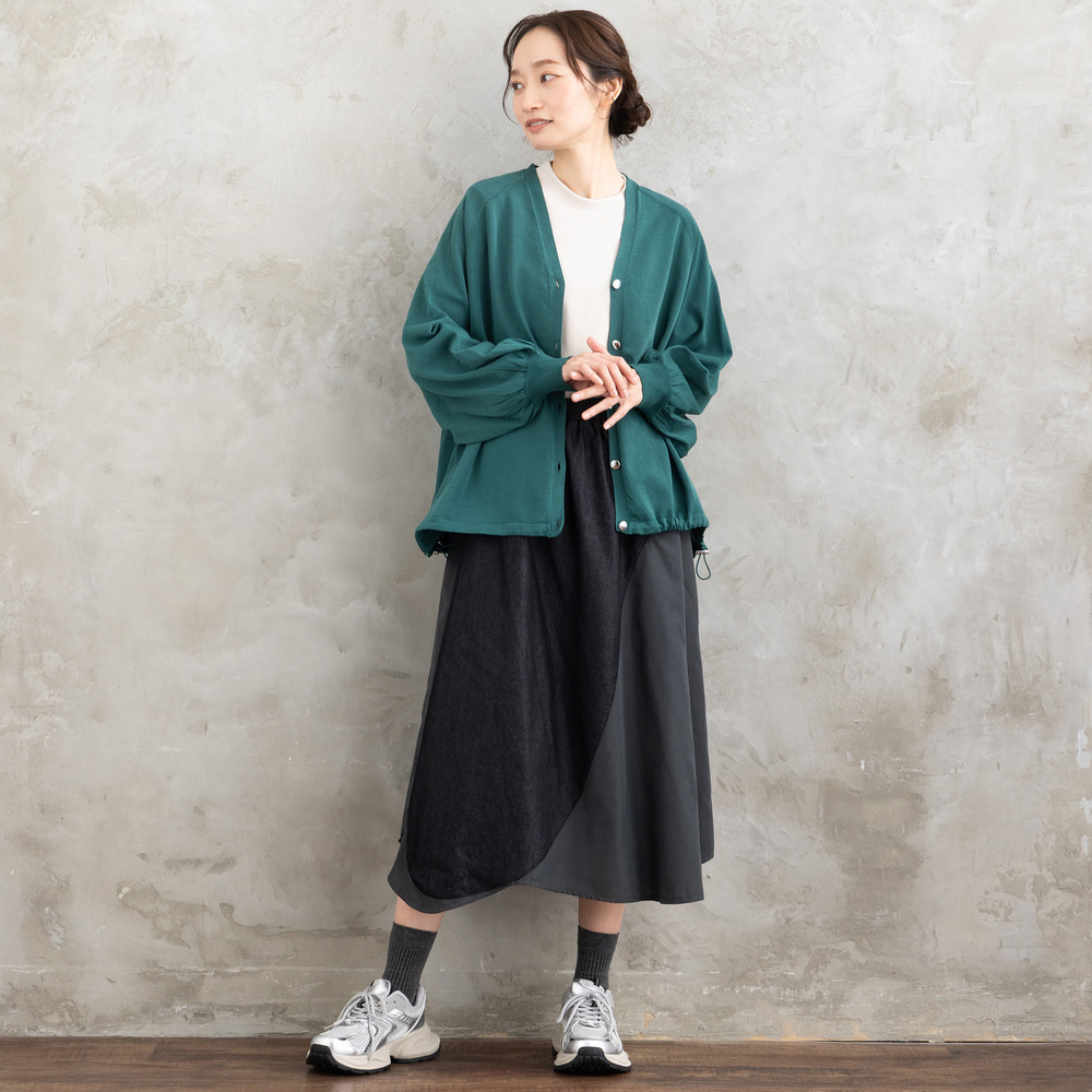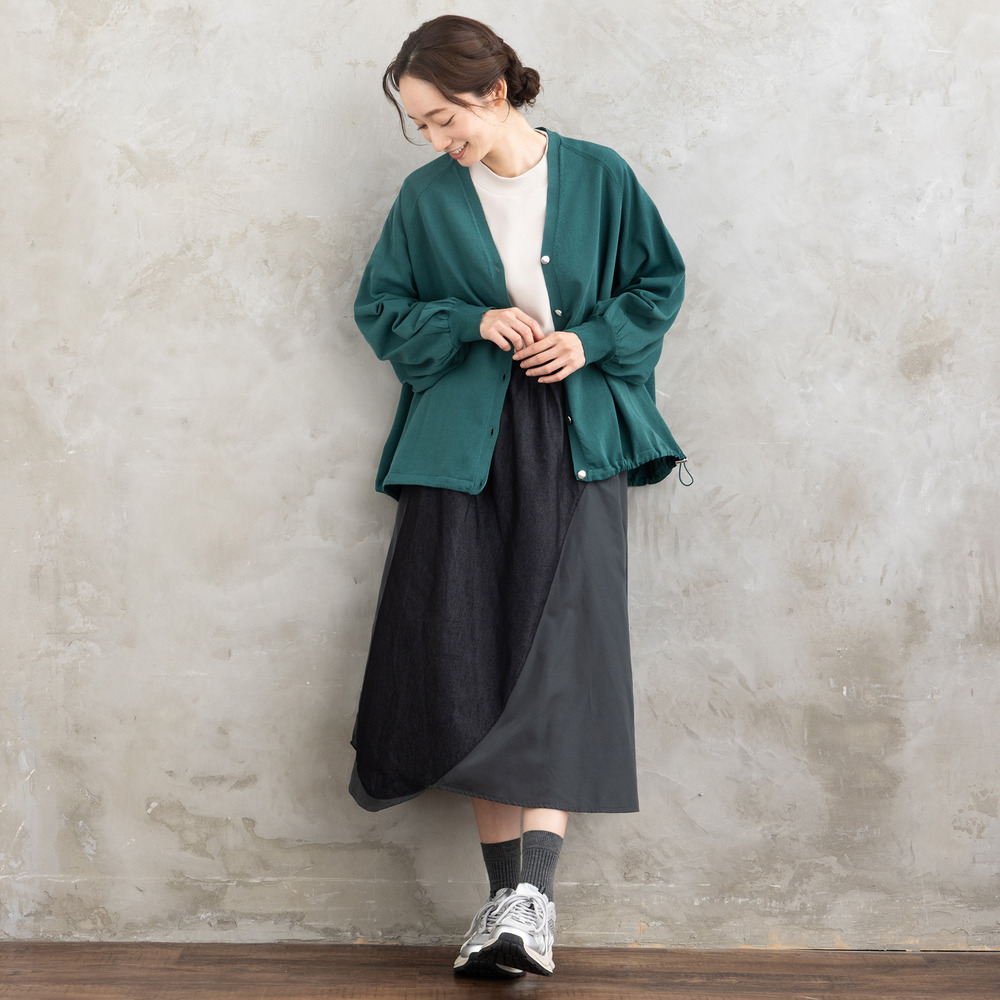 肌寒い季節にはショート丈のカーディガンやデニムジャケットを羽織ってバランスよく。