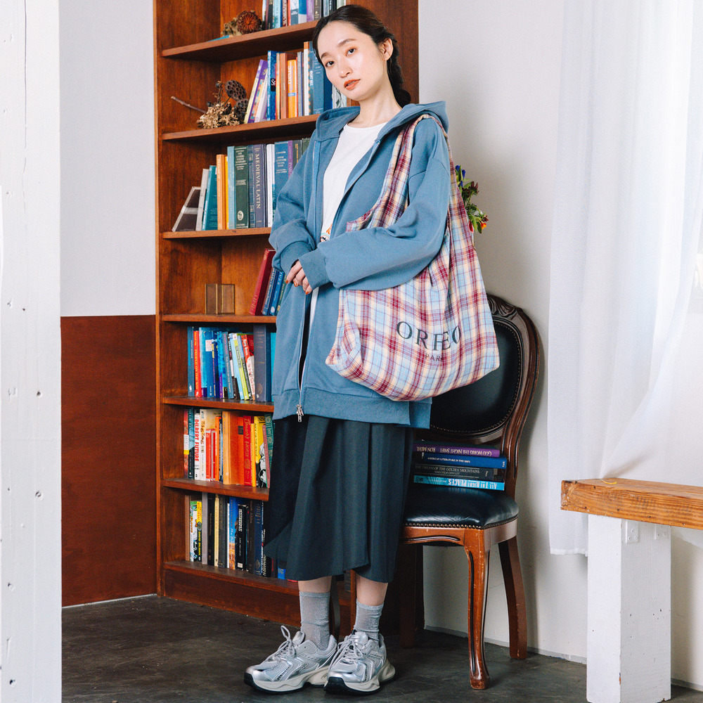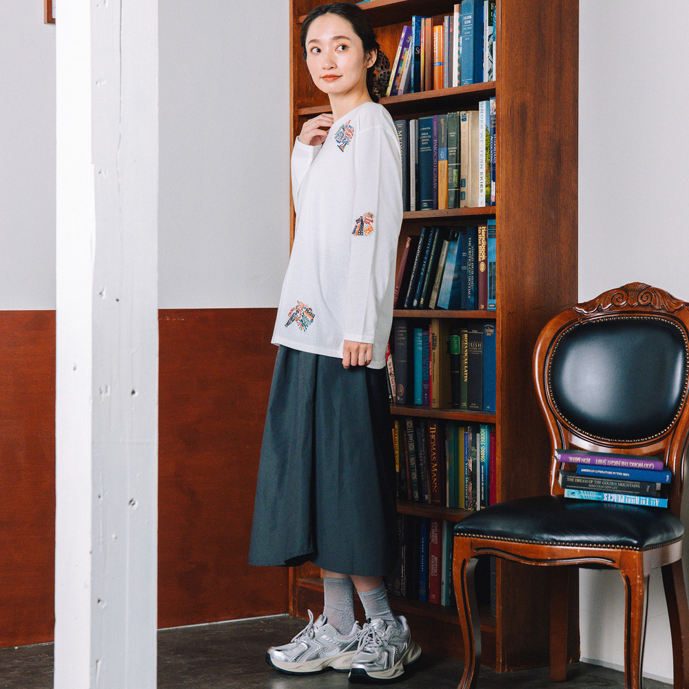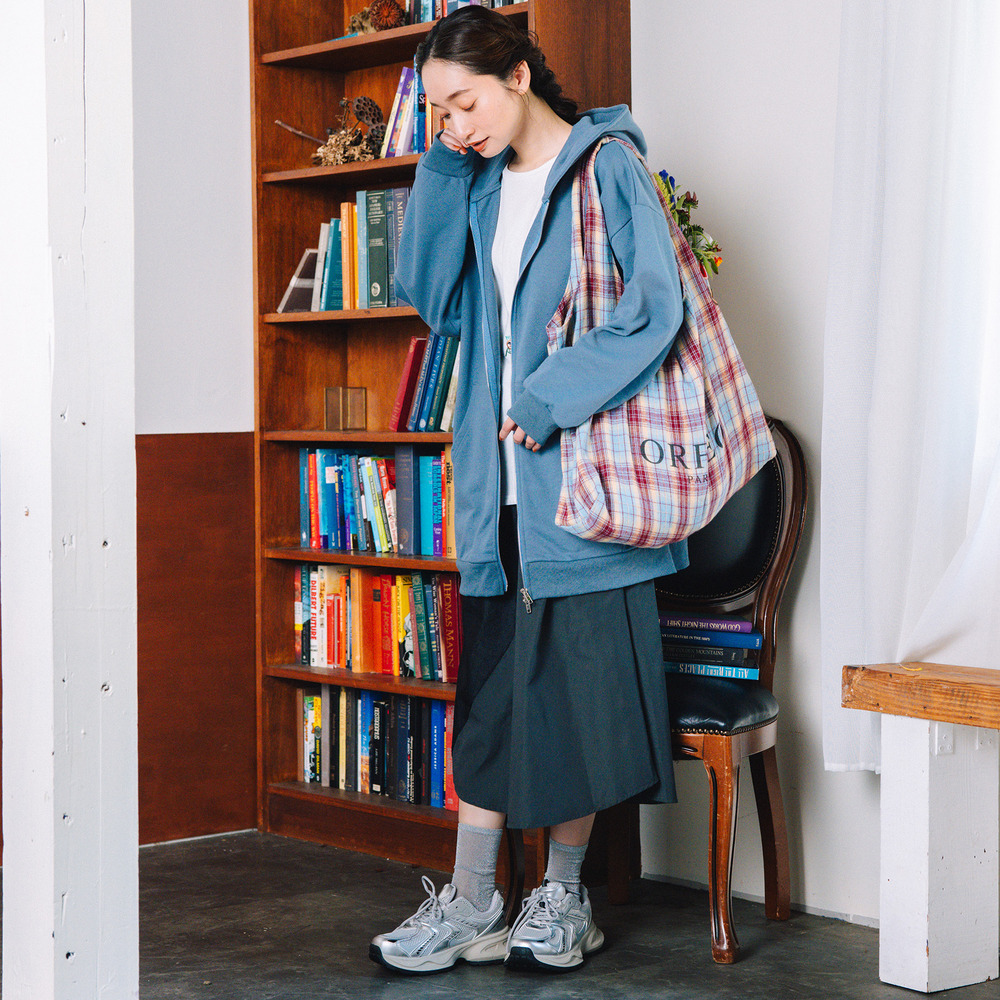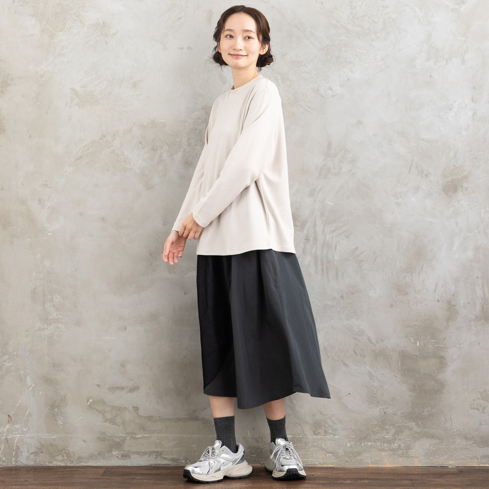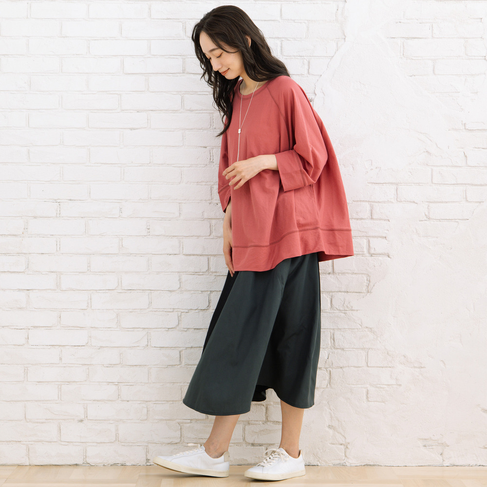 広がりすぎないバルーンシルエットで、甘くなりすぎず大人のカジュアルスタイルにぴったり。