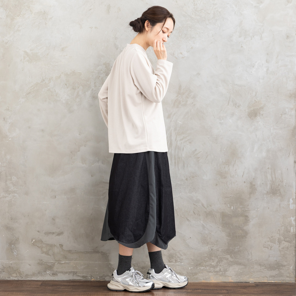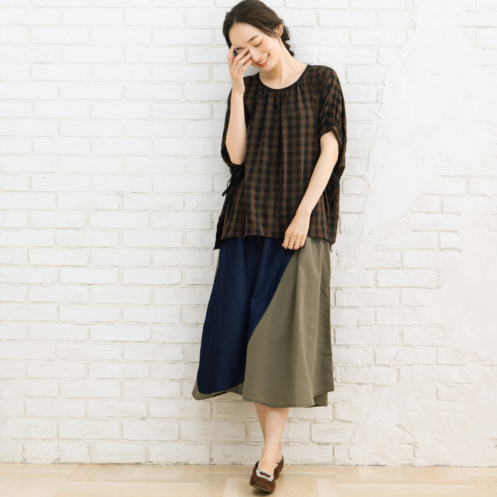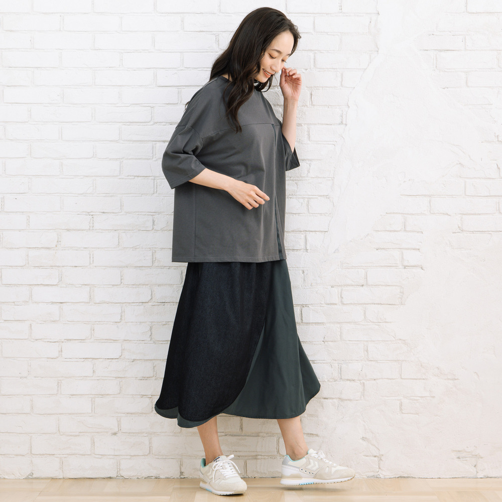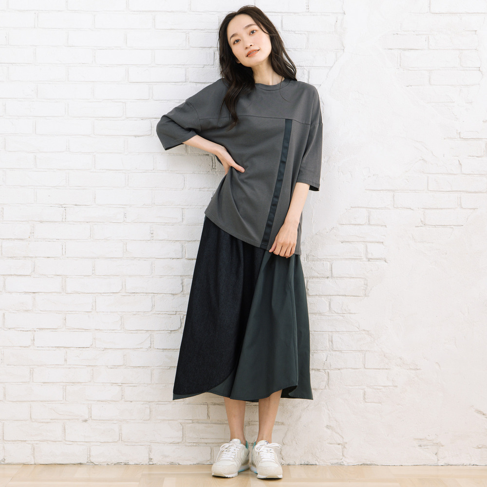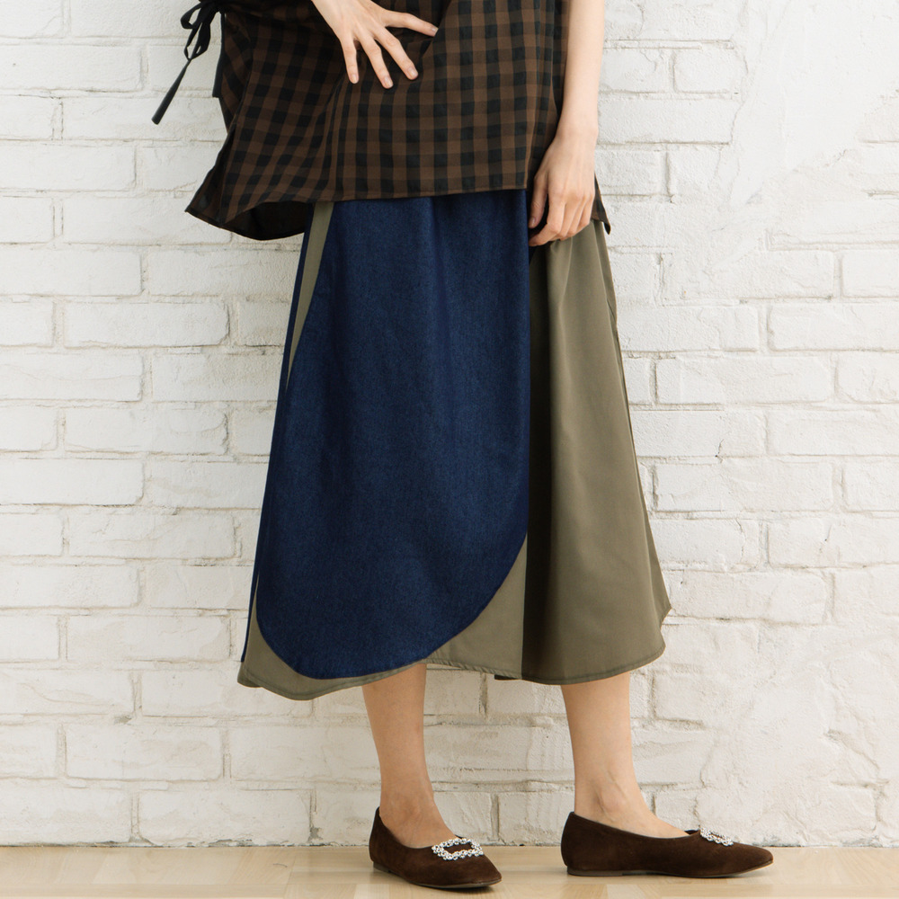 デニムと布帛の切り替えと流れるような曲線ラインが、スタイリングに動きを与えてくれます。