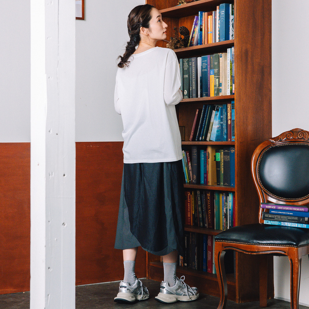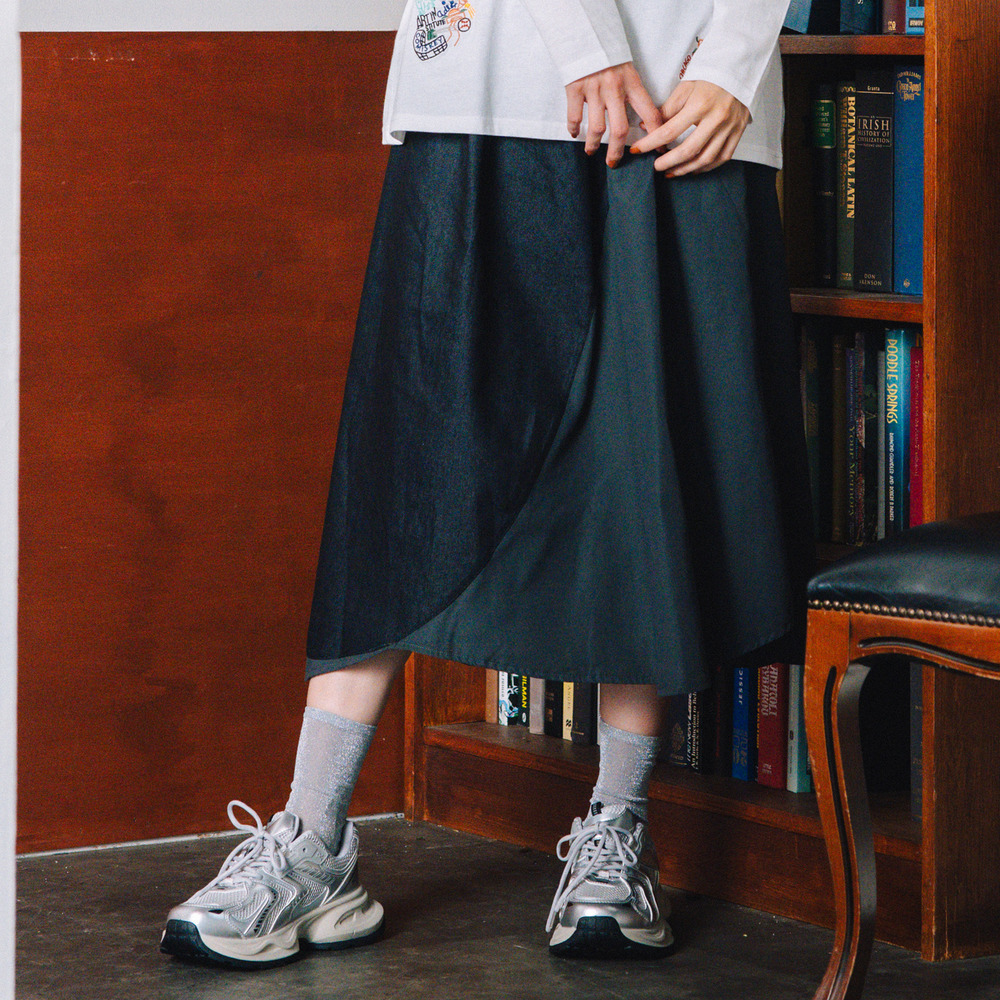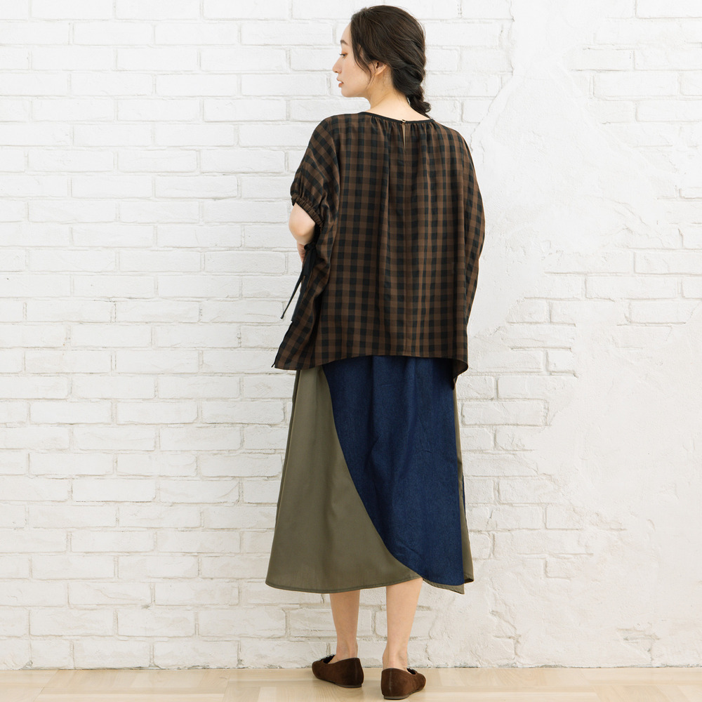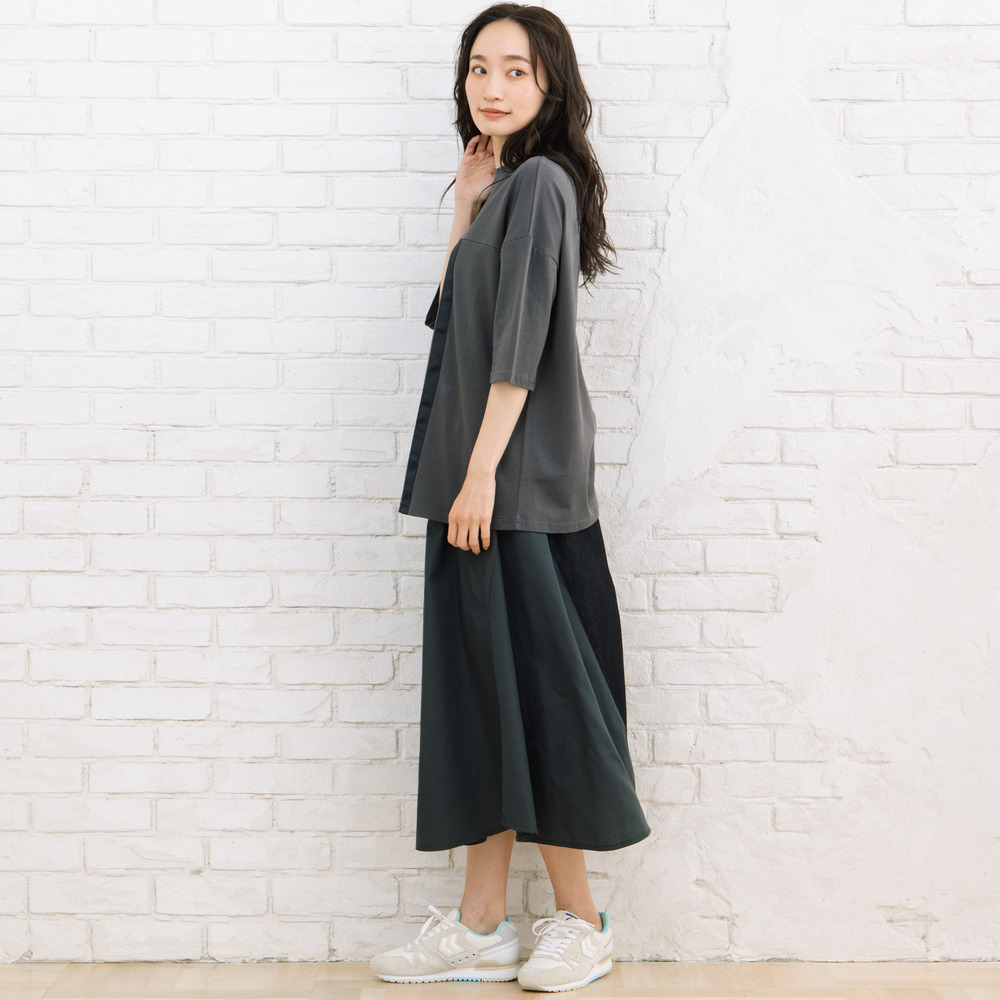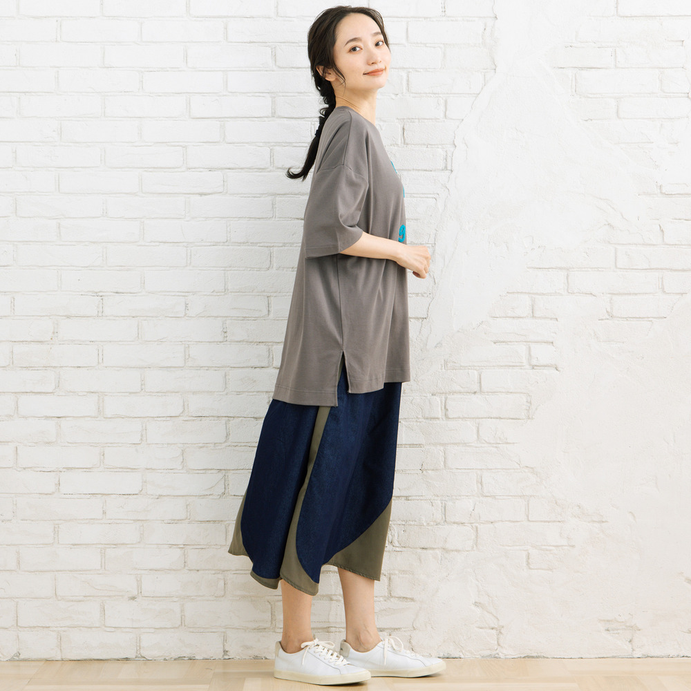 デニムと布帛の切り替えと流れるような曲線ラインが、スタイリングに動きを与えてくれます。