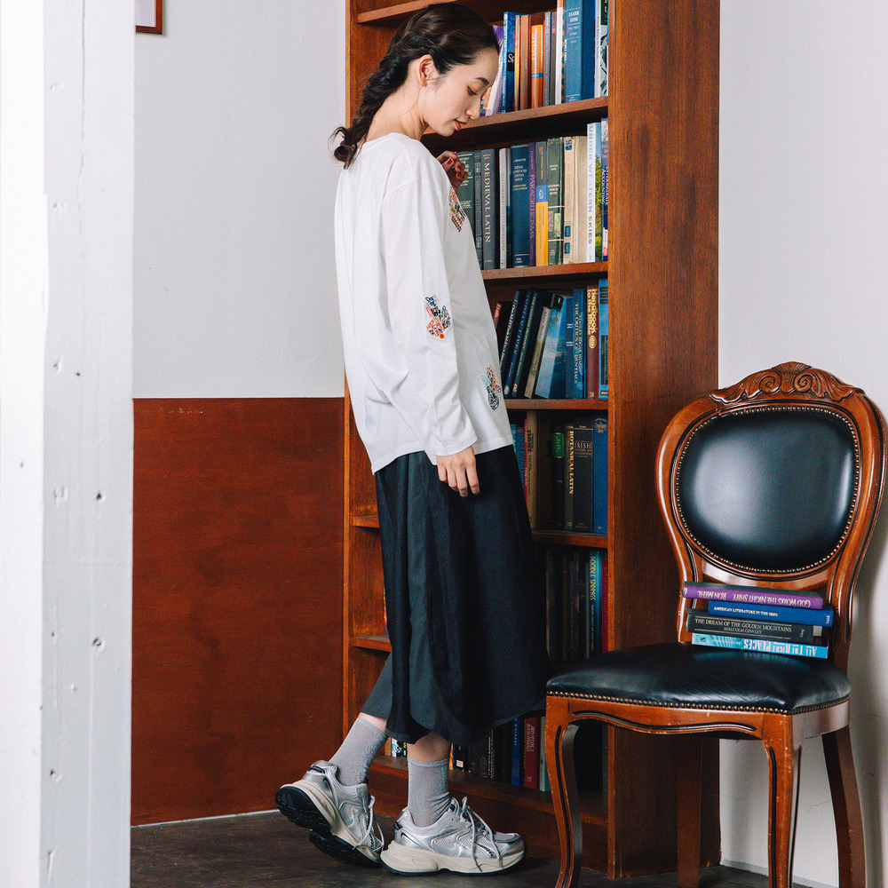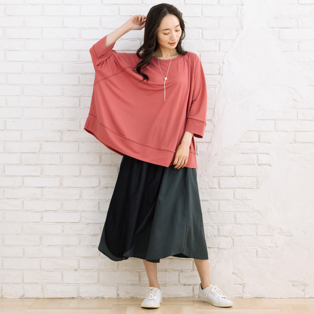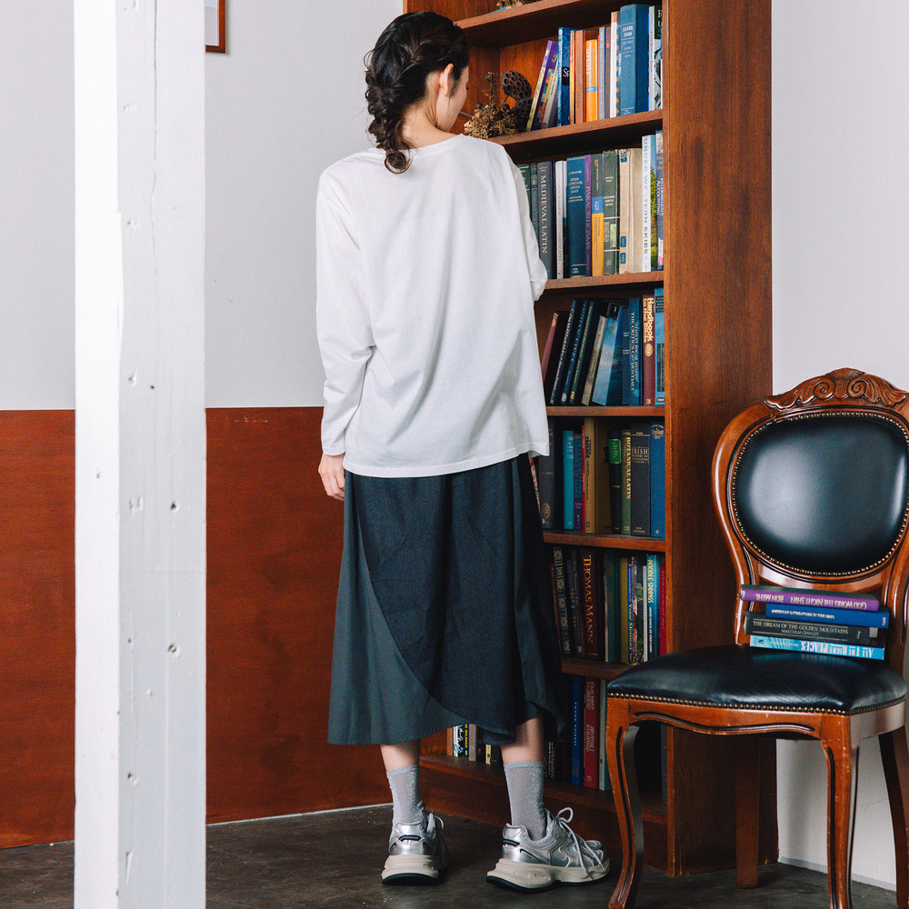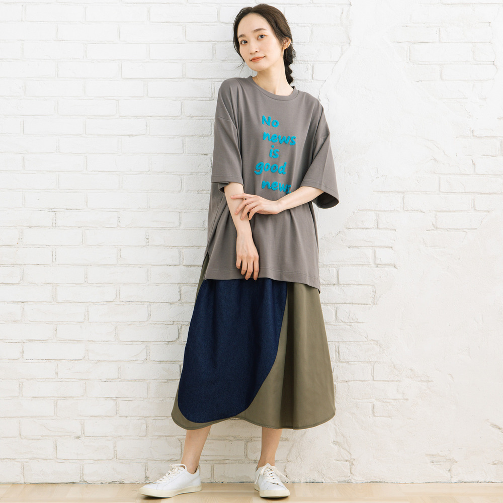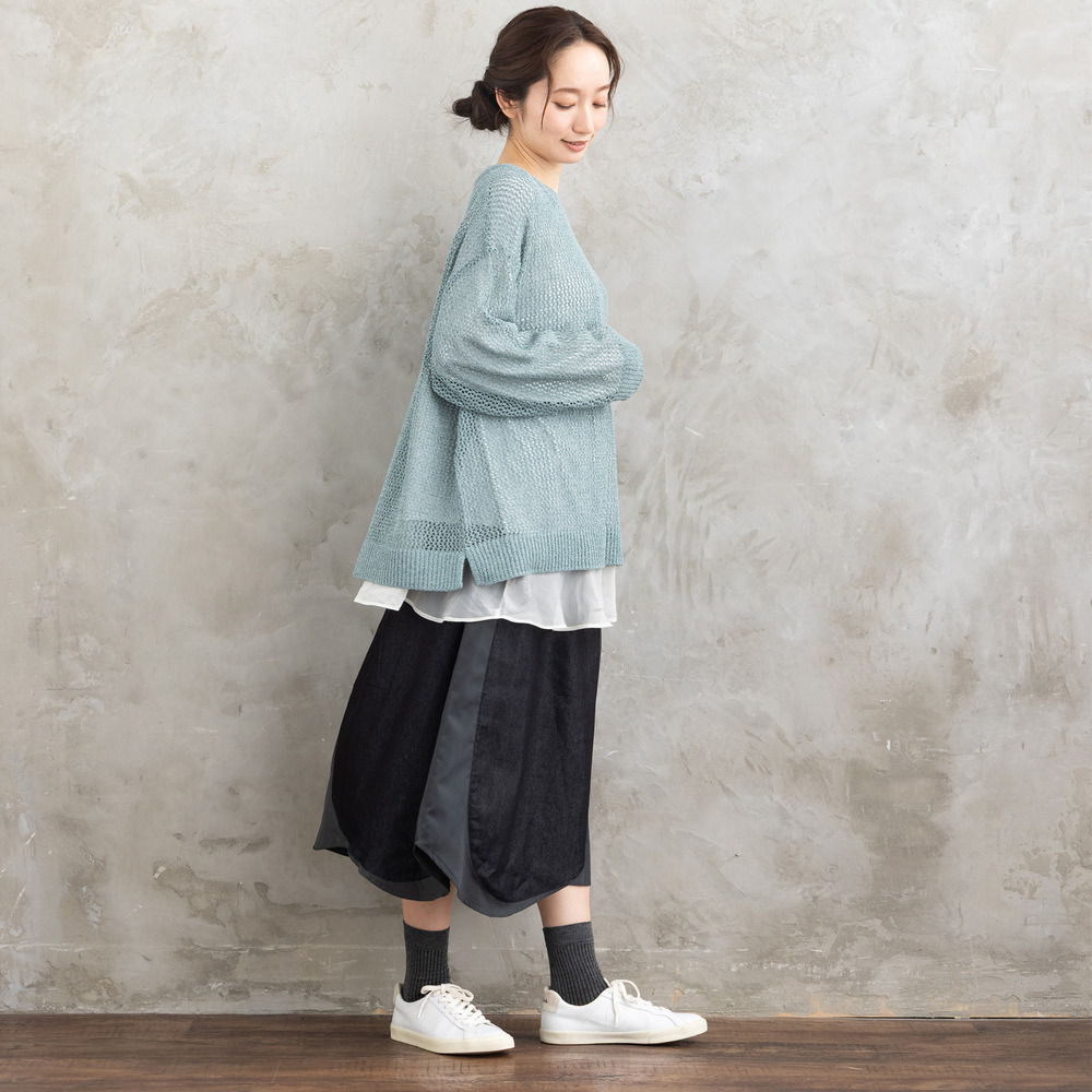 デニムと布帛の切り替えと流れるような曲線ラインが、スタイリングに動きを与えてくれます。