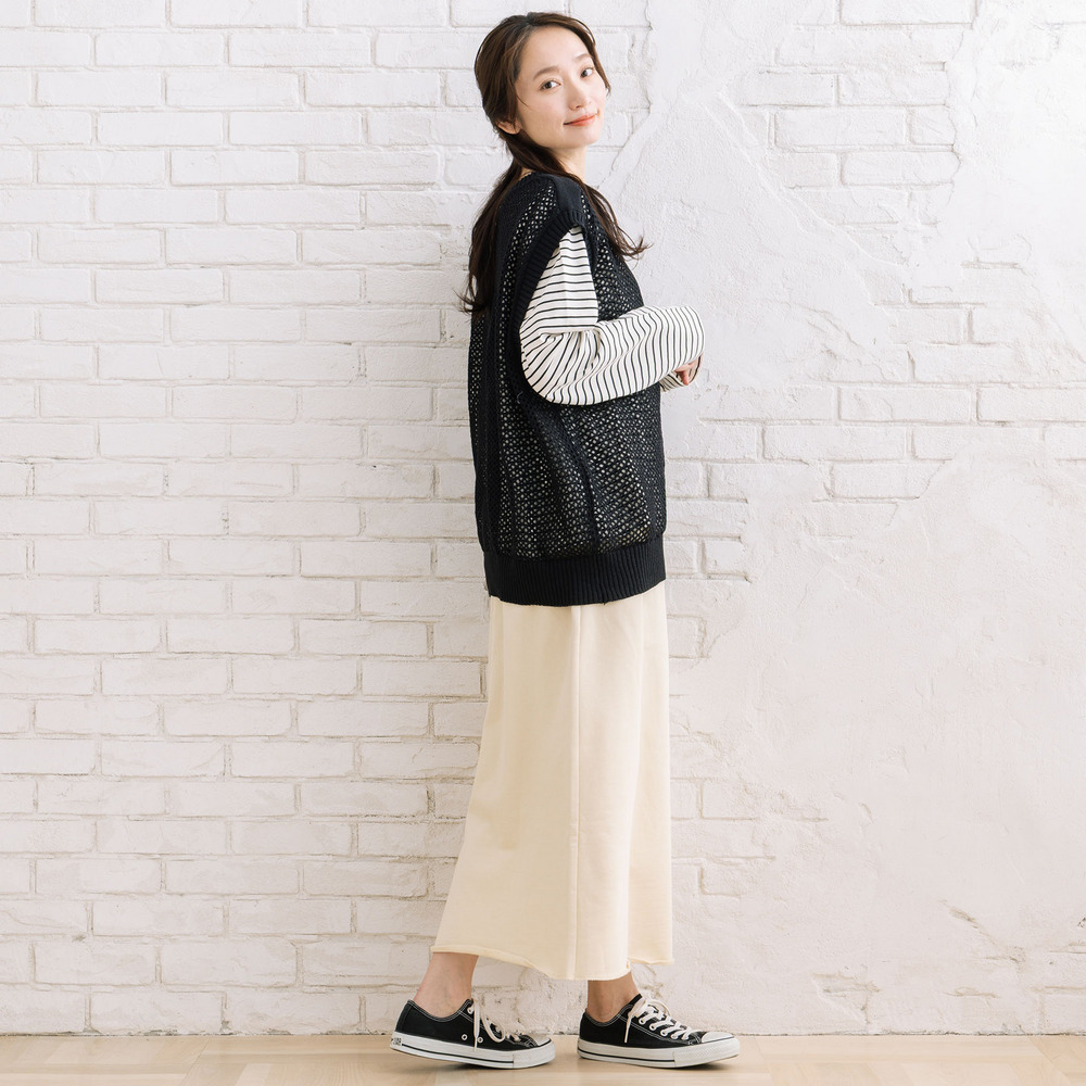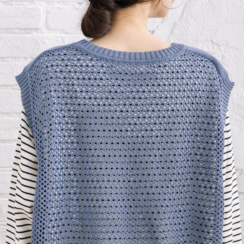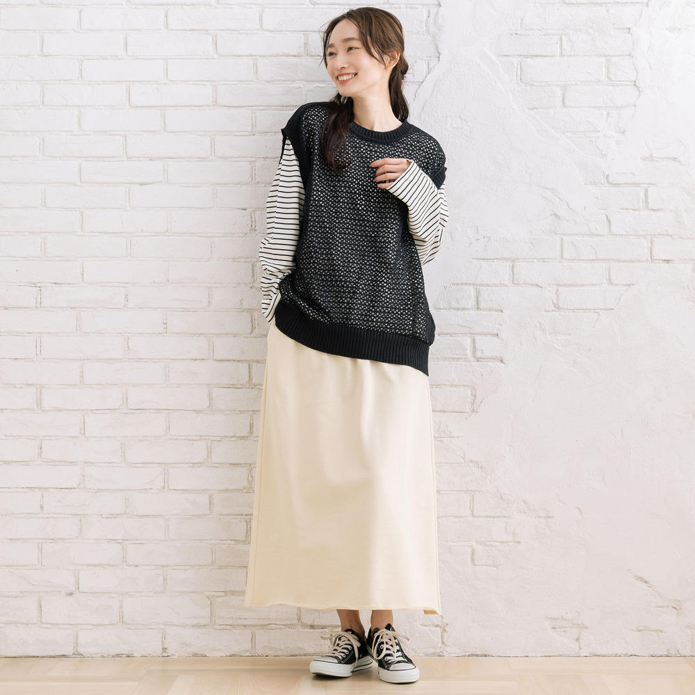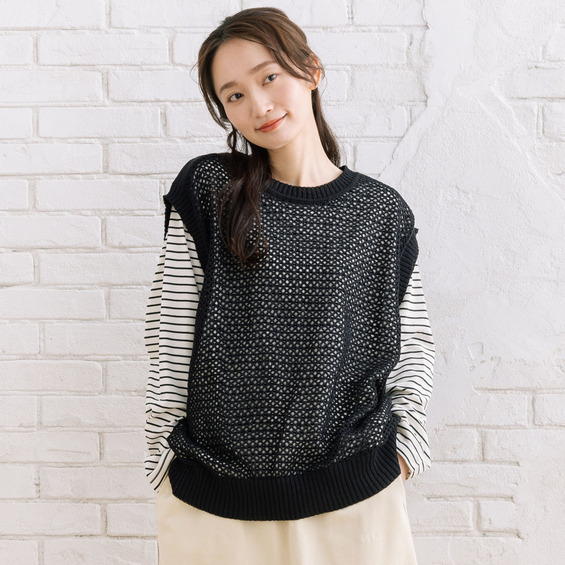 メッシュ編みのニットベストと、ボーダーカットソーを組み合わせたセットアイテム。
