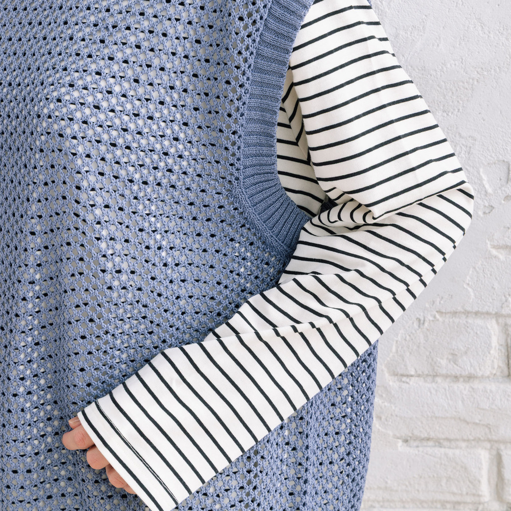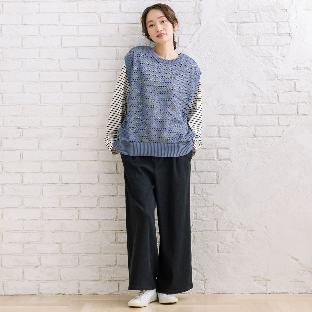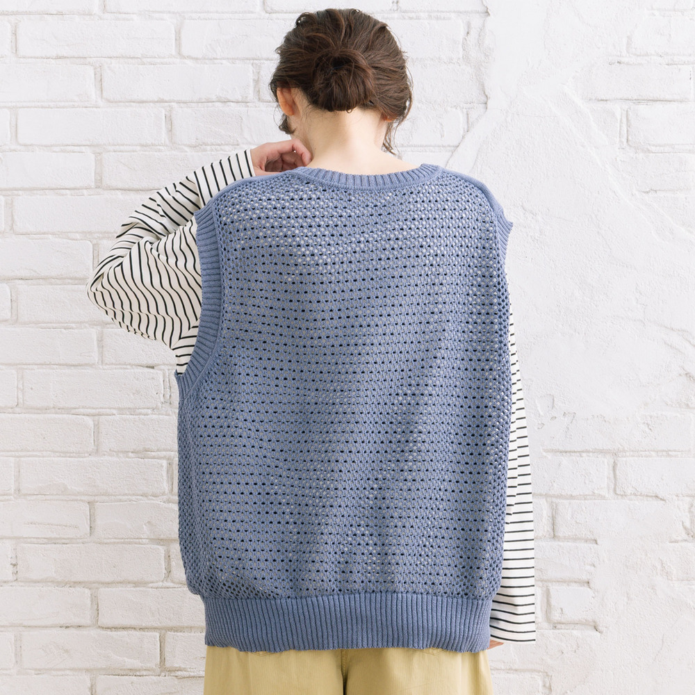 メッシュ編みのニットベストと、ボーダーカットソーを組み合わせたセットアイテム。