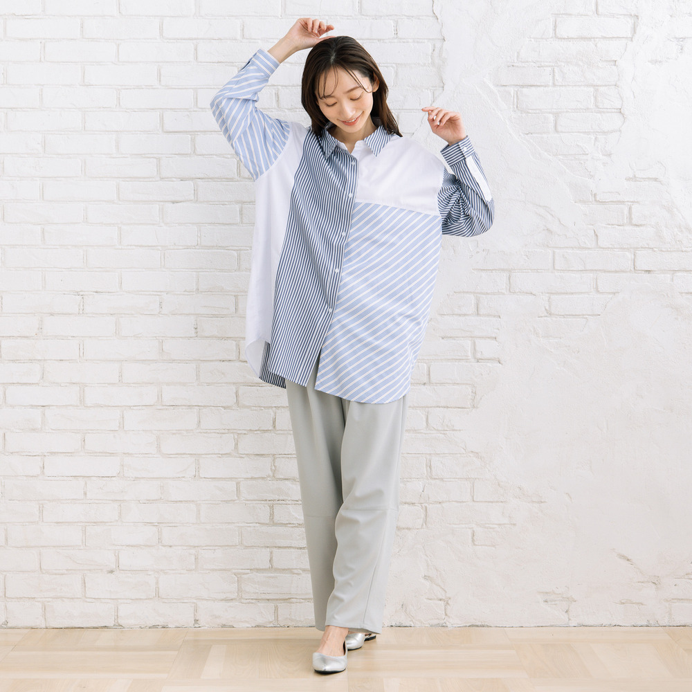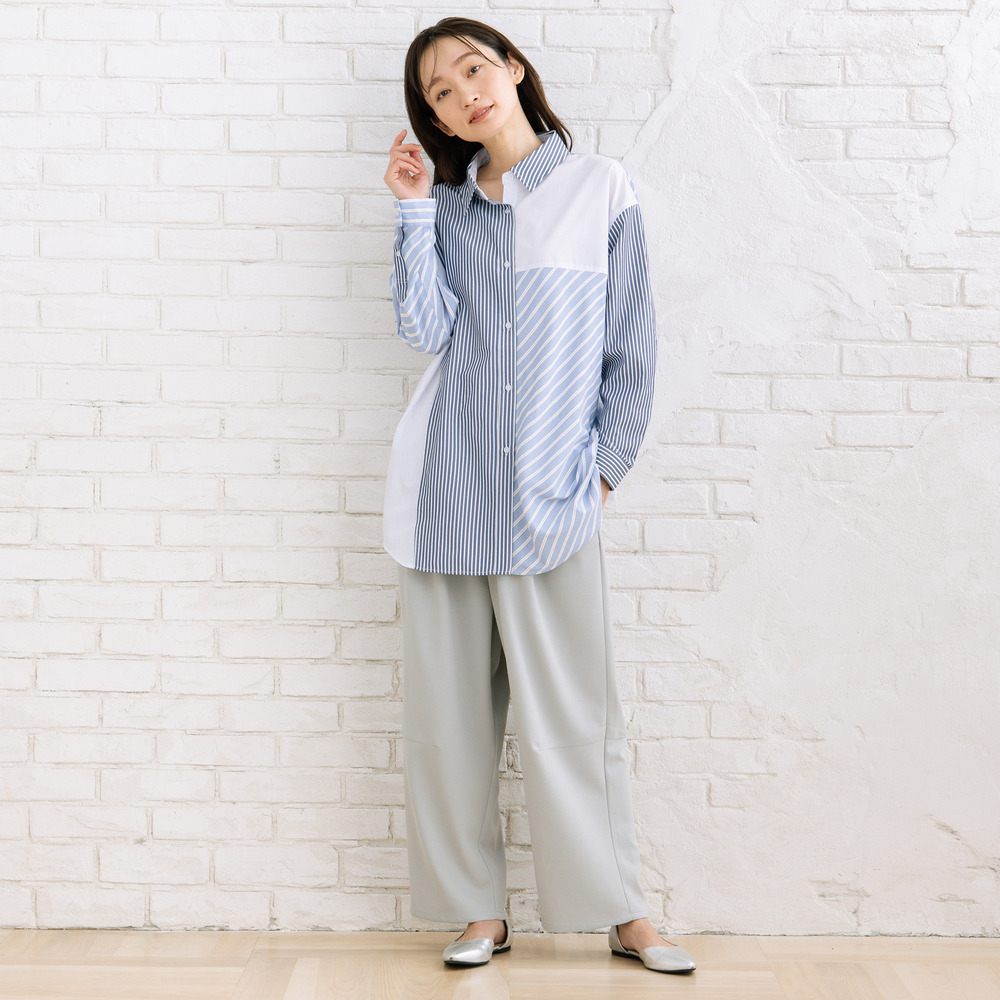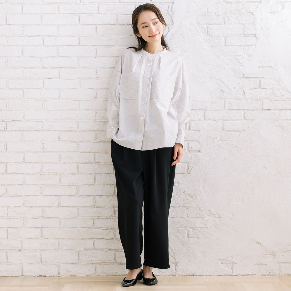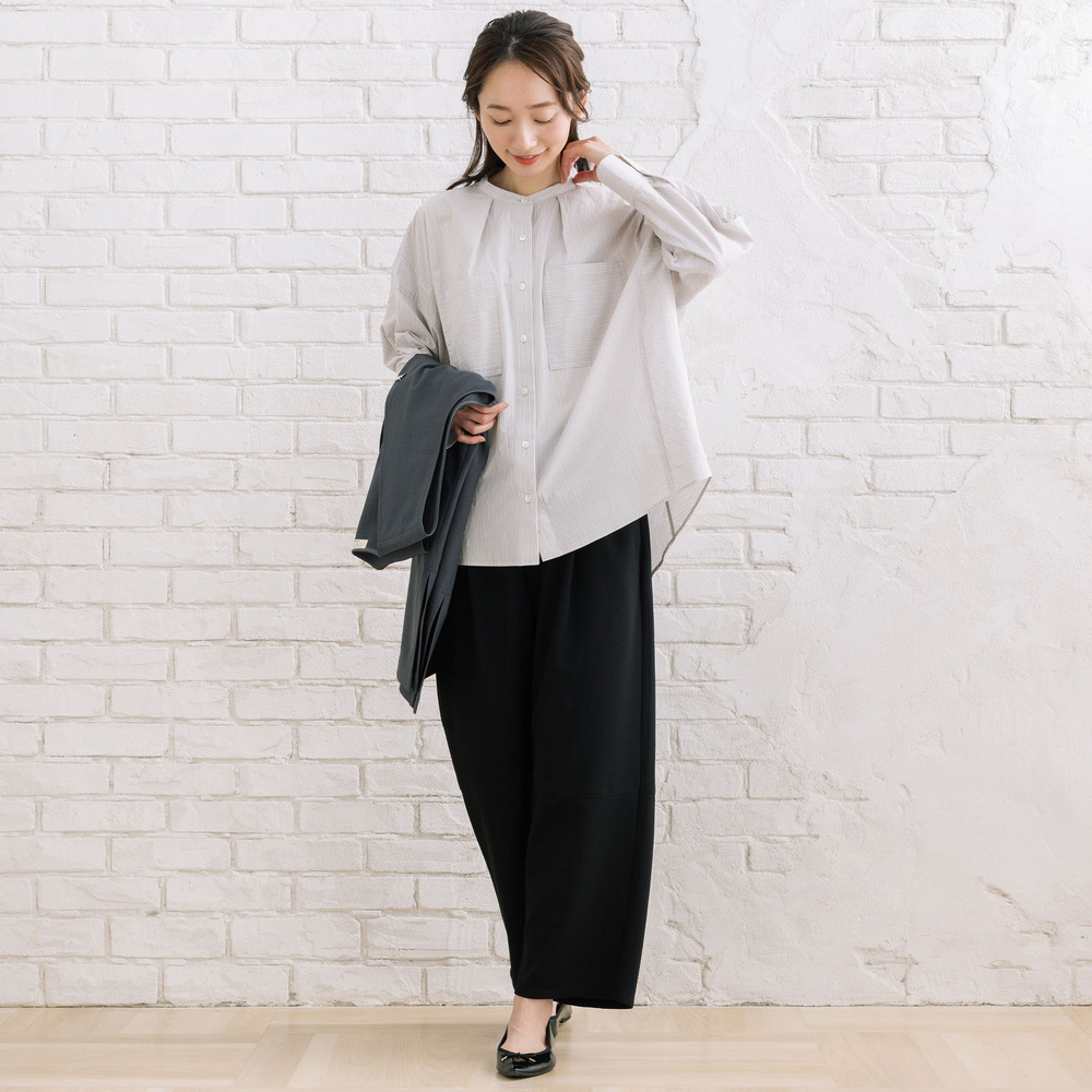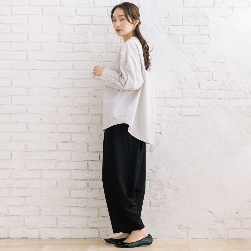 ・タック入りワイドシルエットで体のラインを拾いにくい