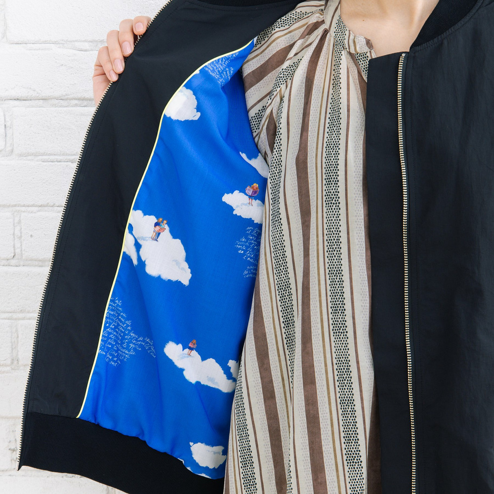 コンパクトなシルエットに、裏地のマチルダプリントがさりげない遊び心を添える一着。