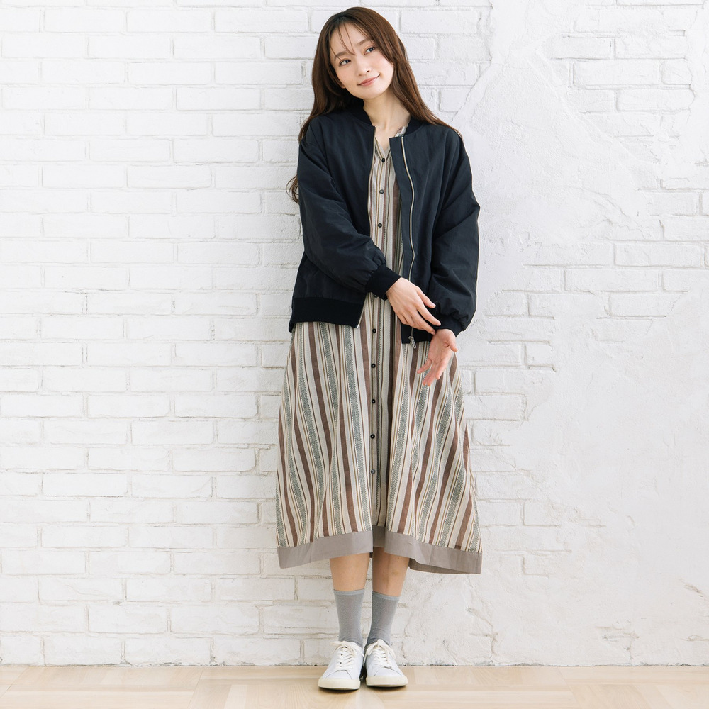 ワンピースやロングスカートに羽織って、ミックス感のあるスタイルに。