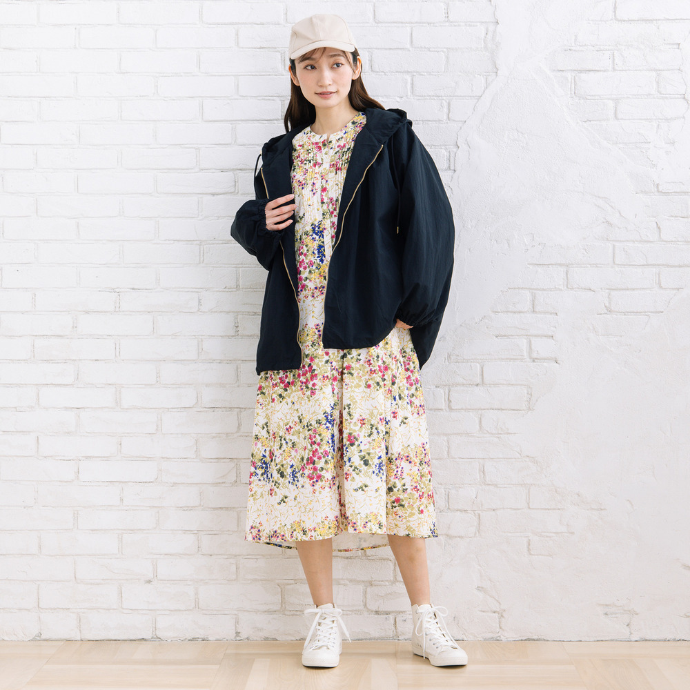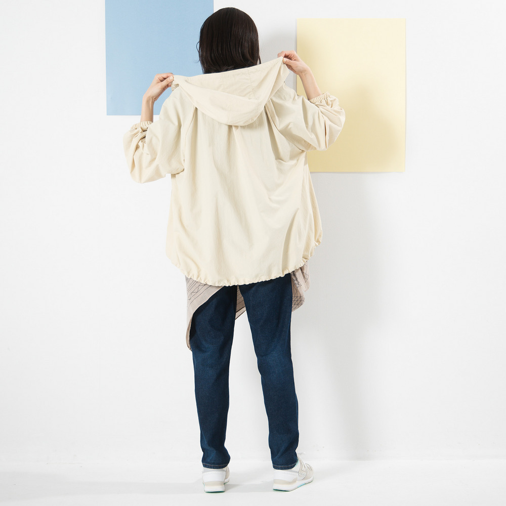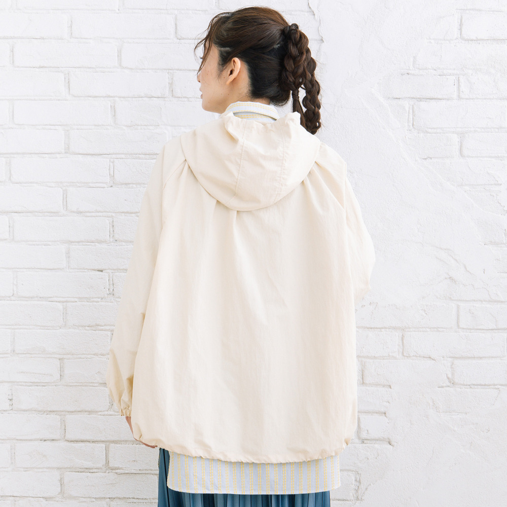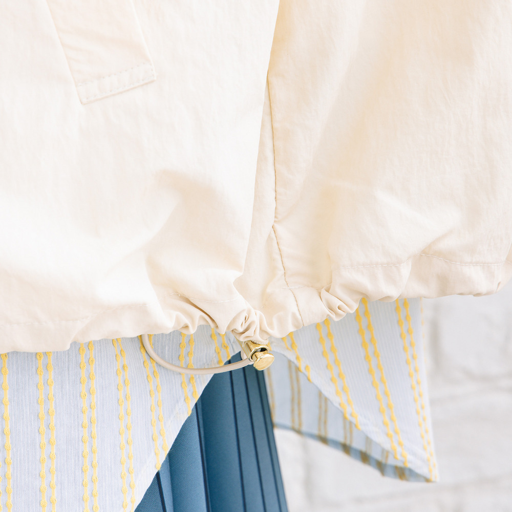 シャリ感のあるナイロンタフタ素材が、さっと羽織るだけでこなれた印象に。
