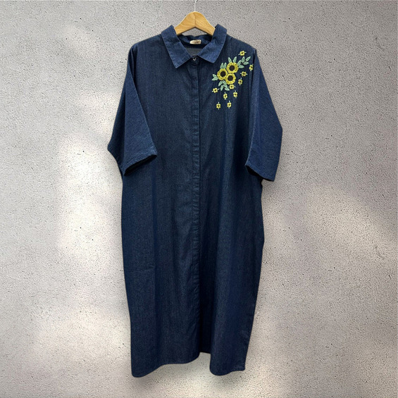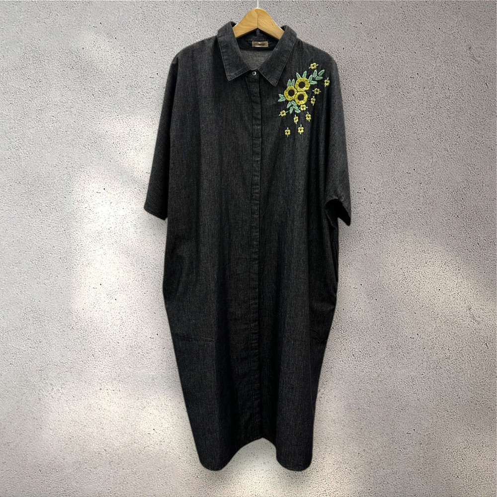 【さりげない華やかさを添える、ワンポイントフラワーエンブロイダリーデニムワンピース】