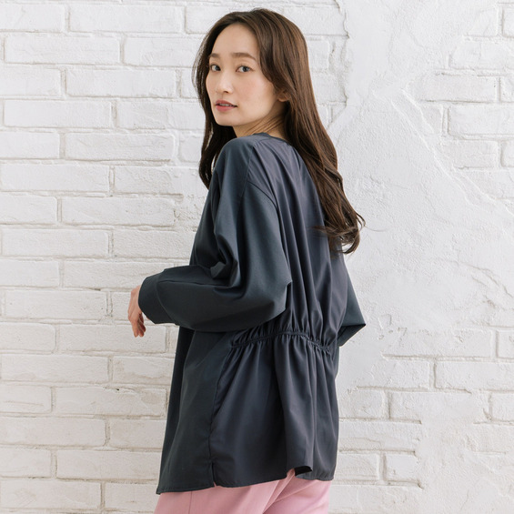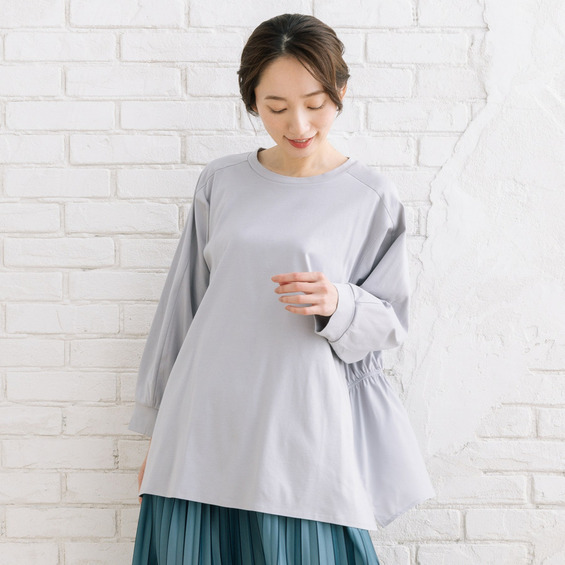 サイドに施したギャザー切り替えが、動きのあるシルエットとさりげない華やかさを演出します。