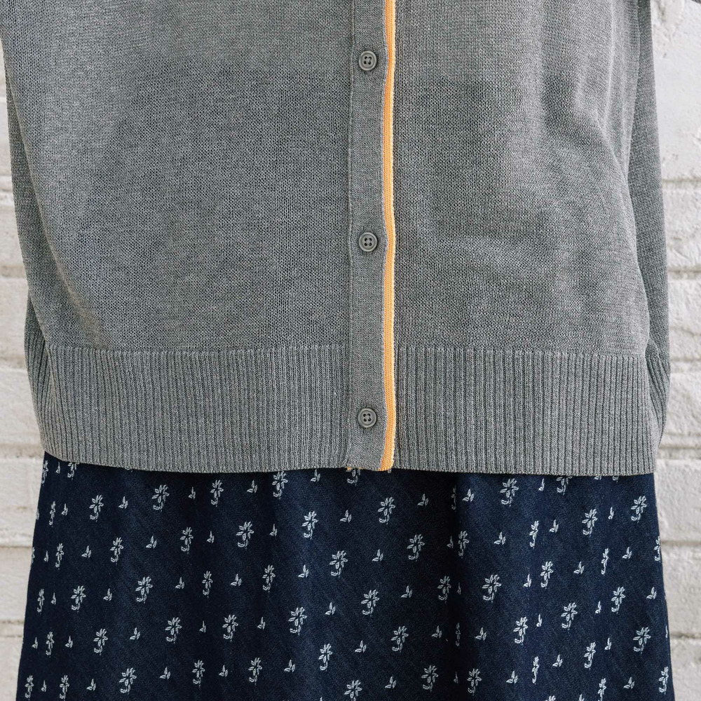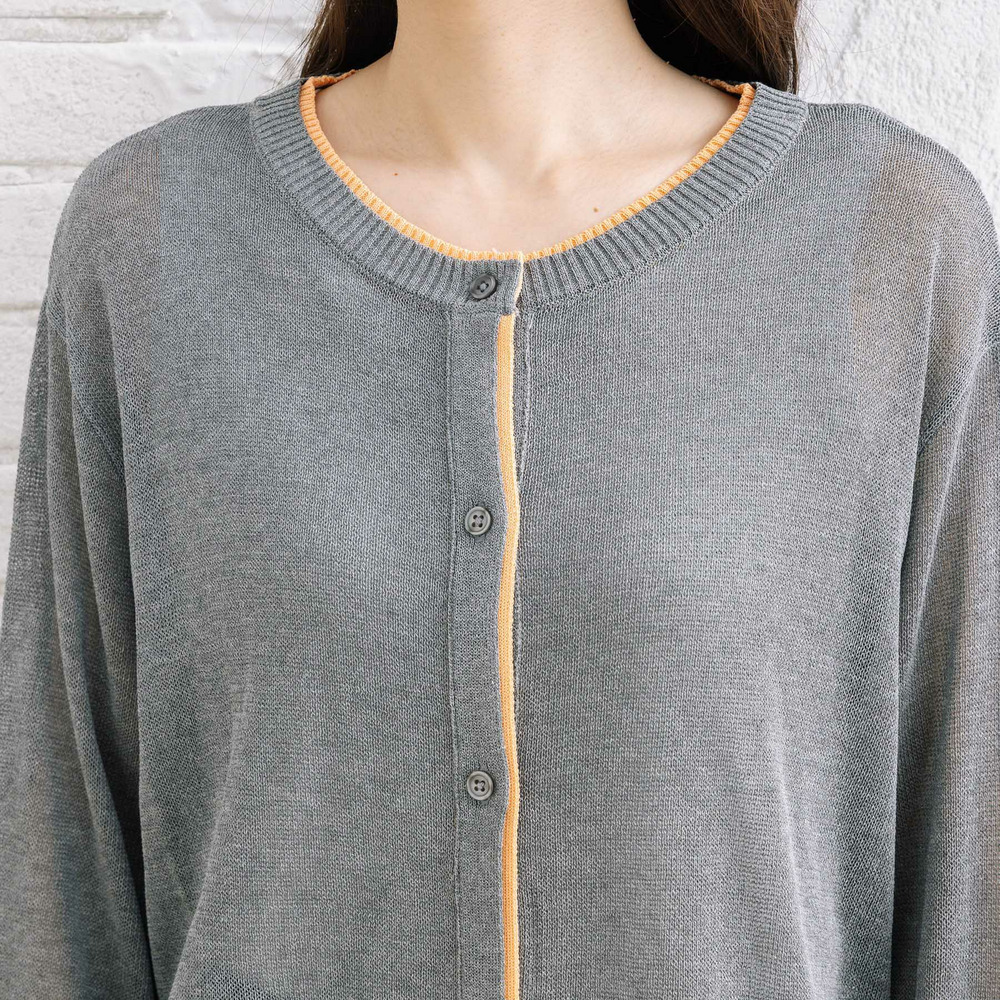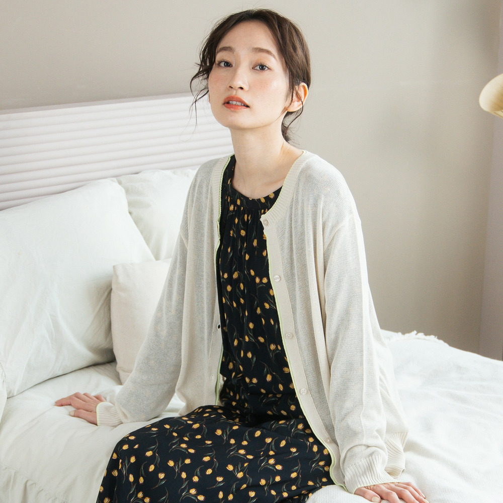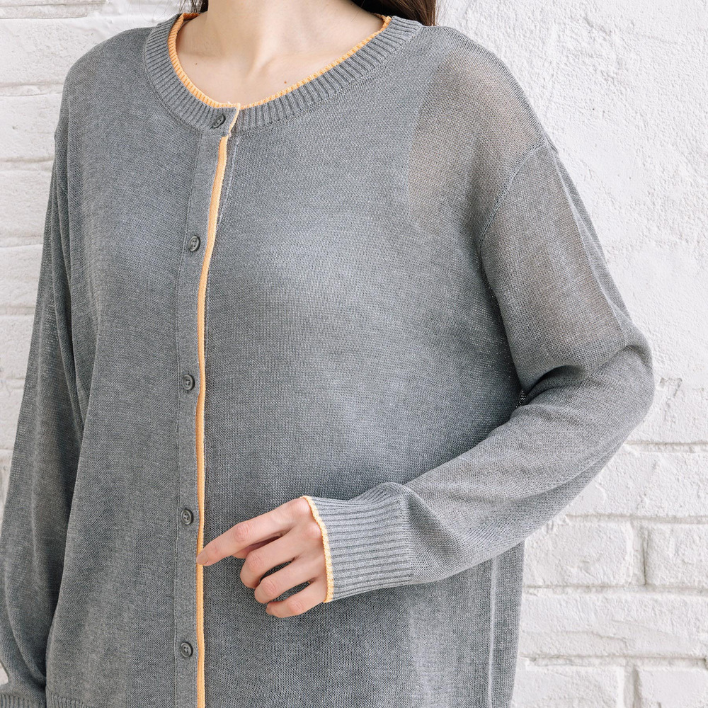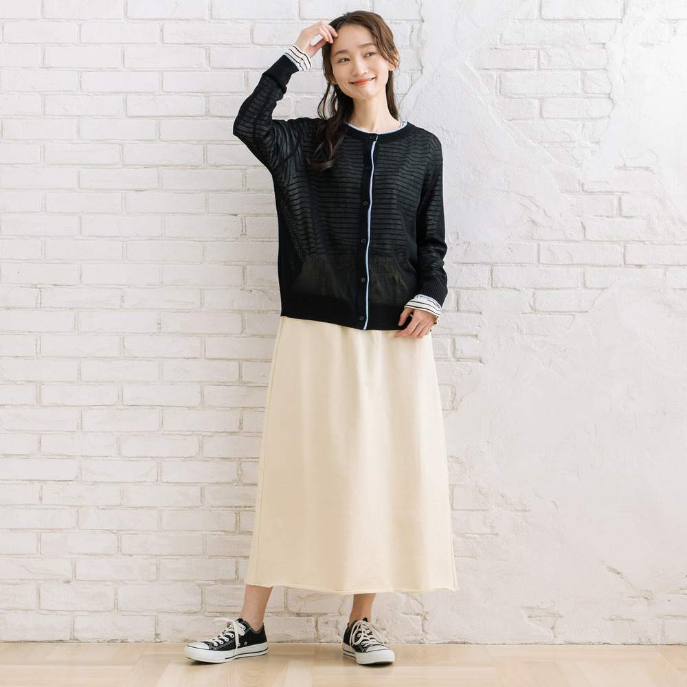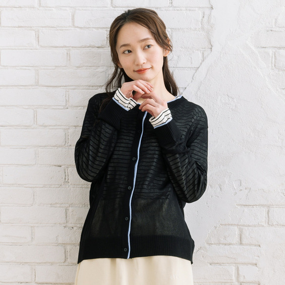 ほんのり透け感のあるシアー素材に、配色ラインを効かせた軽やかなカーディガン。