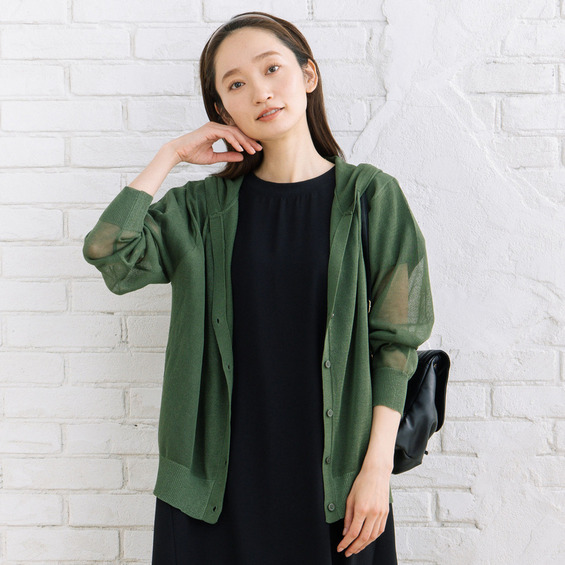 ほんのり透ける軽やかな素材感が魅力のフーディーカーディガン。