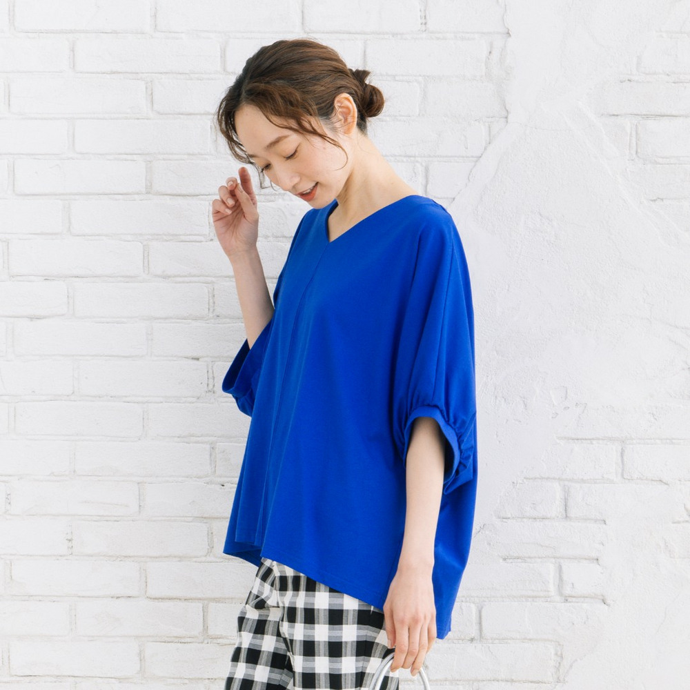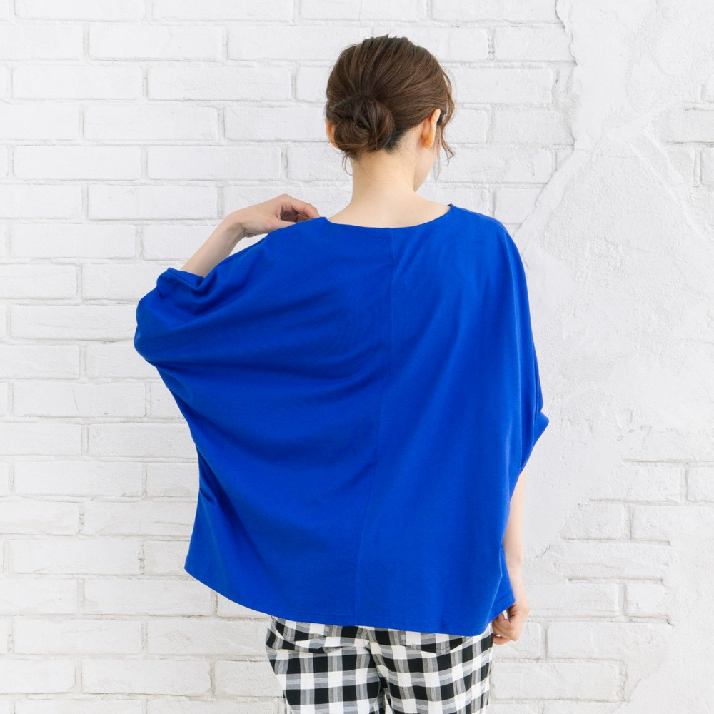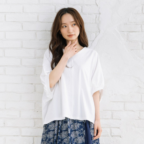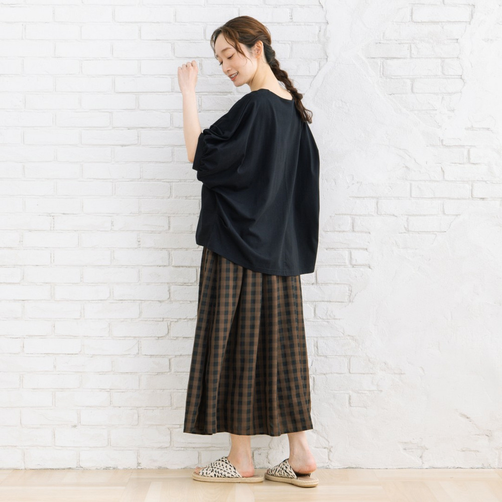 ドルマンスリーブとゆったりした身幅が体のラインを拾いにくく、リラックス感がありながらすっきり見えるのも魅力。