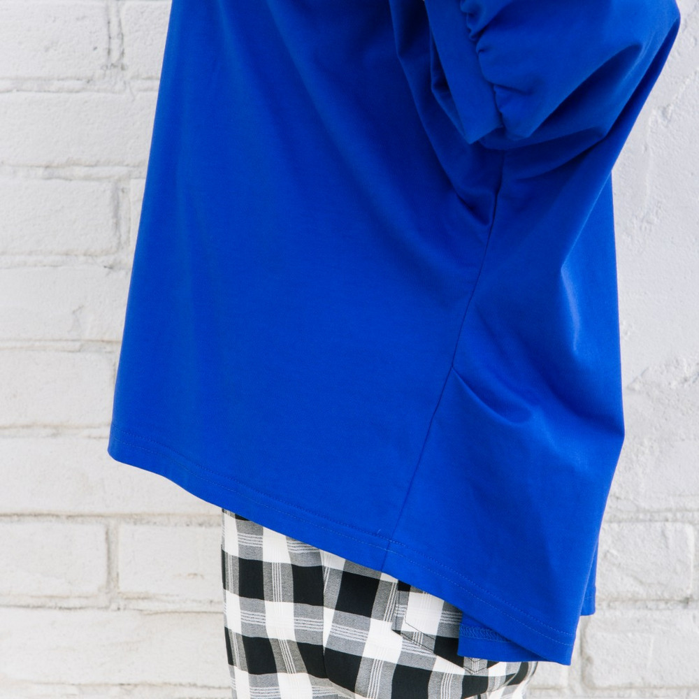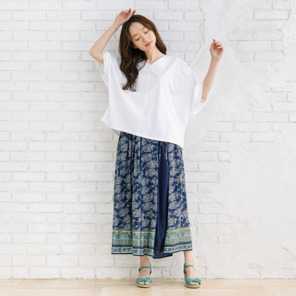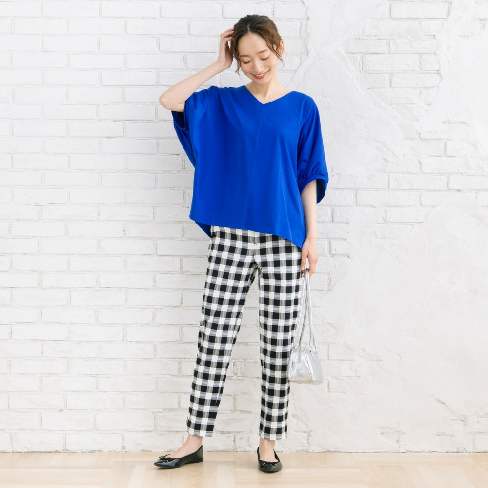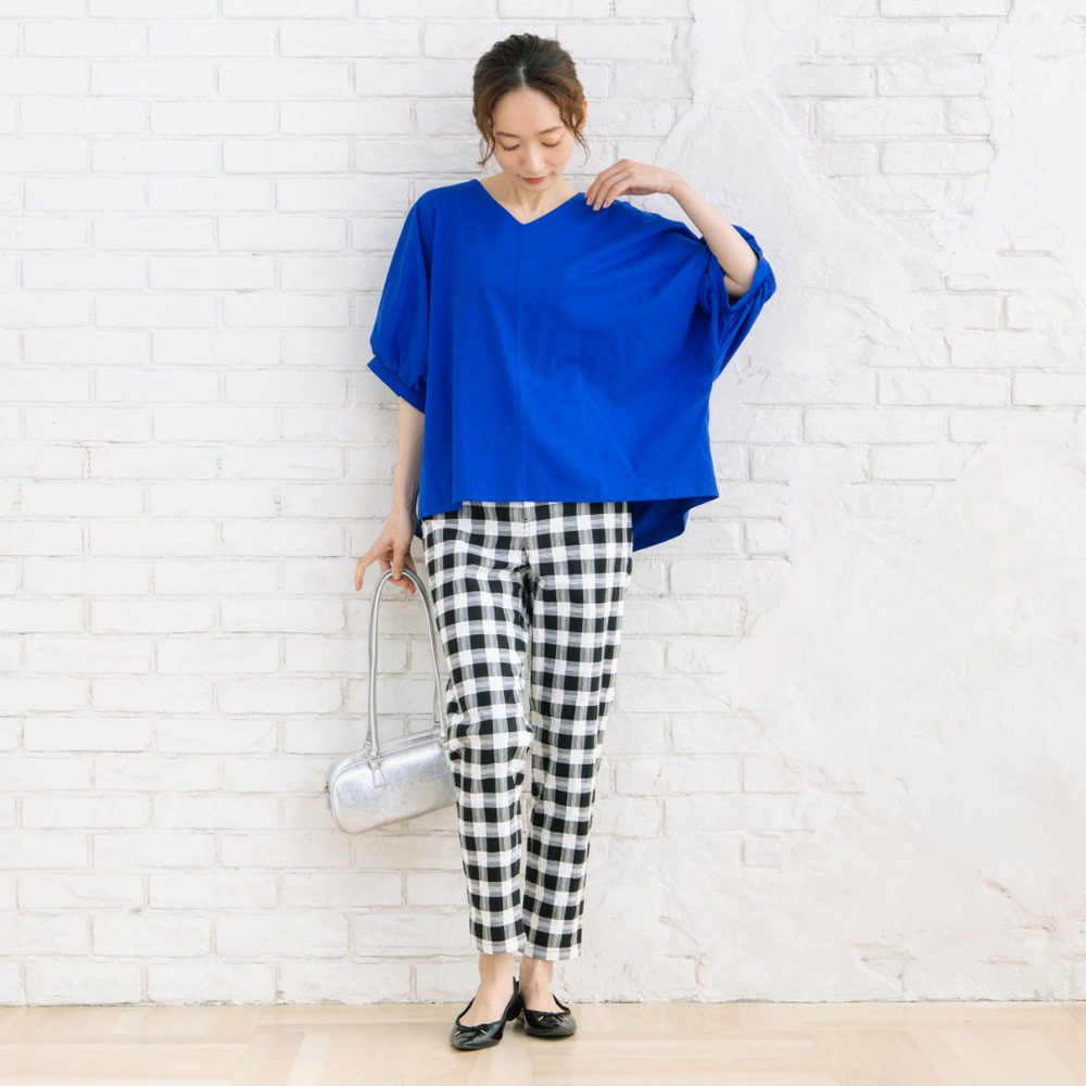 ドルマンスリーブとゆったりした身幅が体のラインを拾いにくく、リラックス感がありながらすっきり見えるのも魅力。