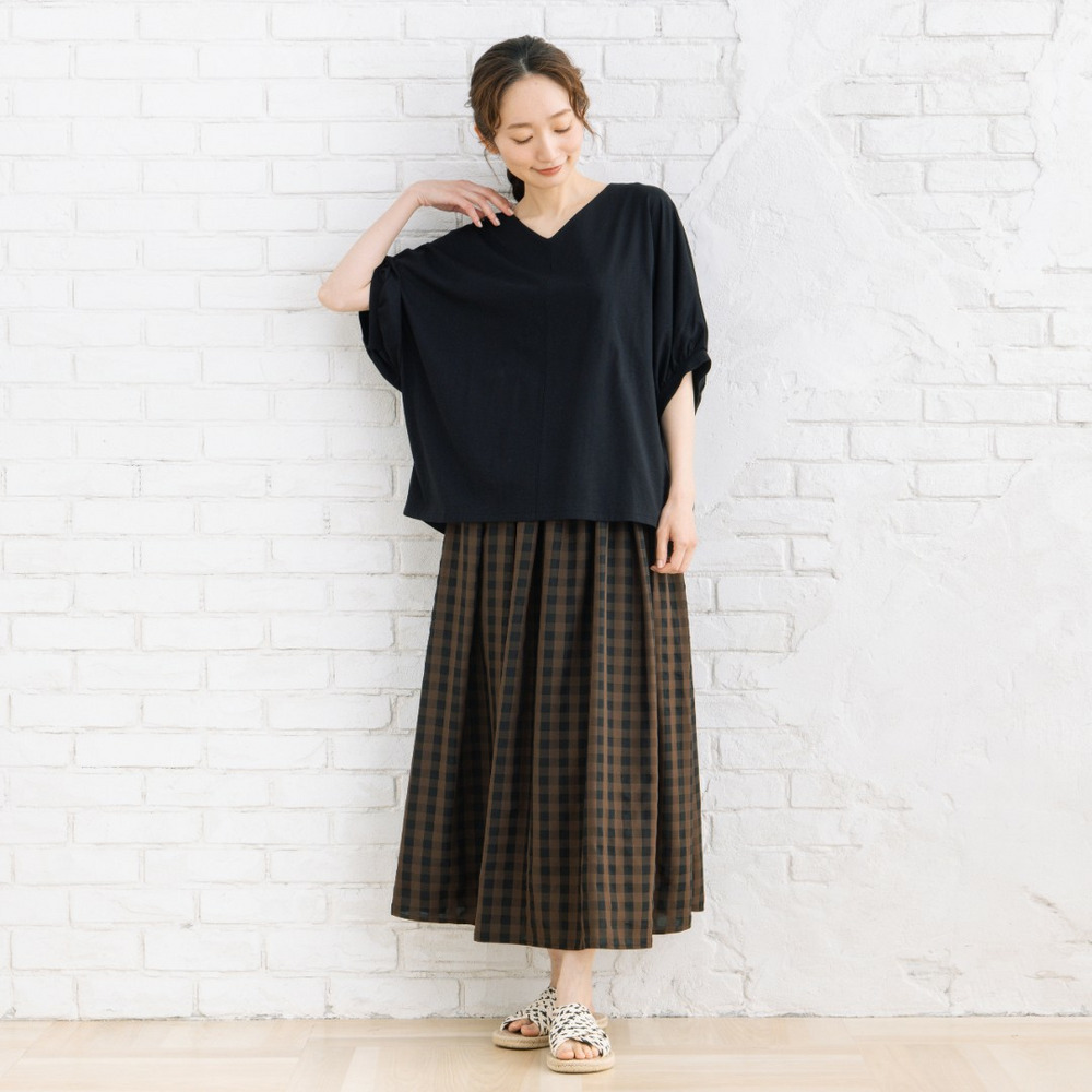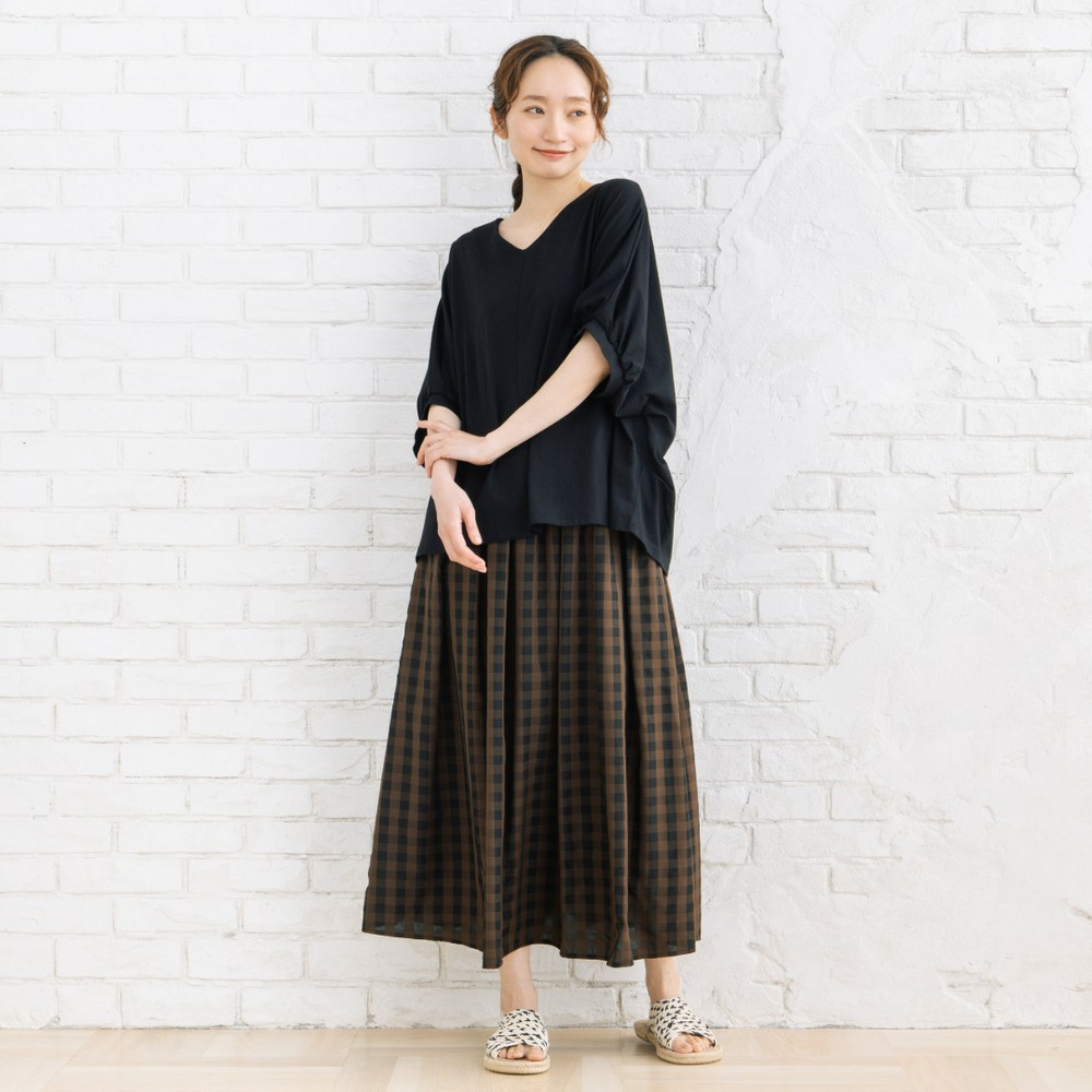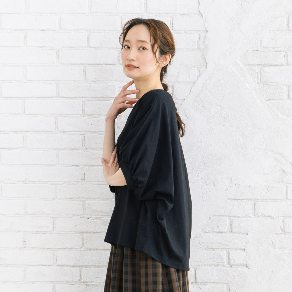 ドルマンスリーブとゆったりした身幅が体のラインを拾いにくく、リラックス感がありながらすっきり見えるのも魅力。